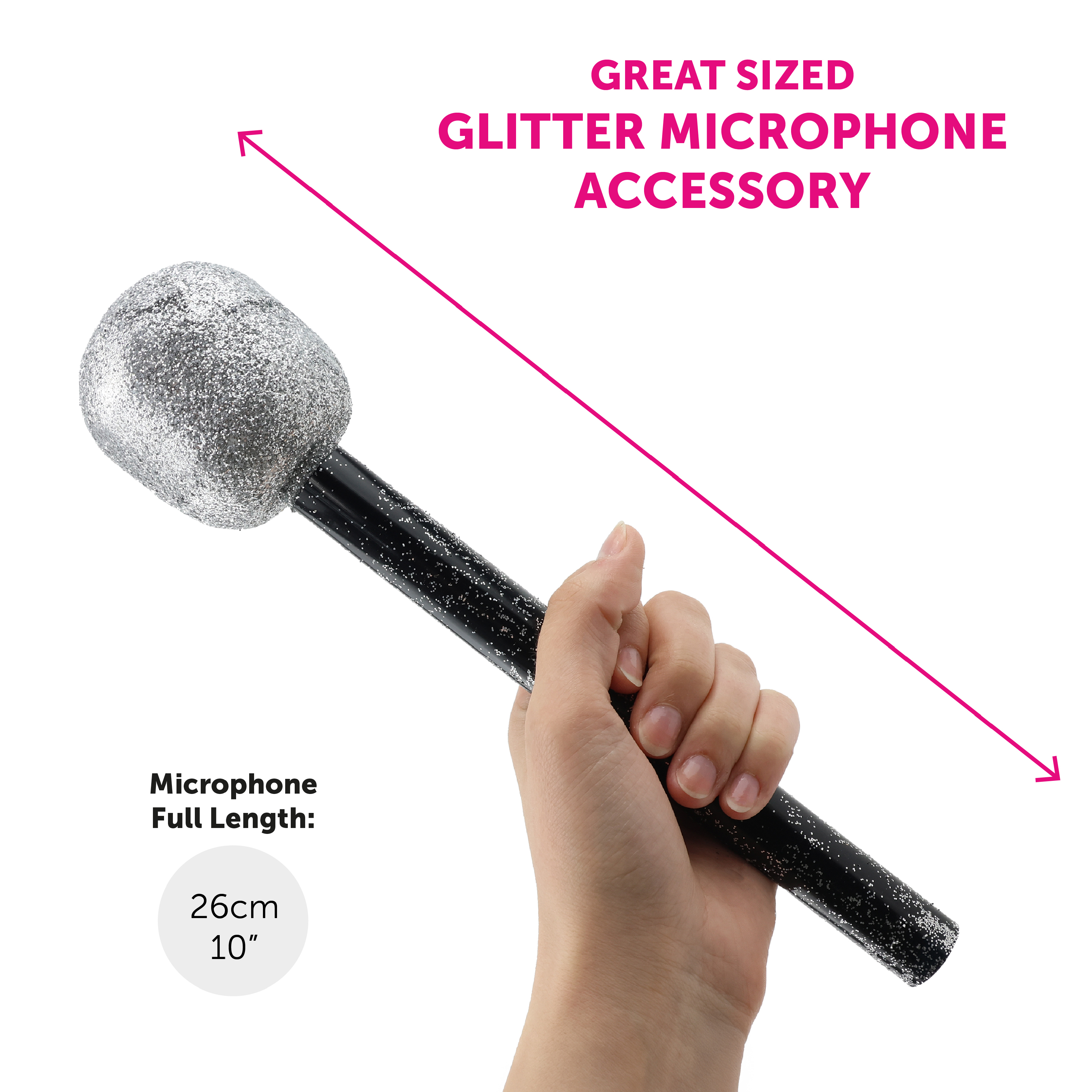 GREAT SIZED ACCESSORY: The Glitter Microphone is a great sized accessory, measuring a full length of 26cm (10") - the perfect addition to your 70's look!