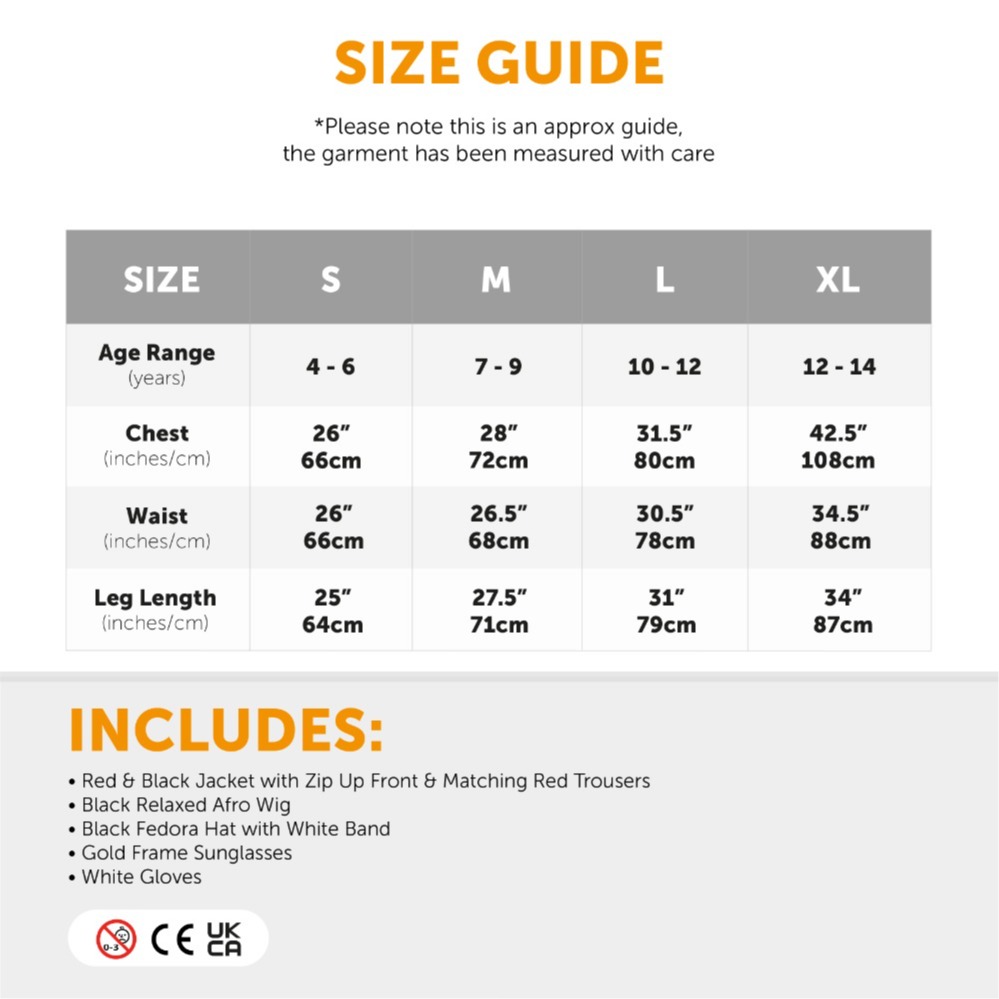 CHILD'S KING OF POP COSTUME: Moonwalk back into the 80s and into the spotlight with our Child's King of Pop Costume and be everyone’s favourite iconic pop star for your next fancy dress party! COSTUME DETAILS: Your King of Pop Costume includes a Red & Black Jacket and matching Trousers, a Relaxed Black Afro Wig, a Black Fedora Hat with a White Band, Sunglasses, a pair of White Gloves, and a Toy Microphone to complete the authentic pop star look! AVAILABLE IN MULTIPLE SIZES: Your Child's King of Pop Costume is available in multiple sizes from Small to X-Large: