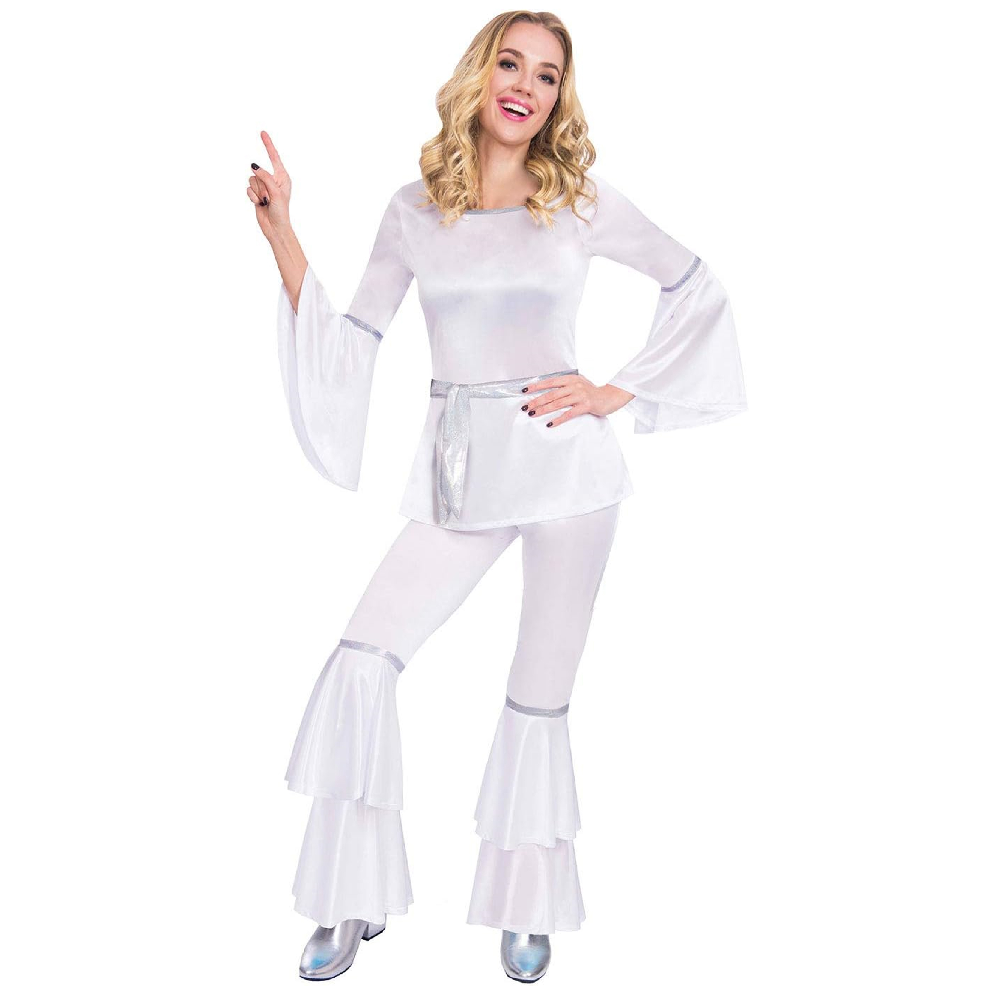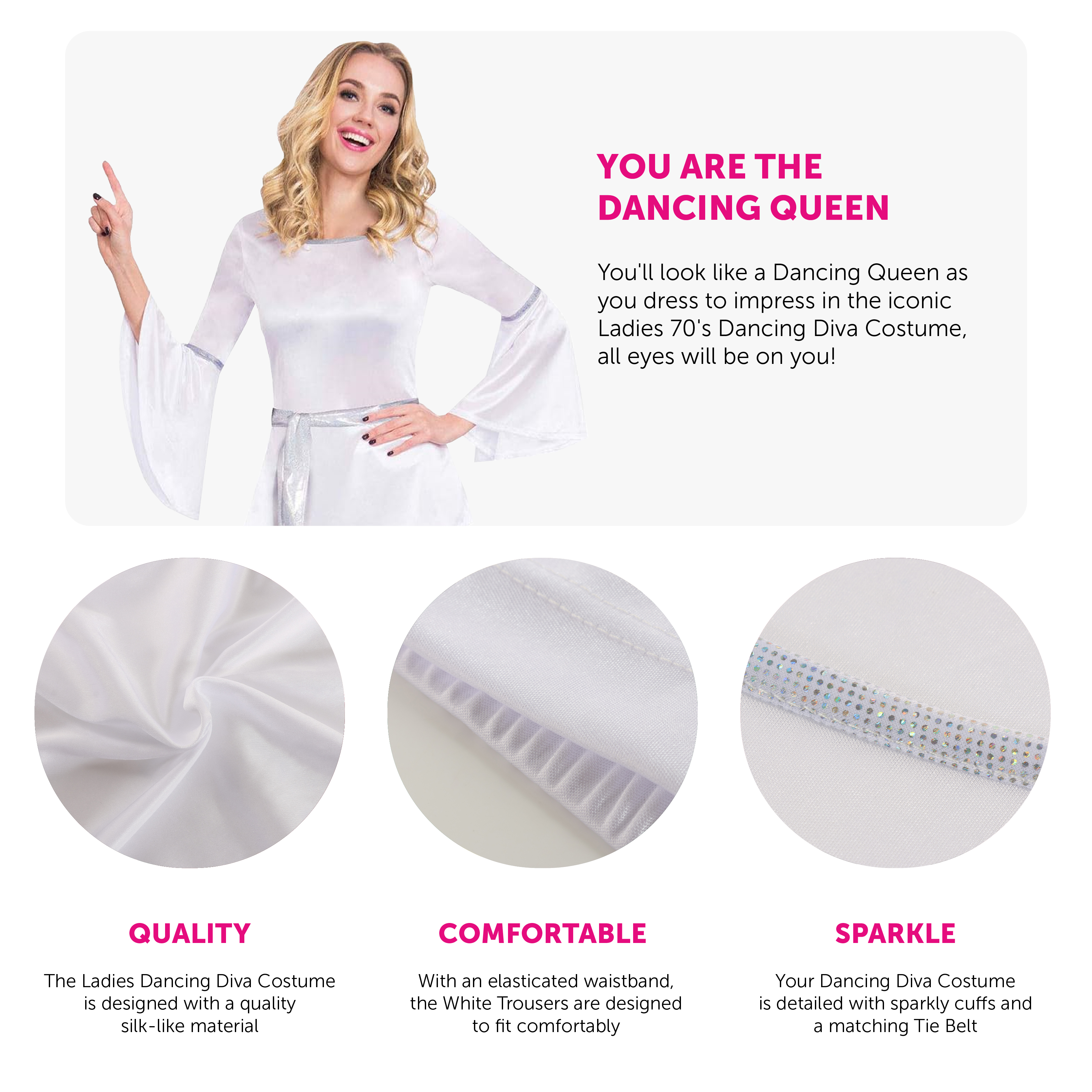 This dazzling Eurovision-ready outfit includes a long-sleeved white tunic top with dramatic flared cuffs and elegant silver trim detailing, matching white trousers with fabulous tiered flares, and a silver waist tie belt to complete your disco diva transformation. Inspired by the unforgettable glamour of 70s music legends, this look is made to shine on any stage.