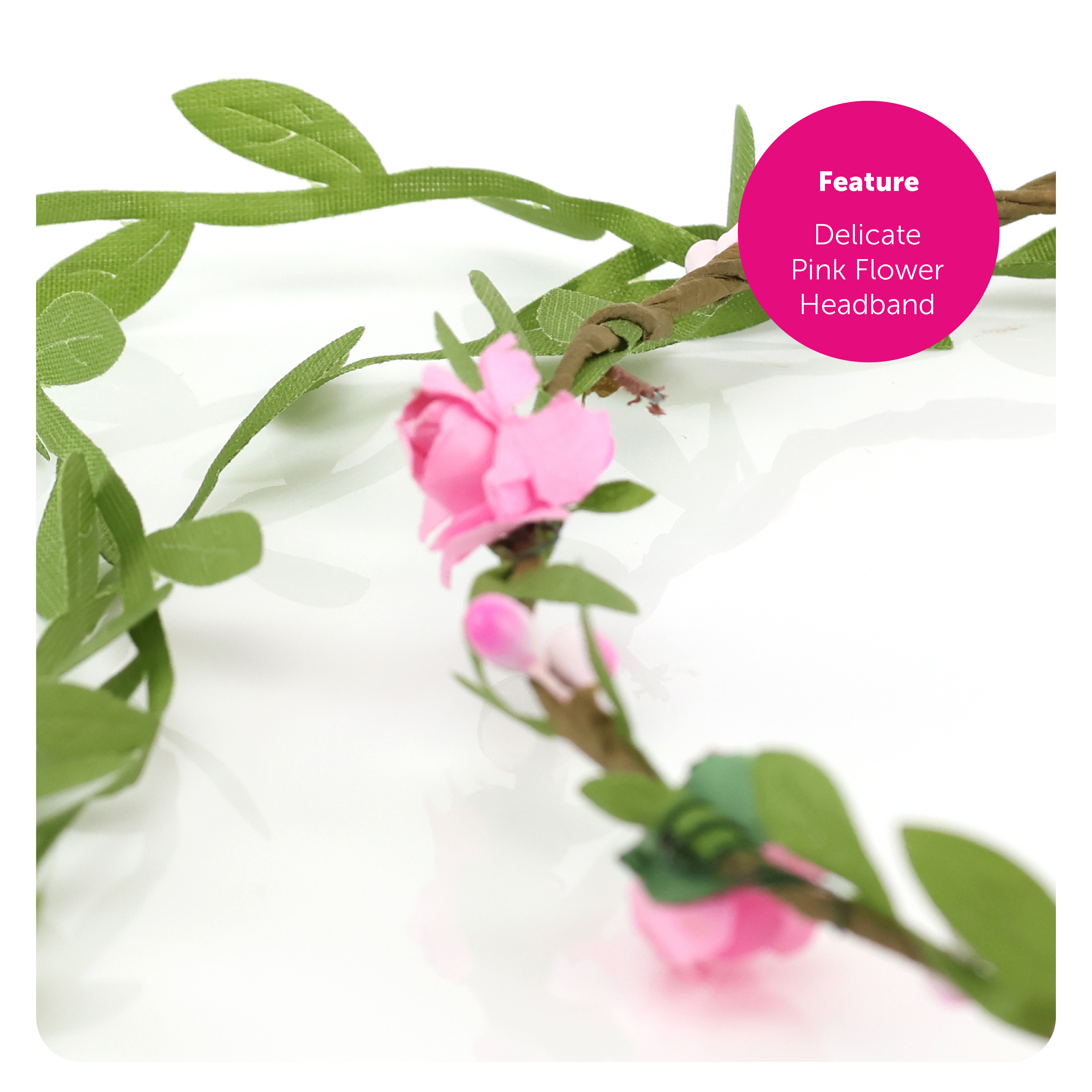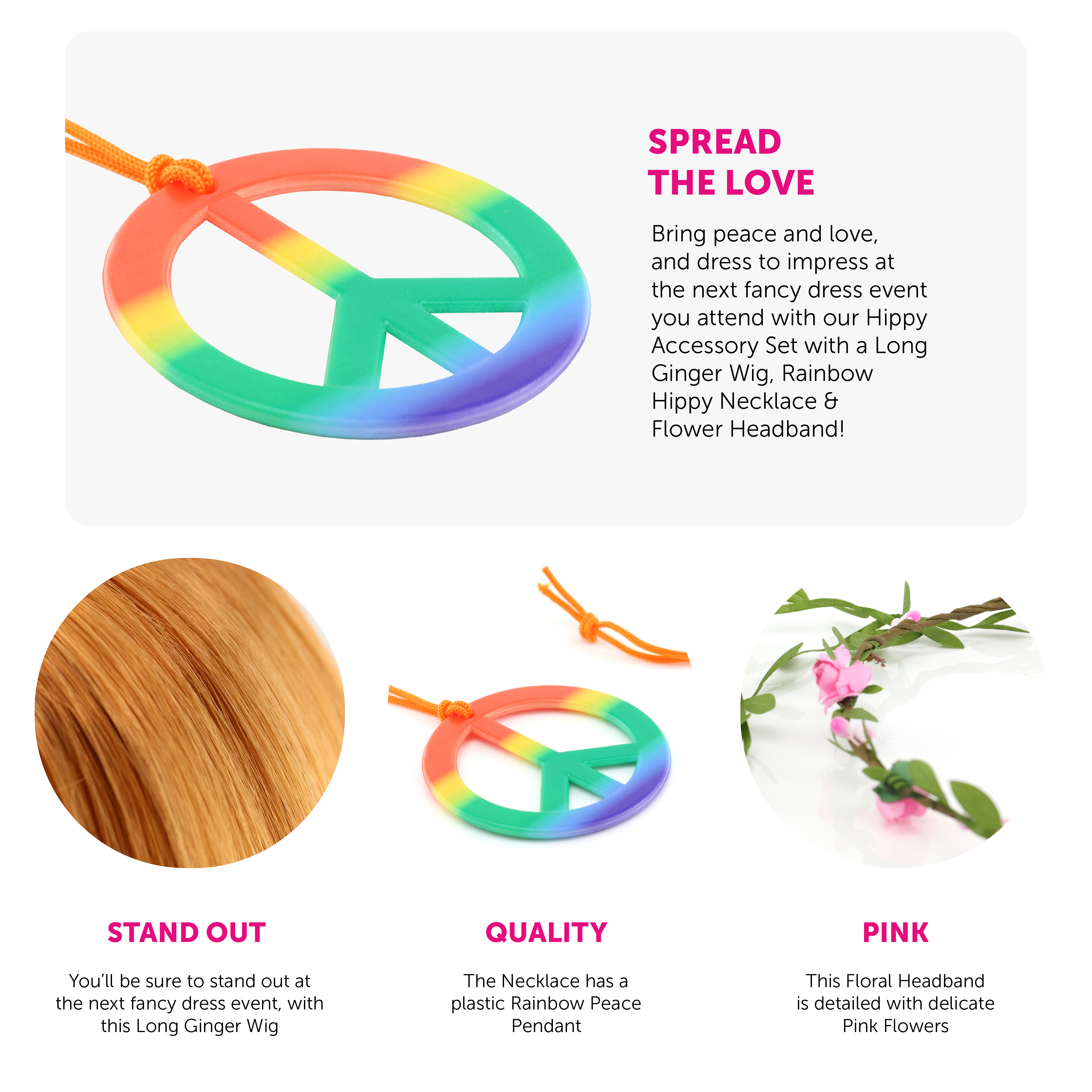 ACCESSORY SET INCLUDES: This Hippy Accessory Set includes a sleek Long Ginger Wig, an adjustable Necklace with a plastic Rainbow Peace Symbol pendant, and a Headband with delicate green leaf vines and Pink Flower detail, the perfect accessories to add to your Hippy Outfit!