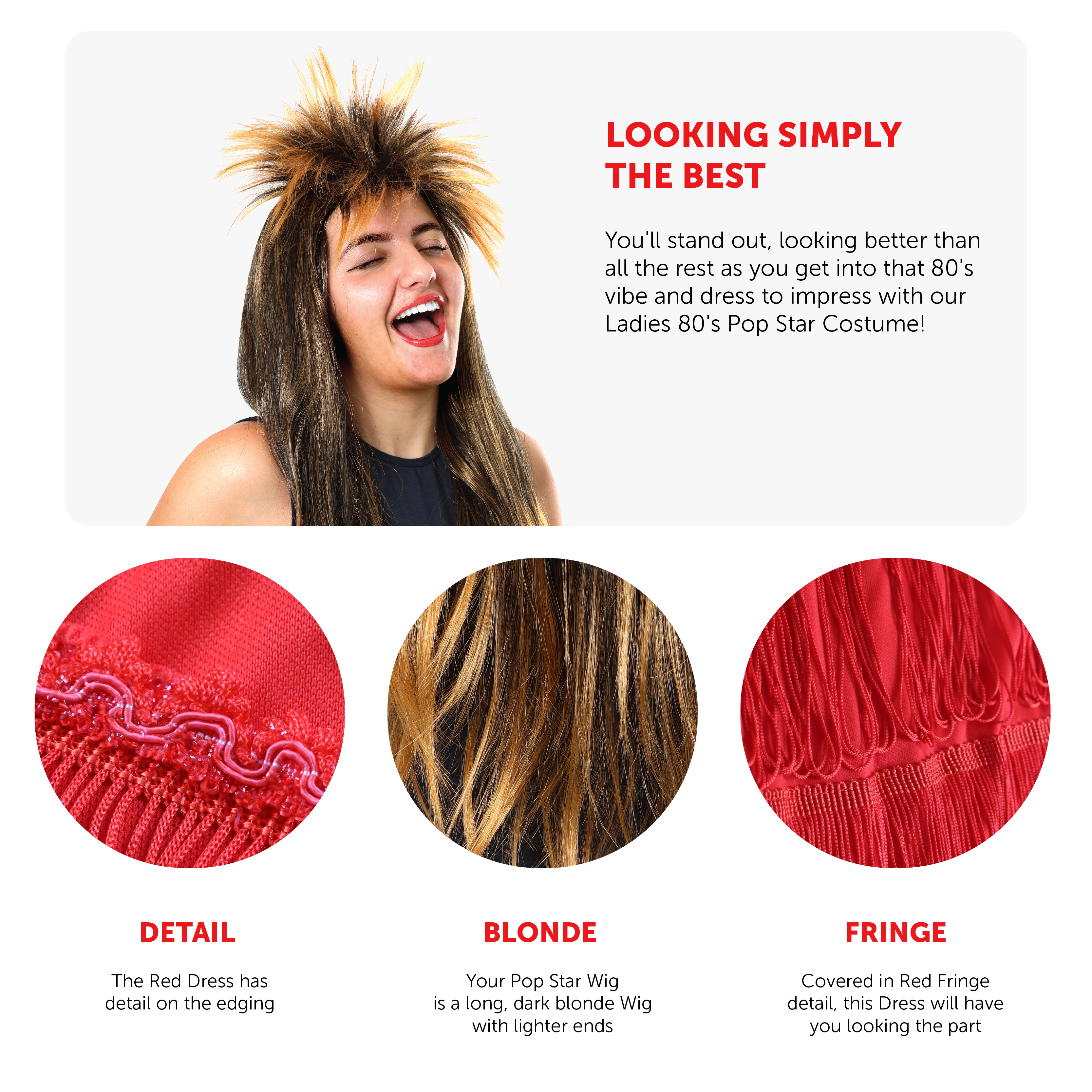 POP STAR COSTUME DETAILS: Your Ladies 80's Pop Star Costume includes a vibrant Red Dress with fringing on the front and back and a retro style, long, dark blonde Wig with a shorter straight hair on top - a perfect outfit for the next 80's themed party!