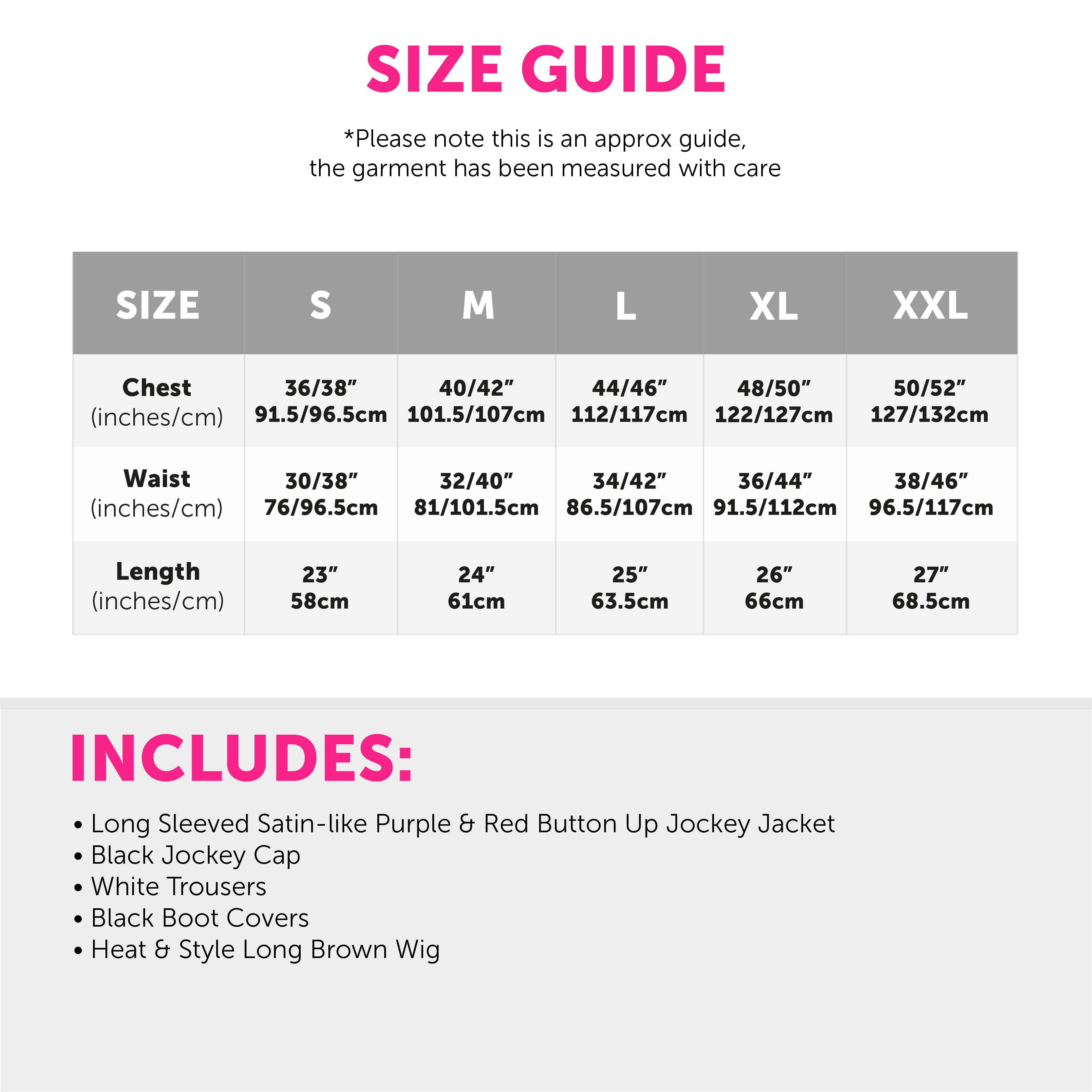 AVAILABLE IN MULTIPLE SIZES: Our Adults Purple & Red Jockey Costume is available in multiple sizes from Small – XX-Large: Small - Chest 36/38" (91.5/96.5cm), Waist 30/38", Length 23" (58cm) | Medium - Chest 40/42" (101.5/107cm), Waist 32/40" (81/101.5cm), Length 24" (61cm) | Large - Chest 44/46” (112/117cm), Waist 34/42" (86.5/107cm), Length 25” (63.5cm) | X-Large - Chest 48/50” (122/127cm), Waist 36/44" (91.5/112cm), Length 26” (66cm) | XX-Large - Chest 50/52” (127/132cm), Waist 38/46" (96.5/117cm), Length 27” (68.5cm)