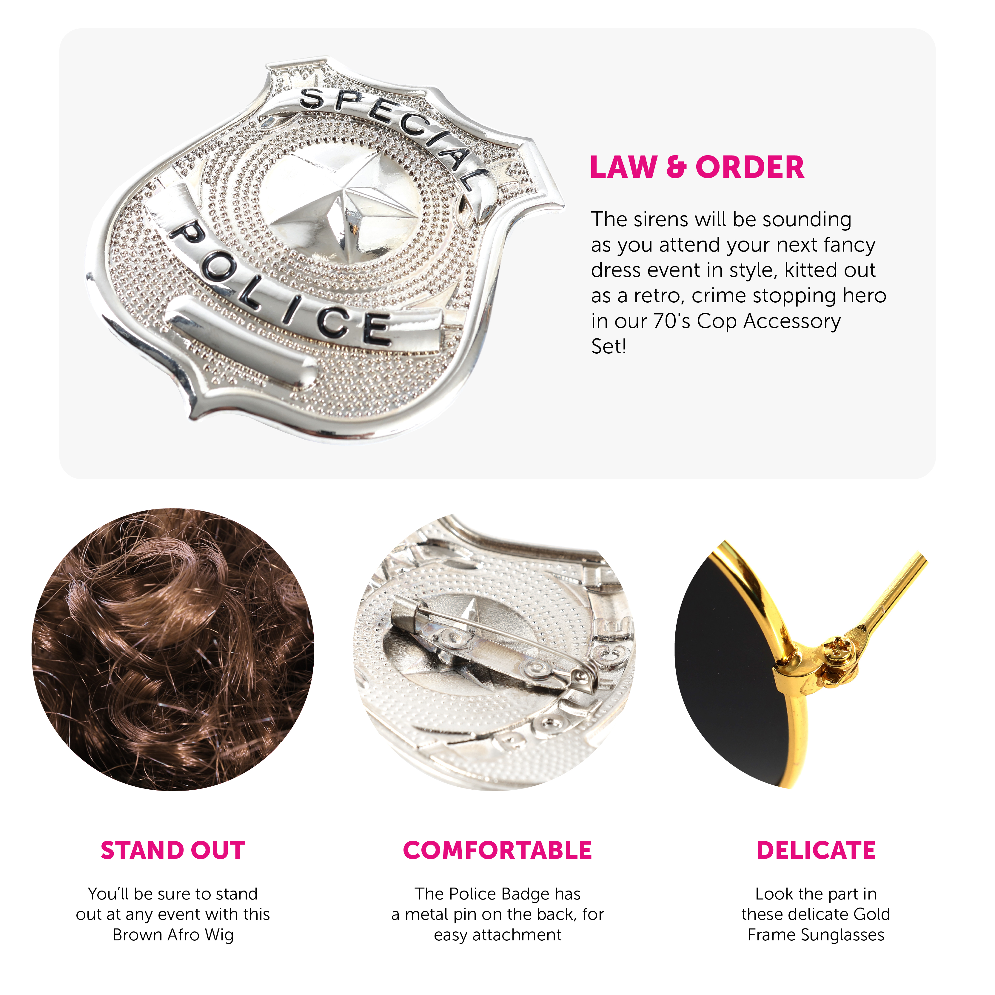 COP SET INCLUDES: Your 70's Cop Accessory Set includes a Brown Afro Wig, an Adhesive Brown Moustache, Sunglasses, 2x Fake Cigarettes, and a Silver Metal Police Badge with a pin for easy attachment, the perfect accessory set to add to your Fancy Dress Costume!