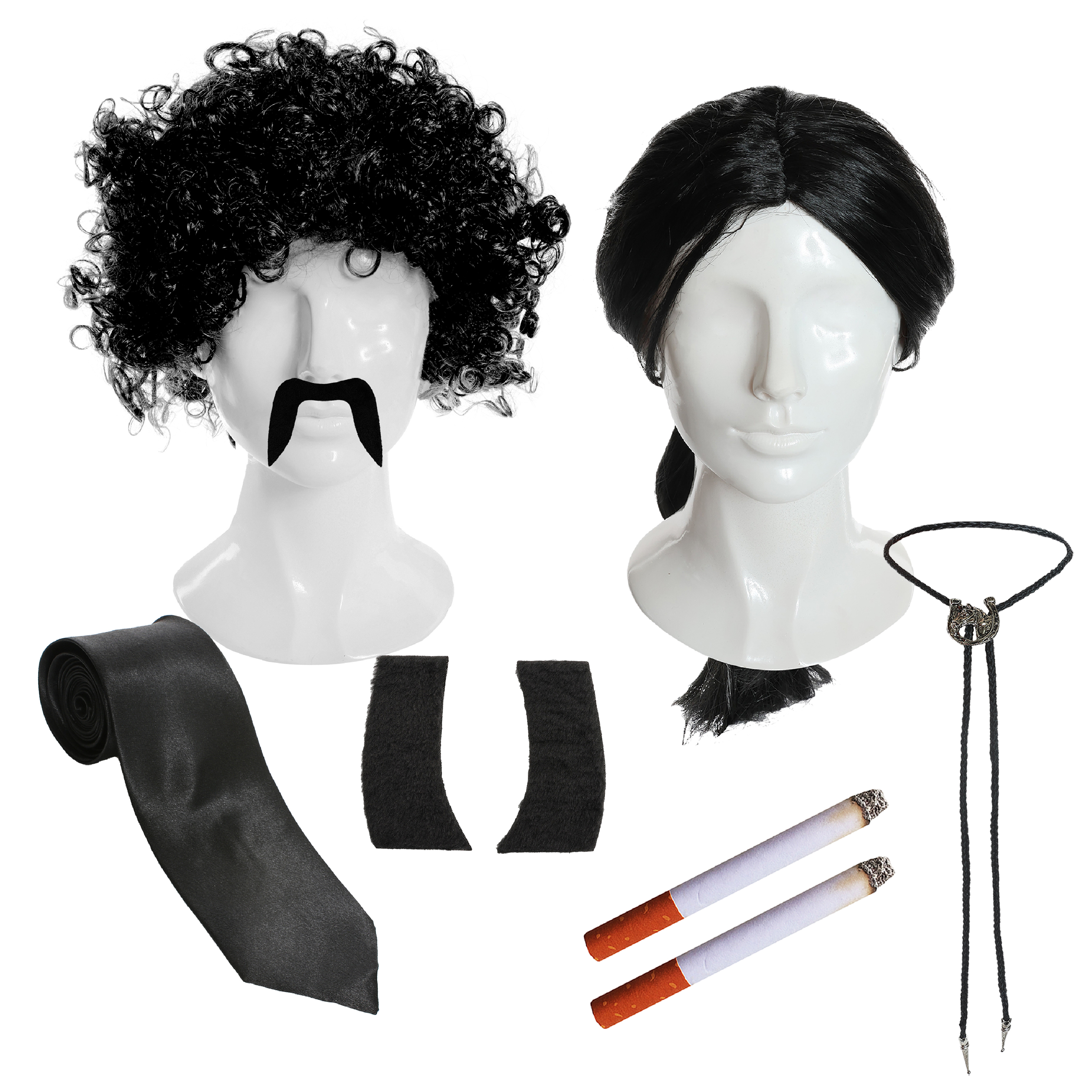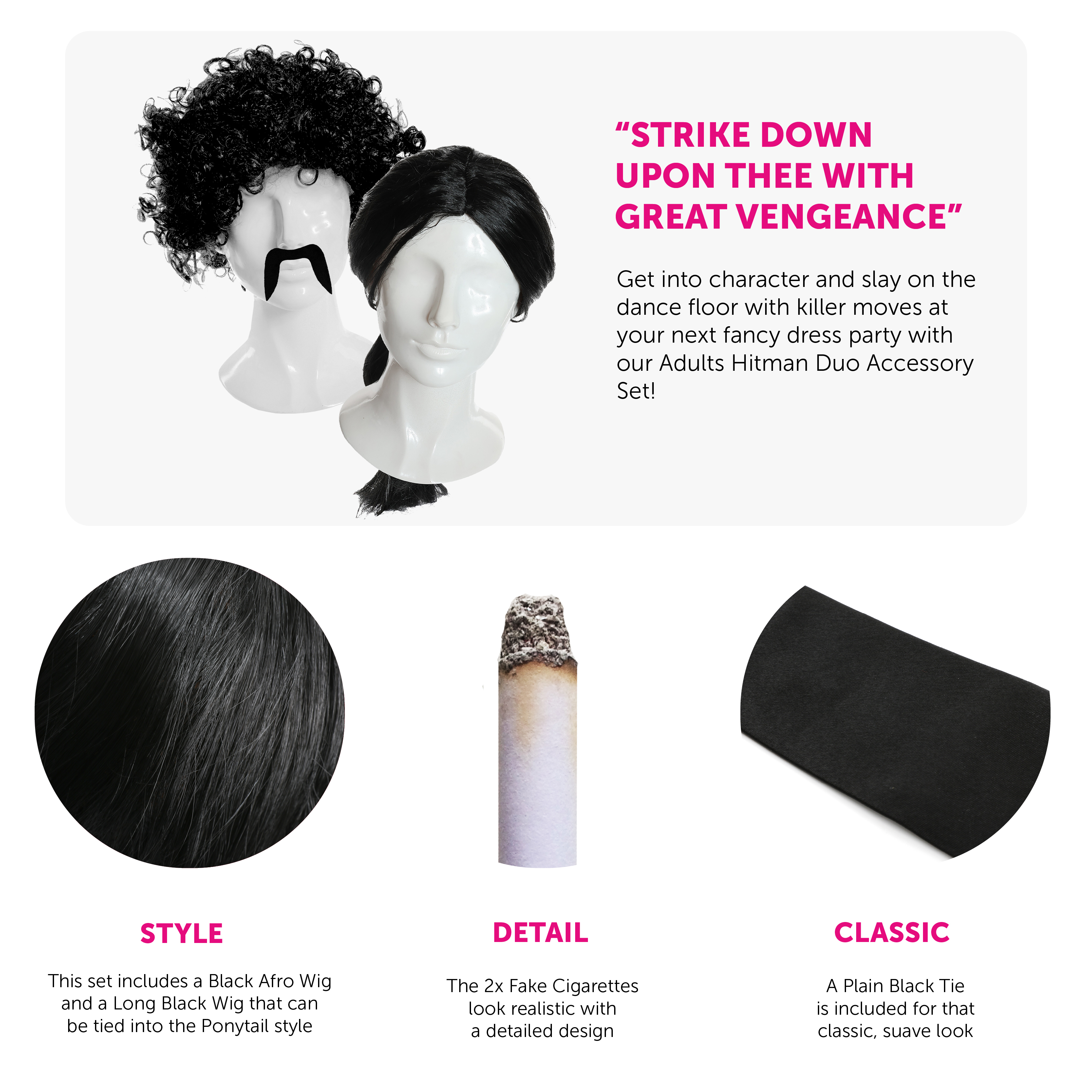 ACCESSORY SET INCLUDES: Your Adults Hitman Duo Accessory Set includes a Black Afro Wig, a Black Satin Necktie, Adhesive Black Sideburns, an Adhesive Black 70's Style Moustache, a long Black Wig that can be tied back into a Ponytail, a Pack of 2 Fake Cigarettes and a Black Bootlace Tie!