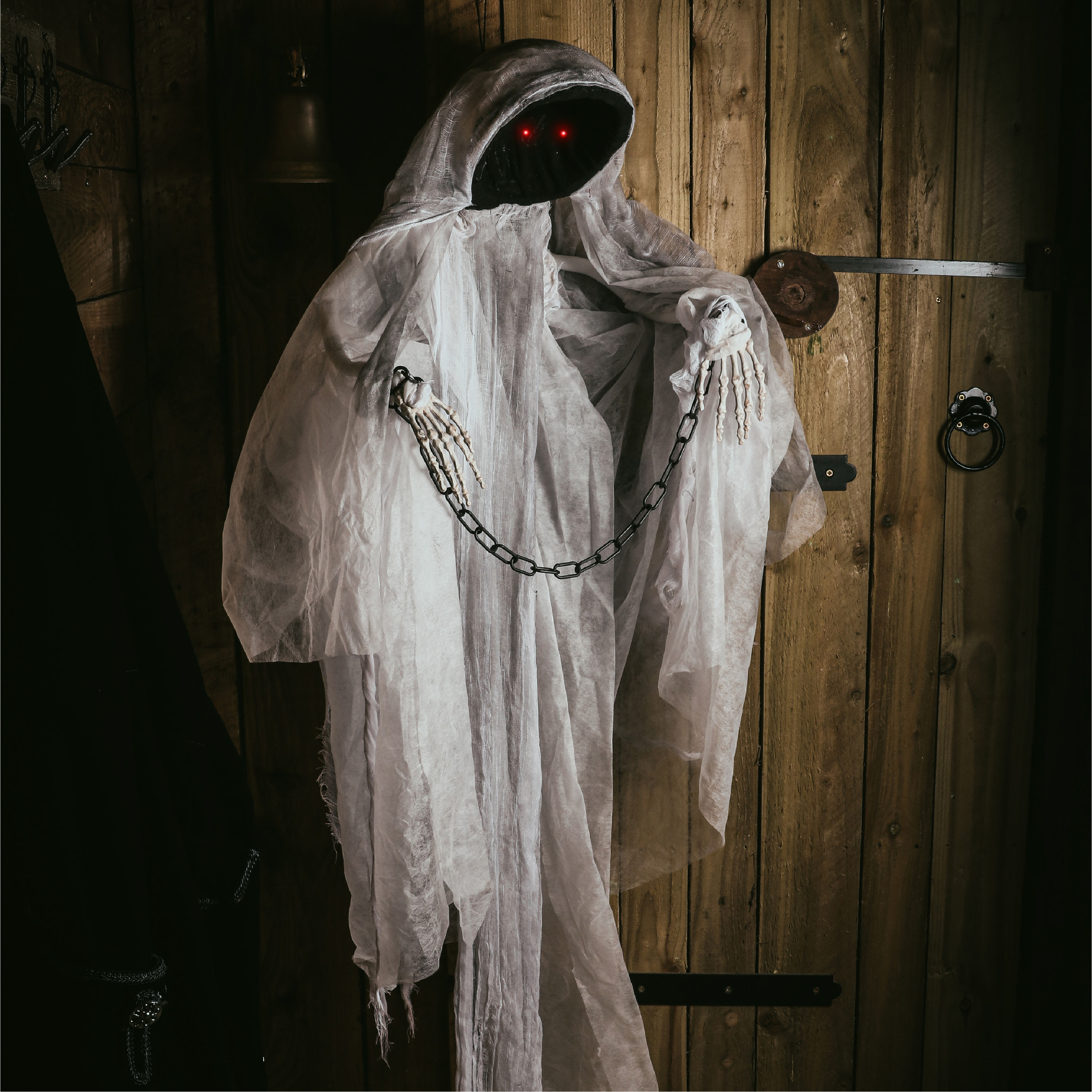 FACELESS GHOST DECORATION FEATURES: Your Faceless Scary Ghost animatronic is a sound-activated decoration, with flashing red eyes, motorised moving head, and arms, and makes haunted ghost sound effects! 3AA Batteries are Included!
