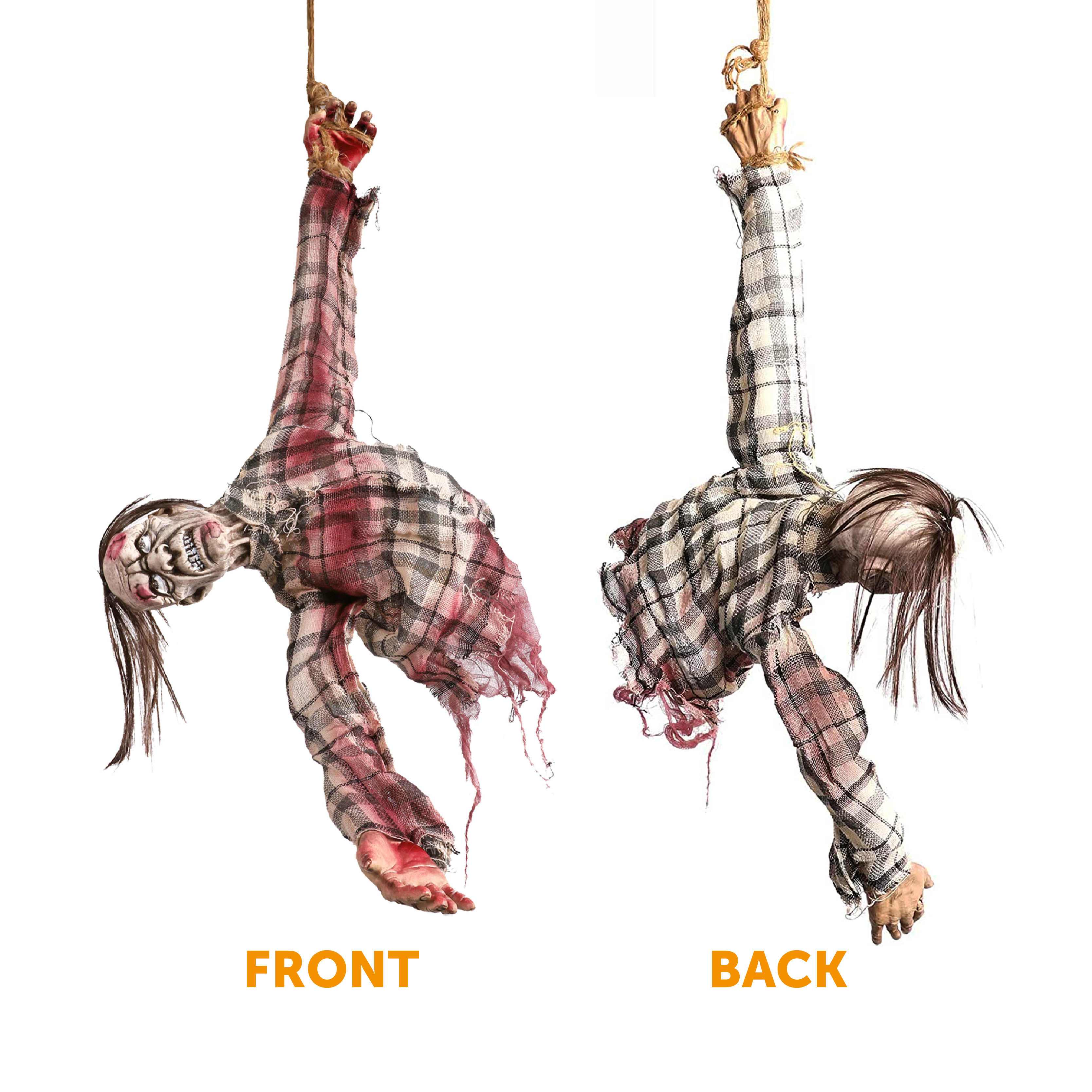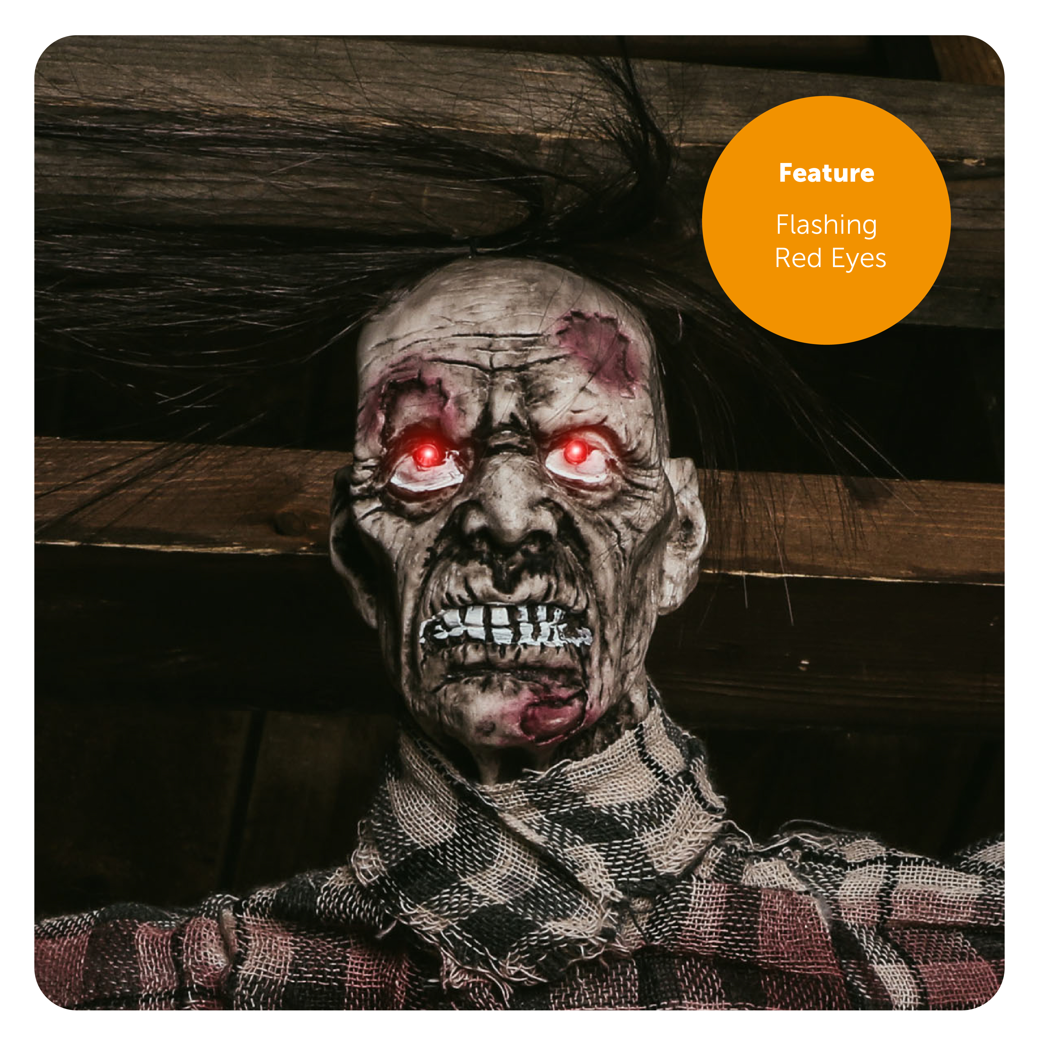 HANGING ZOMBIE DECORATION FEATURES: Your Hanging Scary Zombie animatronic is a sound-activated decoration, with flashing red eyes and plays creepy groaning sounds to unease your visitors! Included with 3AA Batteries!