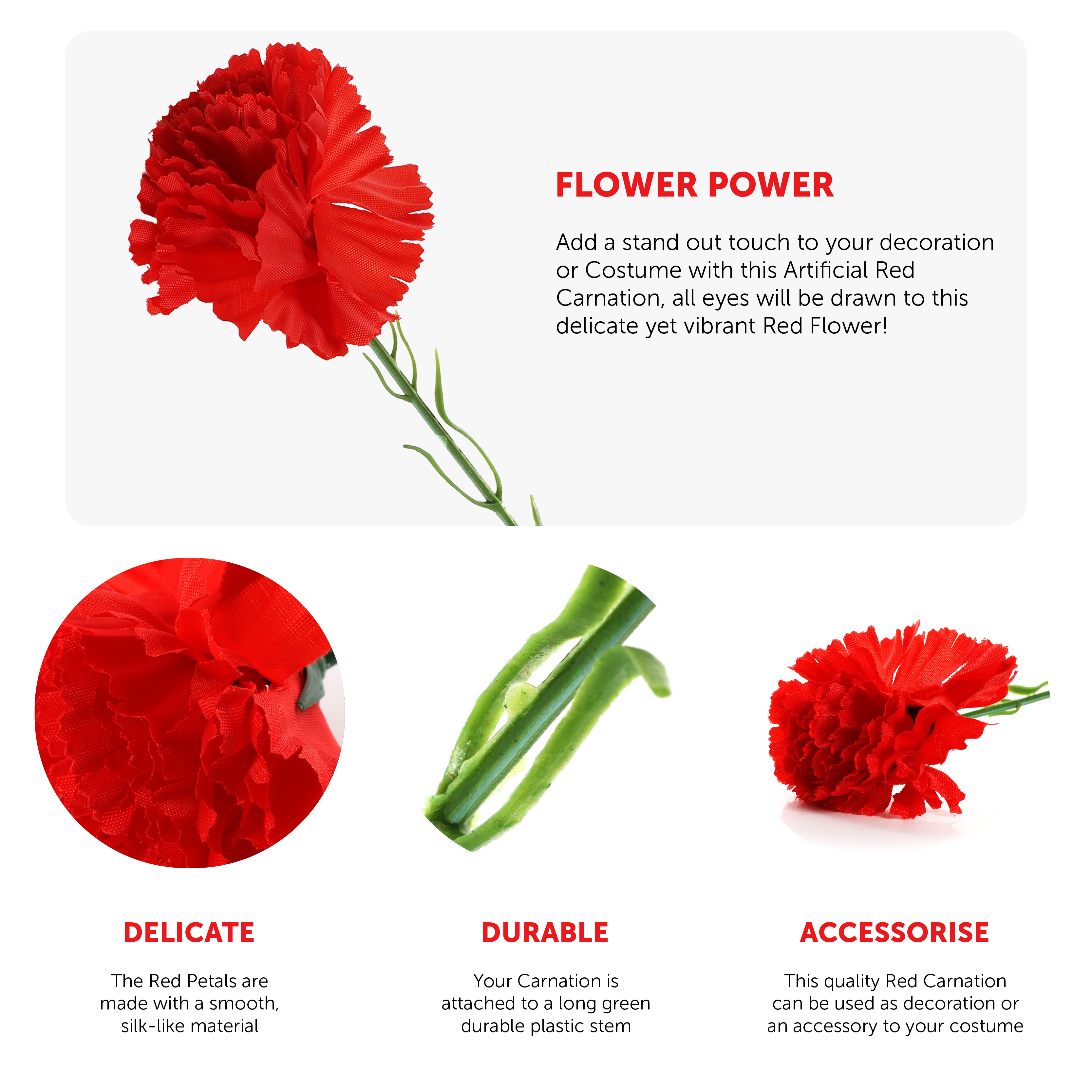 PERFECT FOR DECORATION AND FANCY DRESS: Whether you're decorating your abode for a special event, or you are looking for a statement accessory to accompany your Costume, then this Artificial Red Carnation Flower is the perfect addition!