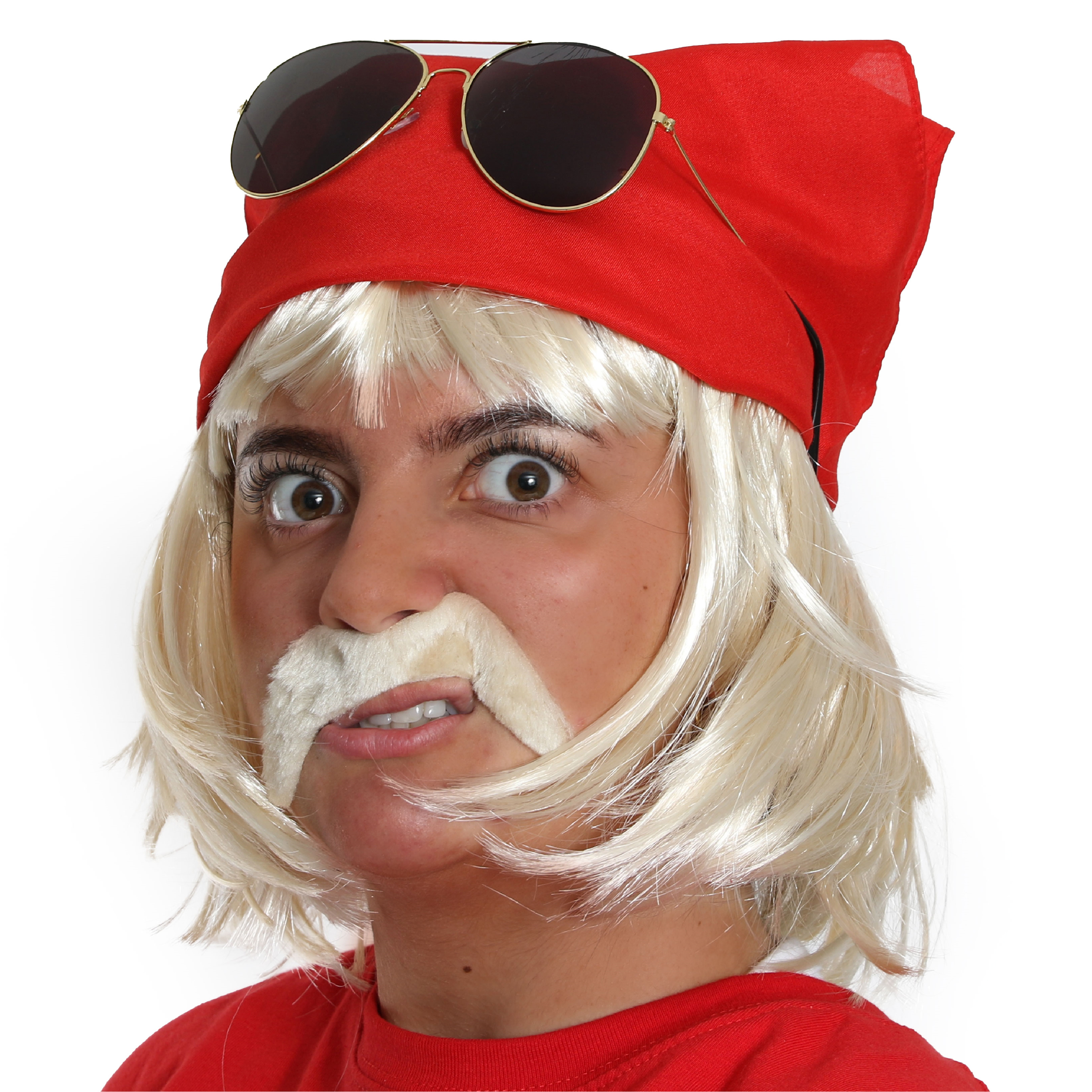 QUALITY ACCESSORIES: Look the part whilst wearing some quality made accessories! The self adhesive Blonde Moustache is extremely easy to apply and the Blonde Bob Wig will look sleek under the vibrant Red Bandana, which can be adjusted to fit any size!