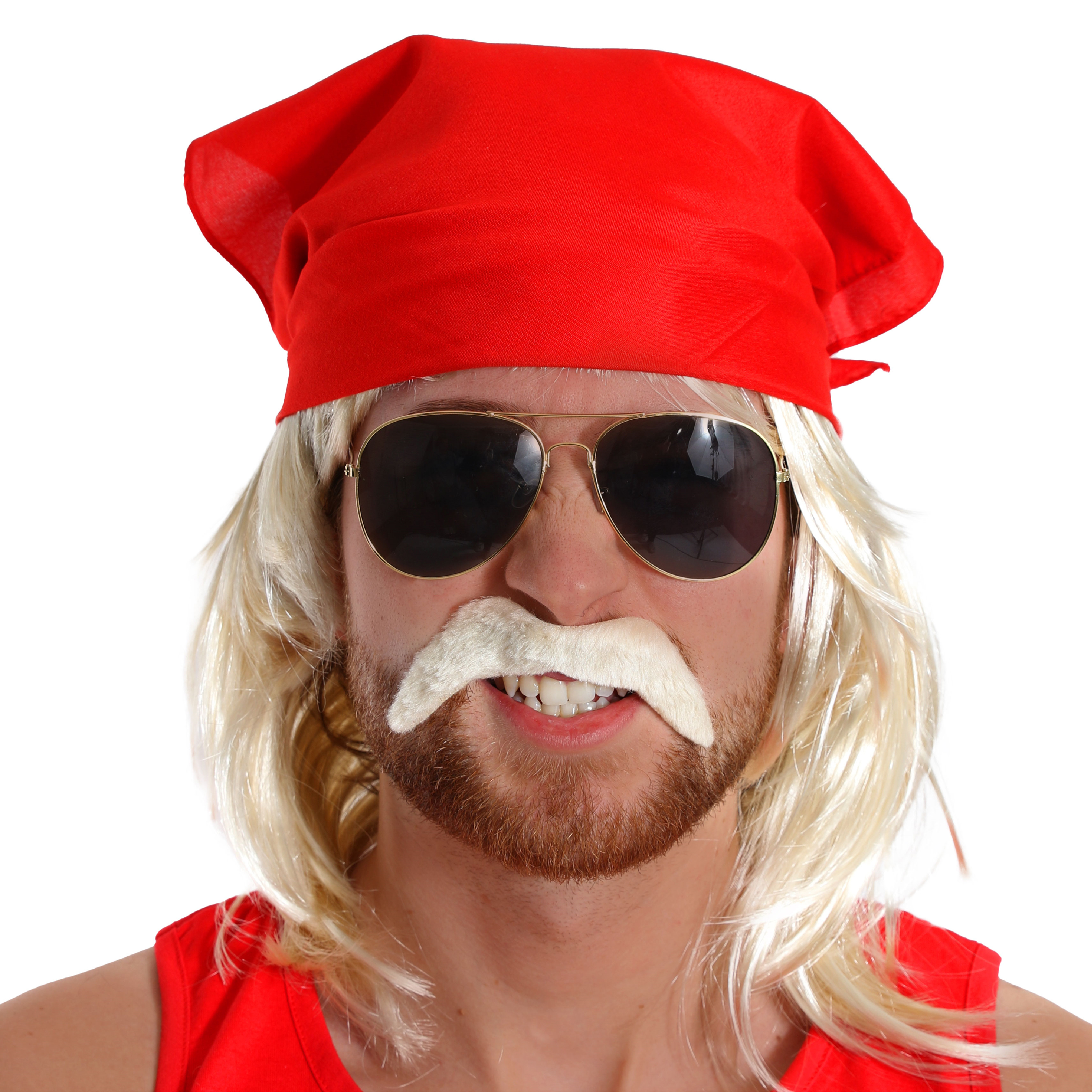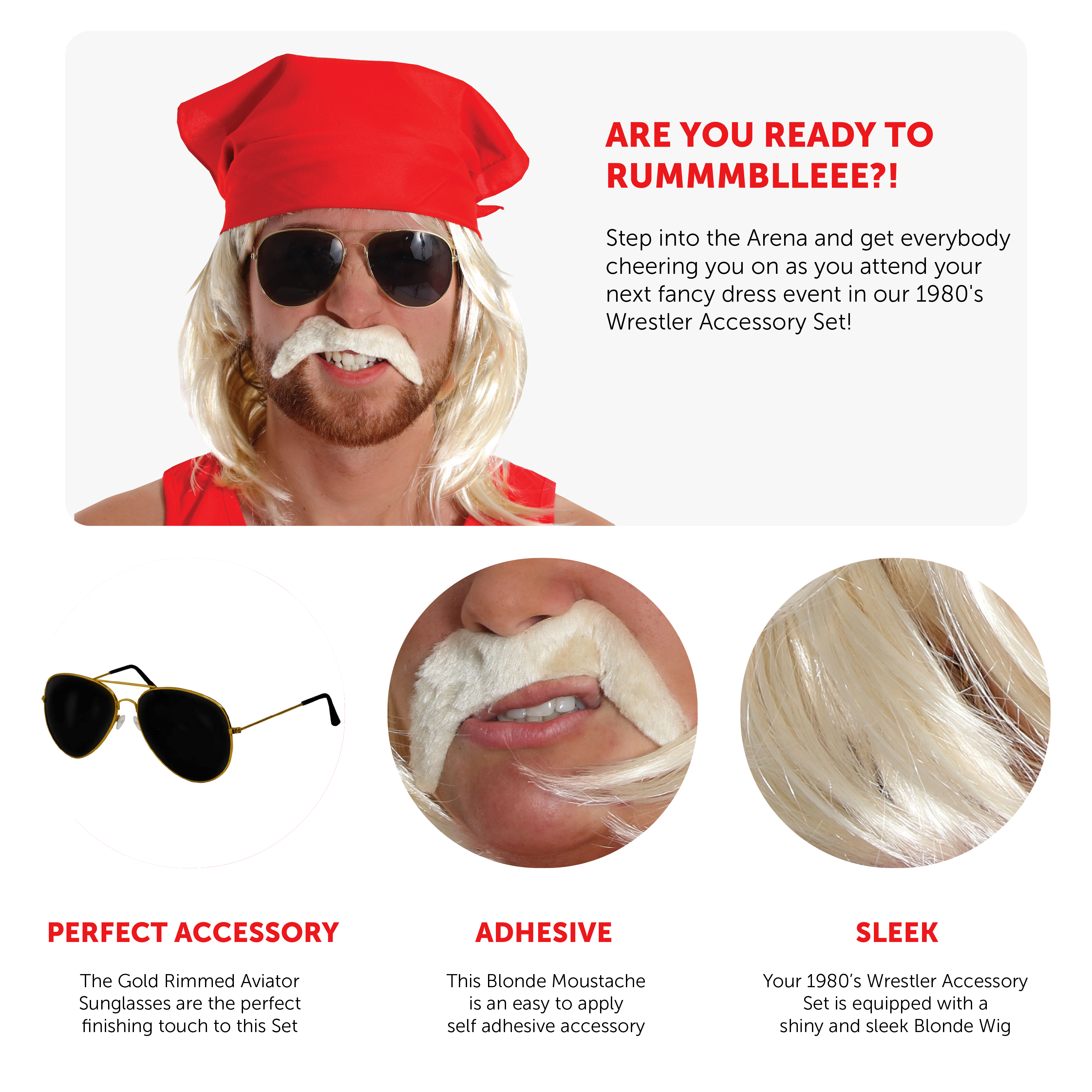 ACCESSORY SET INCLUDES: This 1980's Wrestler Accessory Set includes a vibrant Red Bandana, which can be adjusted to fit any sized head, an easy to apply self adhesive Blonde Moustache, a pair of Gold Rimmed Aviator Sunglasses and a Blonde Bob Wig to help you finish off your desired look!