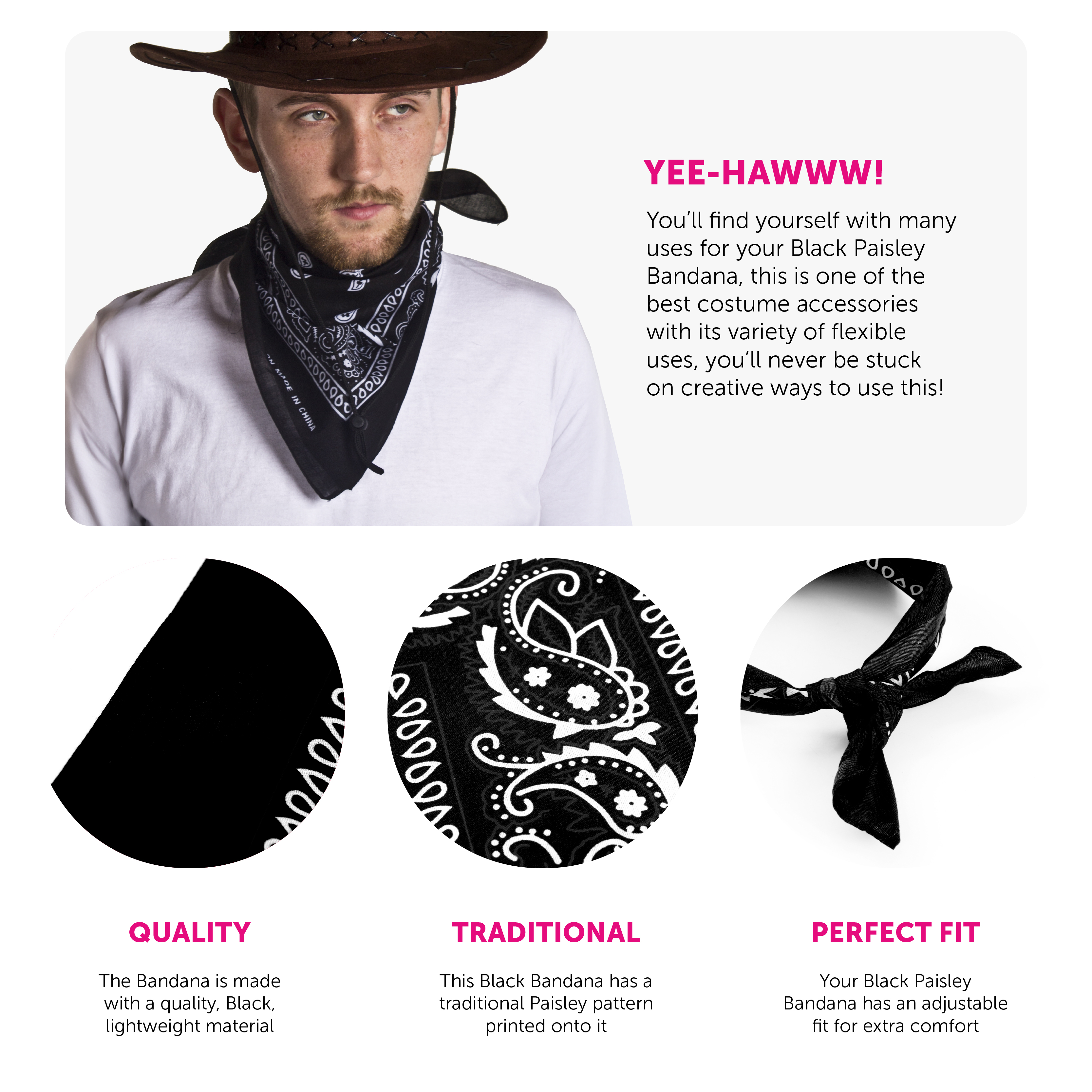 PERFECT FOR ANY FANCY DRESS COSTUME: Whether you’re dressing up as a wild western cowboy, a hard rocking biker on the road or any other fantastic costume you have ready, you’ll make it shine through with your Black Paisley Bandana!