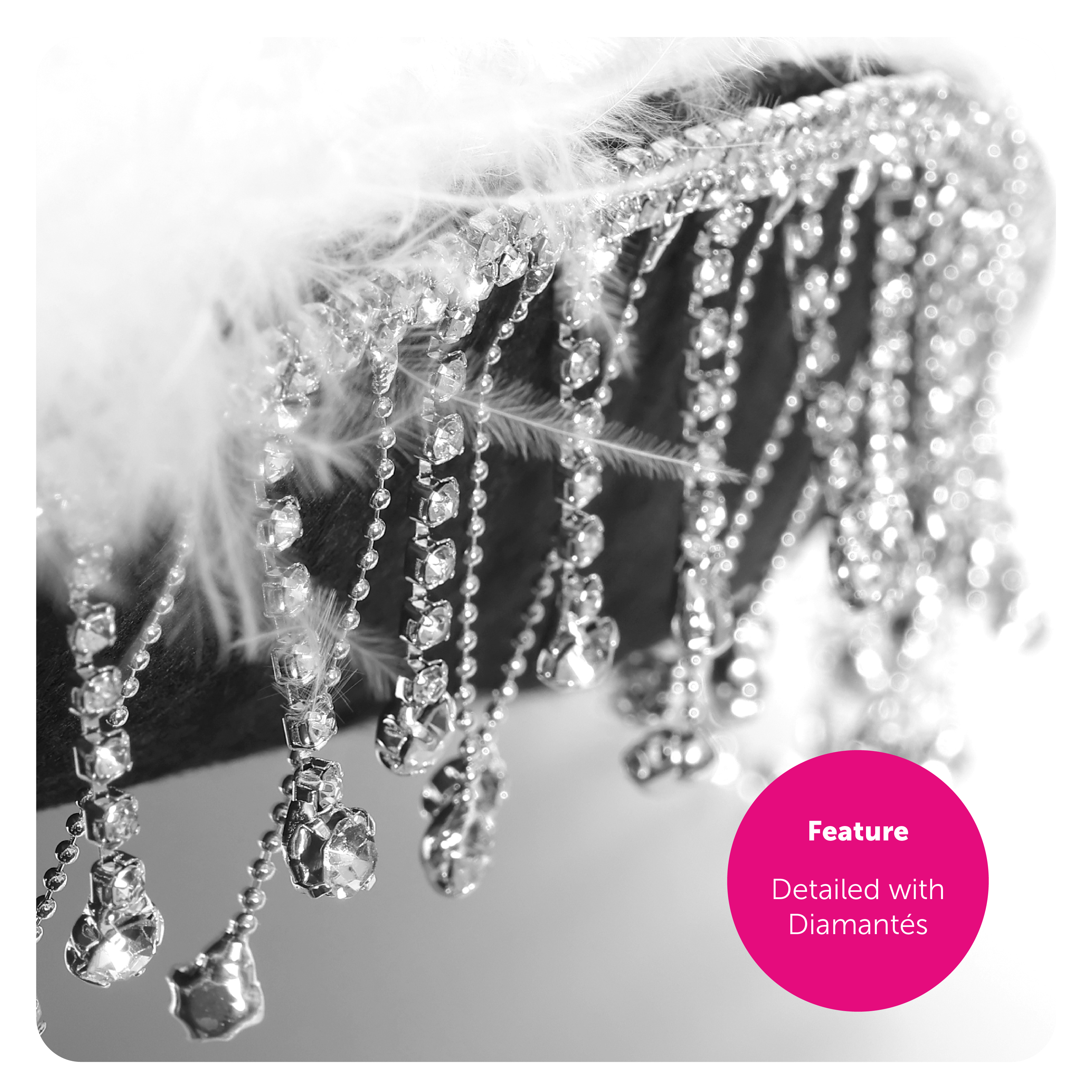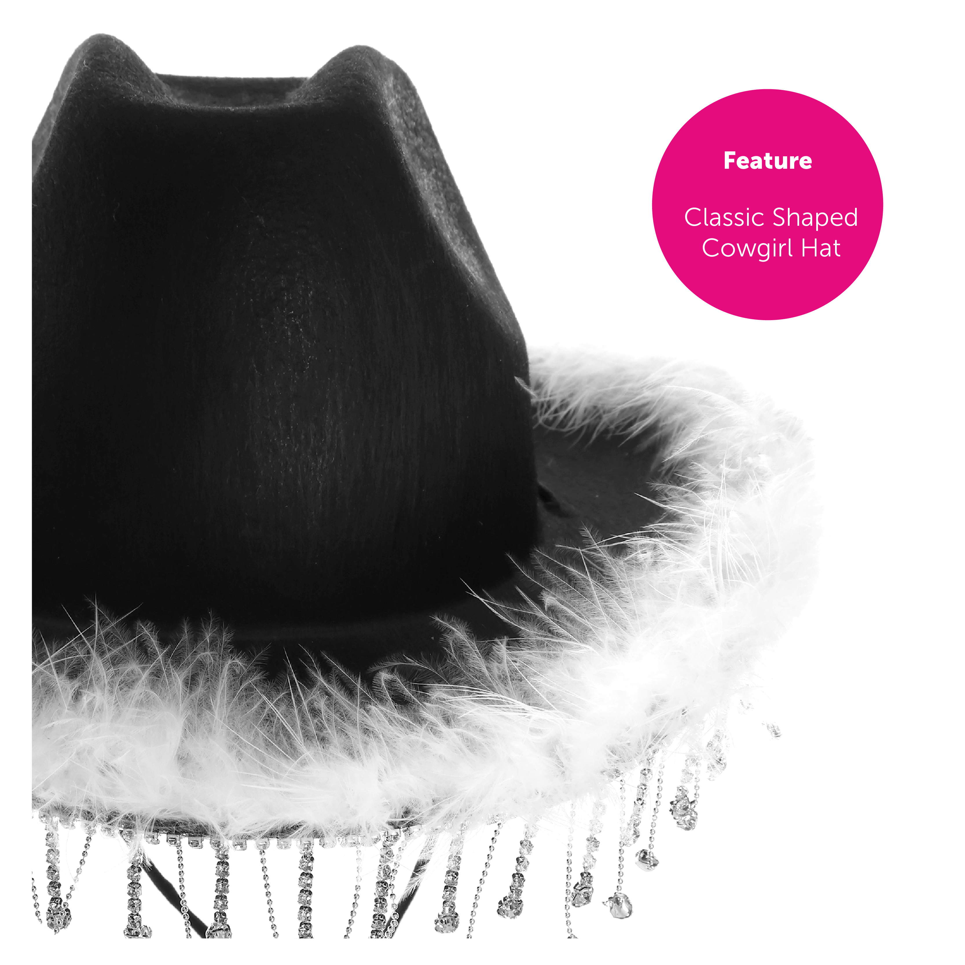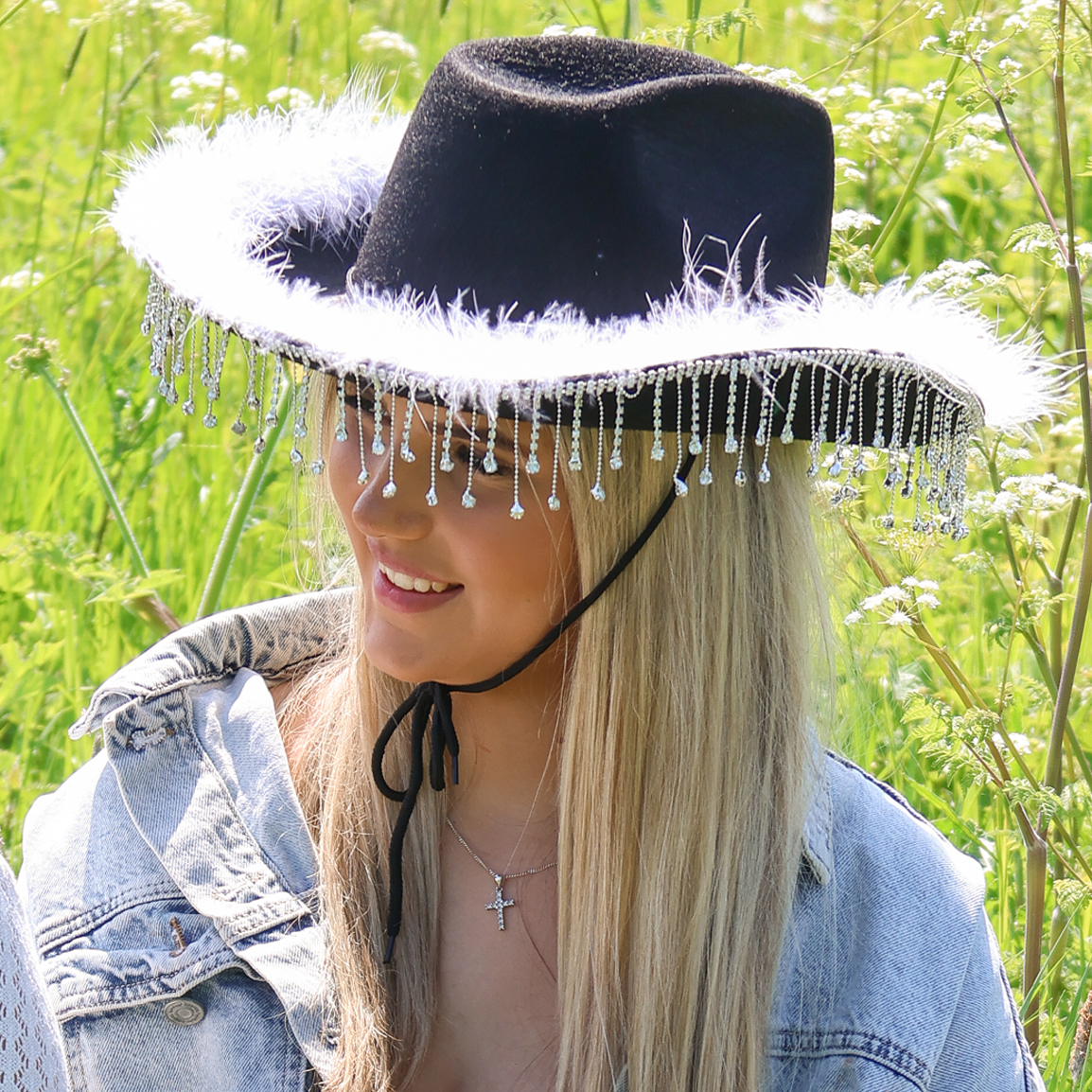 COWGIRL HAT DETAILS: This Cowgirl Hat is a Black tone, with a fluffy, White Marabou Feather detail and Diamantes around the brim and an adjustable black string for extra comfort, the perfect way to finish off your outfit!
