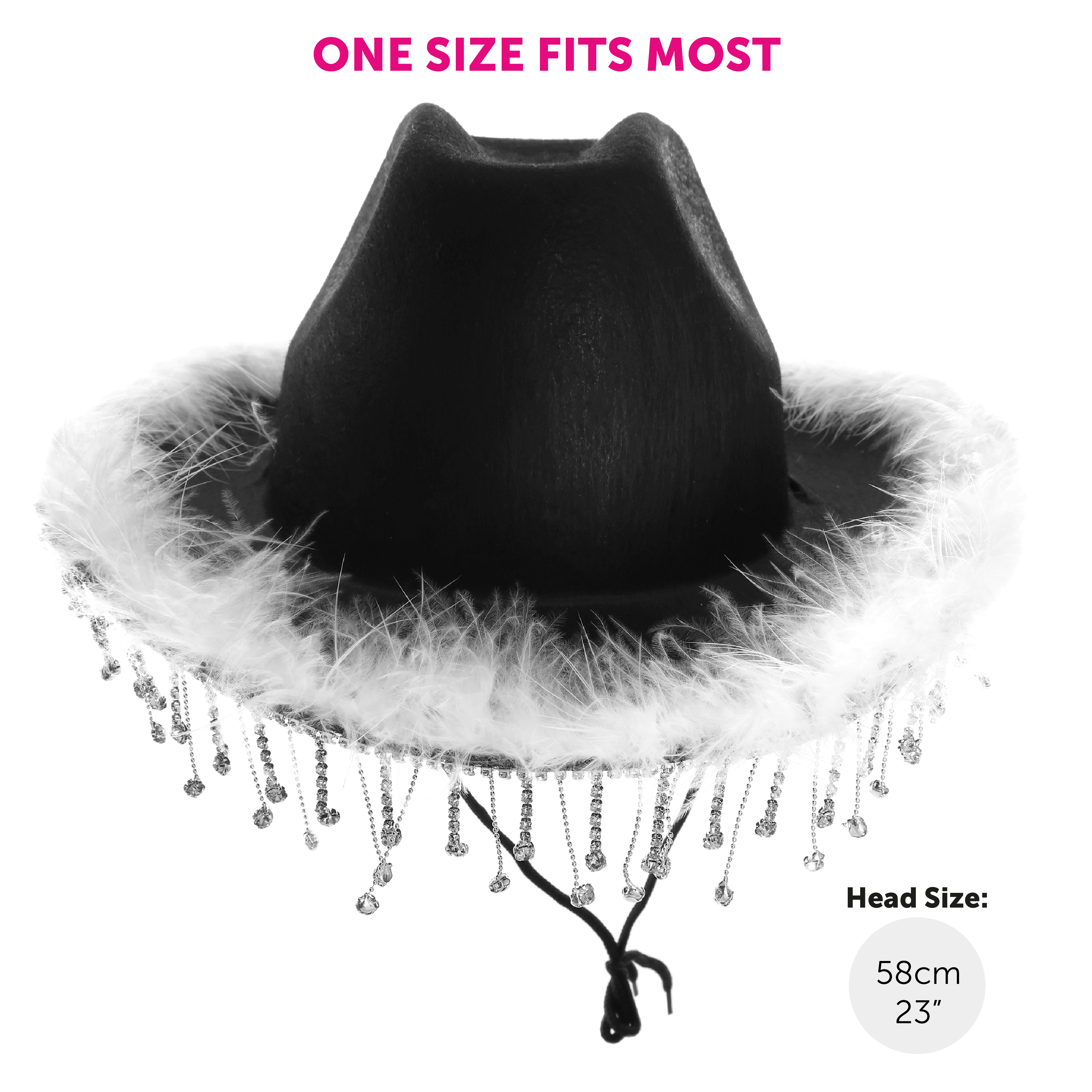 ONE SIZE FITS MOST: The Black Diamante Cowgirl Hat is the perfect size for most to wear with a suitable head size of 58cm (23"), and an adjustable string to wear comfortably all night long!