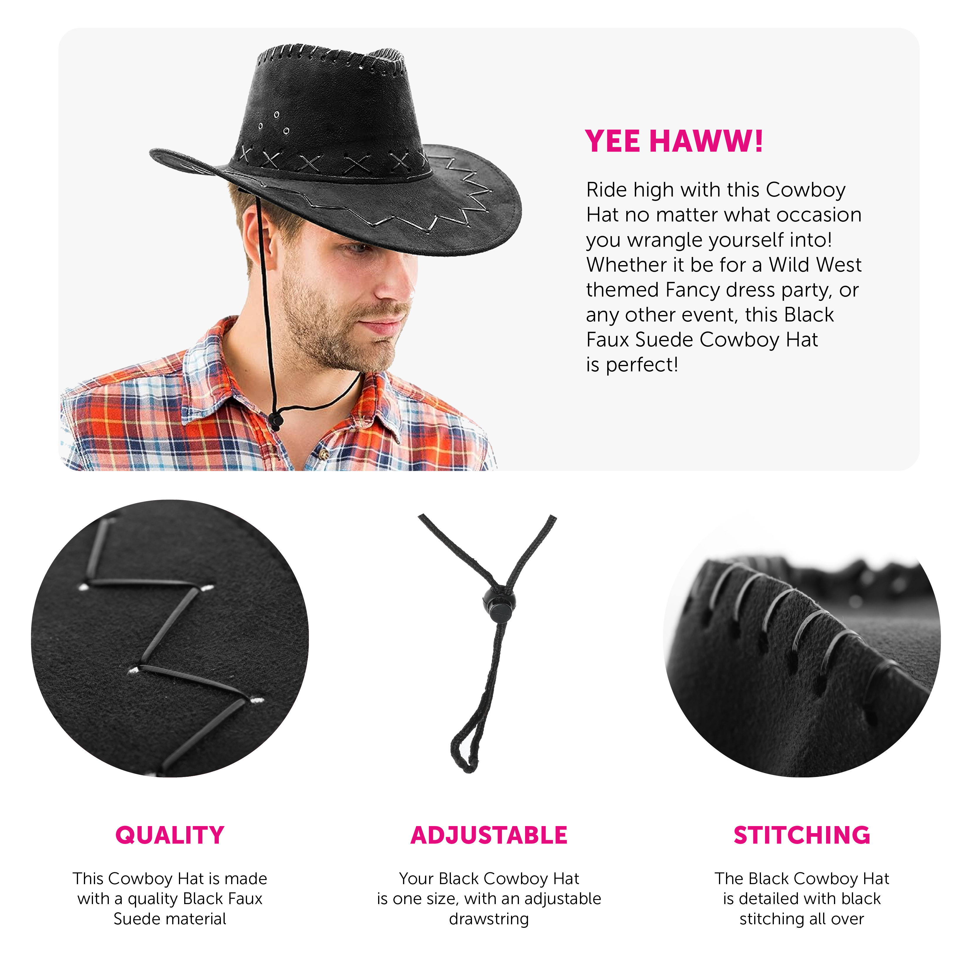 HAT DETAILS: This Cowboy Hat is a quality Black coloured, classic shaped Cowboy Hat made with a faux suede material, detailed with crosshatch stitching and an adjustable drawstring for a more secure fit!