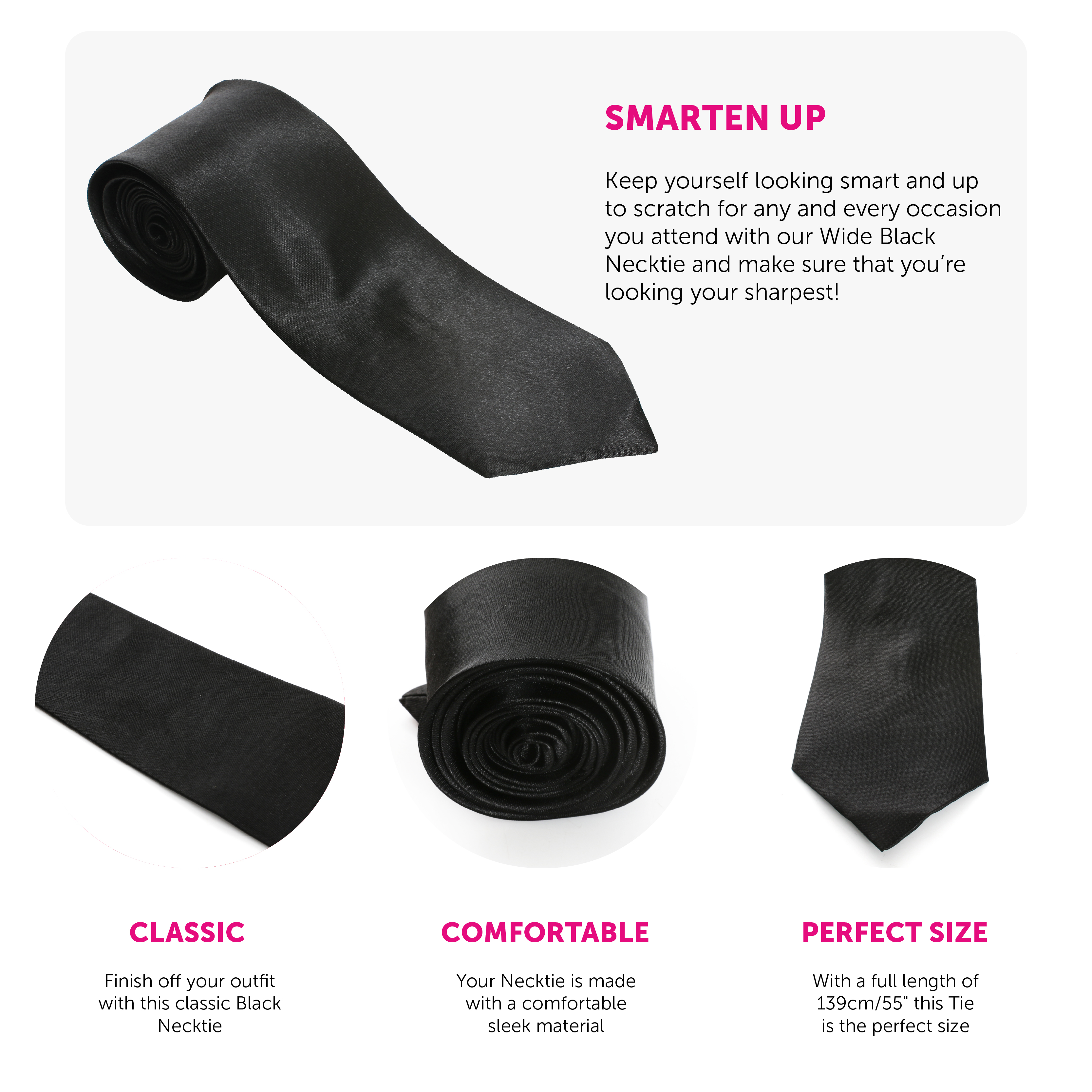PERFECT FOR SMART OCCASIONS OR FANCY DRESS ACCESSORIES: Whether you’re looking for a clean, sharp, and smart Black Necktie to polish your attire up, or a finishing touch accessory for your Fancy Dress Costume, this Black Necktie is what you need!