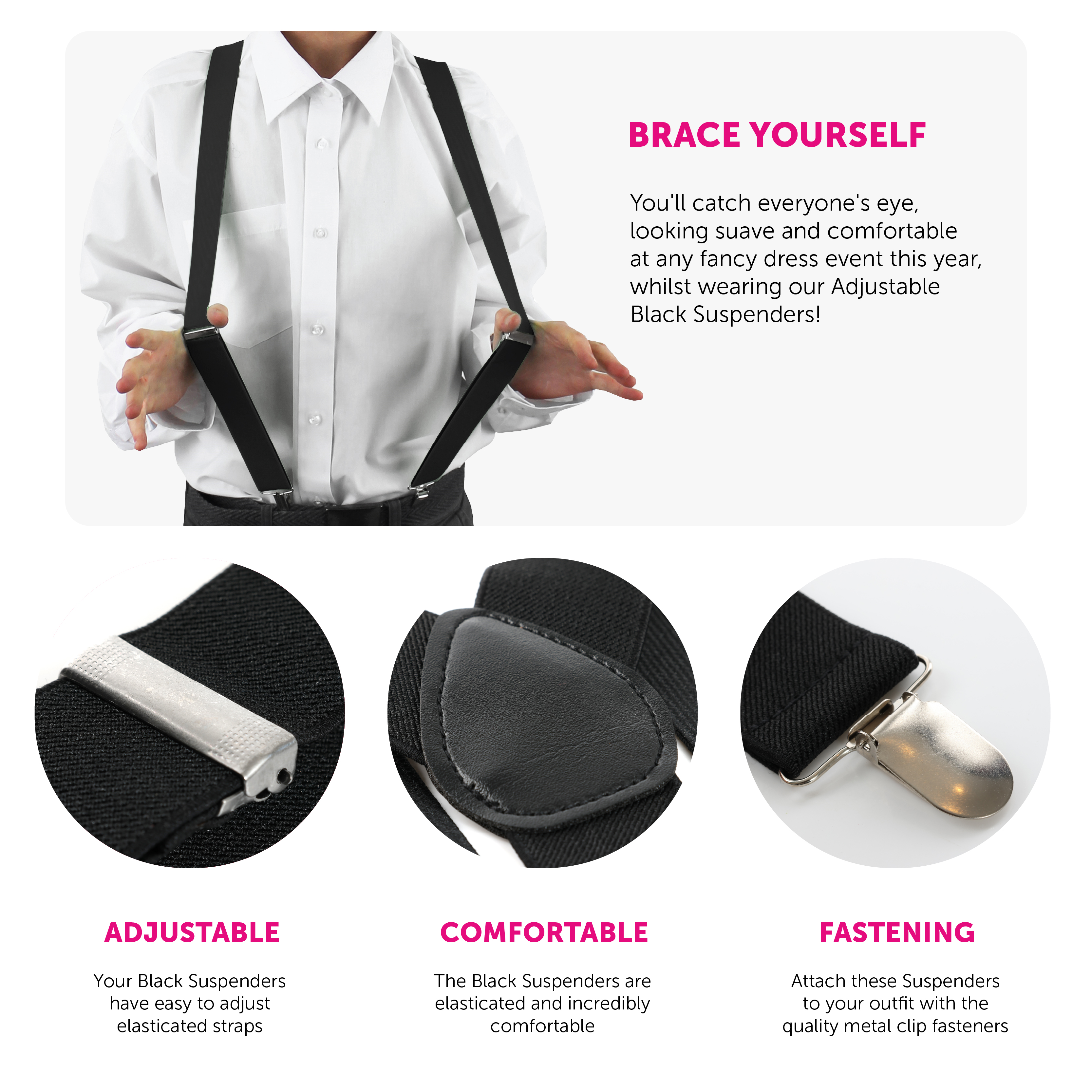 SUSPENDER DETAILS: The Black Suspenders are adjustable elasticated braces with clip fasteners, an easy to wear finishing touch to your outfit!