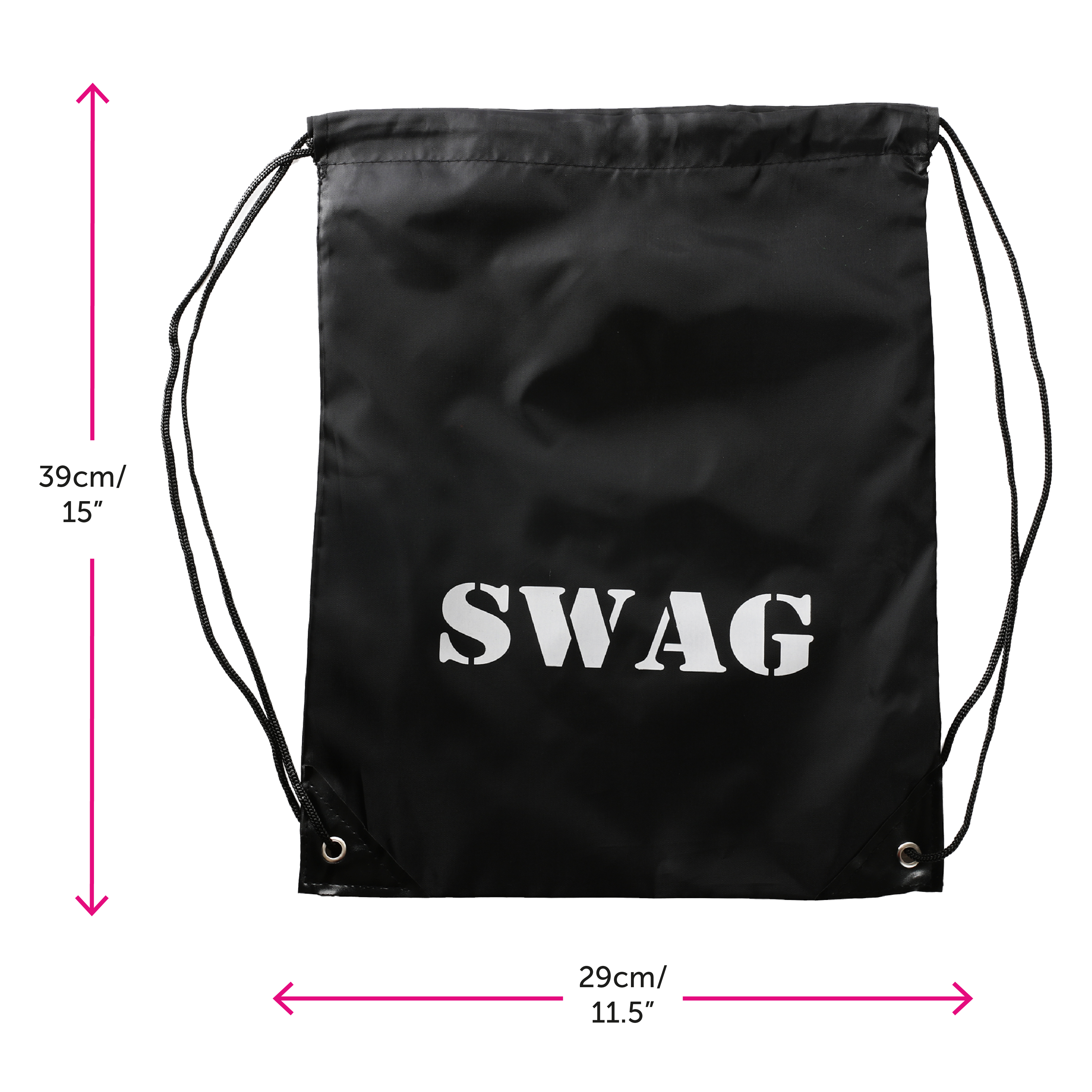 SWAG BAG ACCESSORY DETAILS: Your Black Swag Bag is a Black Drawstring Sack with SWAG in White Print across the front, measuring 39cm x 29cm for an easy-to-carry and use bag suitable for any use!