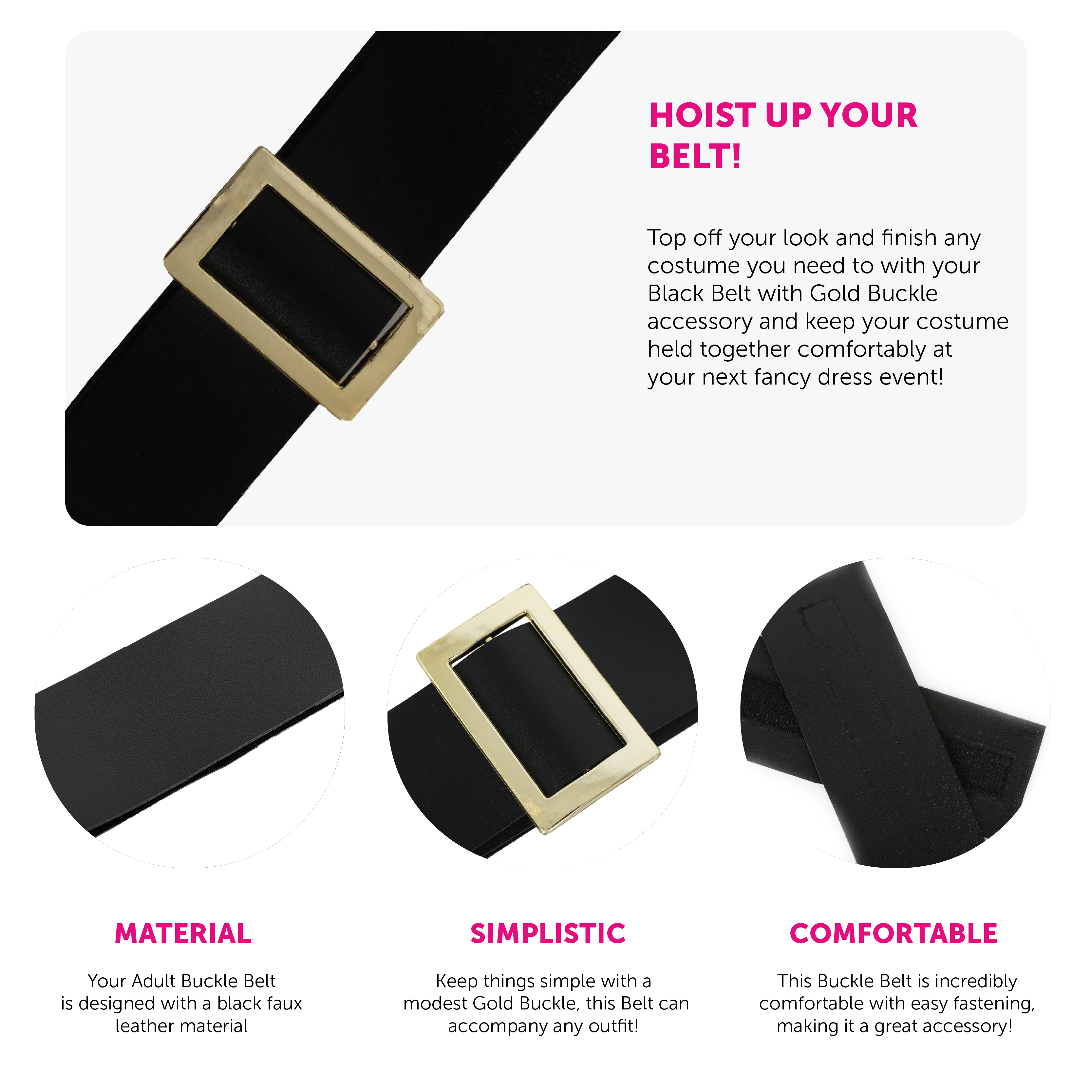 BLACK BELT WITH BUCKLE: Top off your look and finish any costume you need to with your Black Belt with Gold Buckle accessory and keep your costume held together comfortably at your next fancy dress event