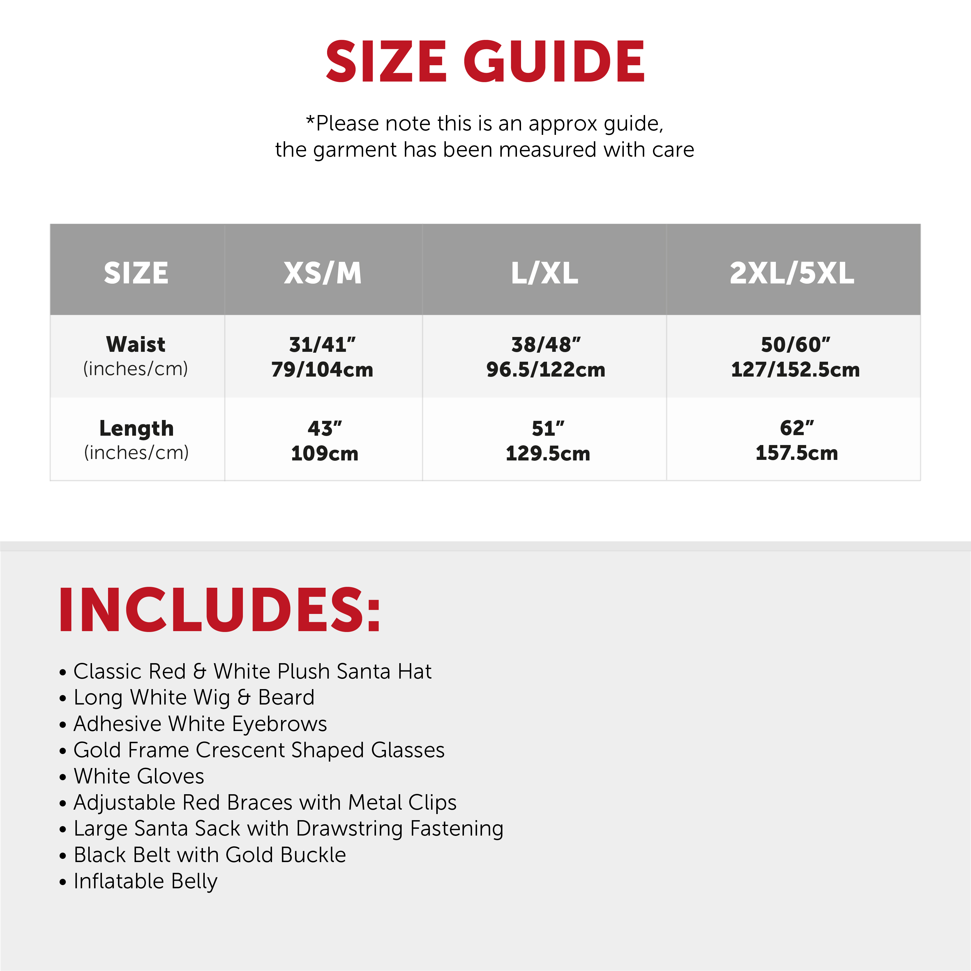 GREAT SIZED ACCESSORIES: The accessories included in this Costume Set are the perfect size, with the Santa Sack measuring 90cm x 60cm (35" x 24"), you'll be bringing the Christmas cheer this year!