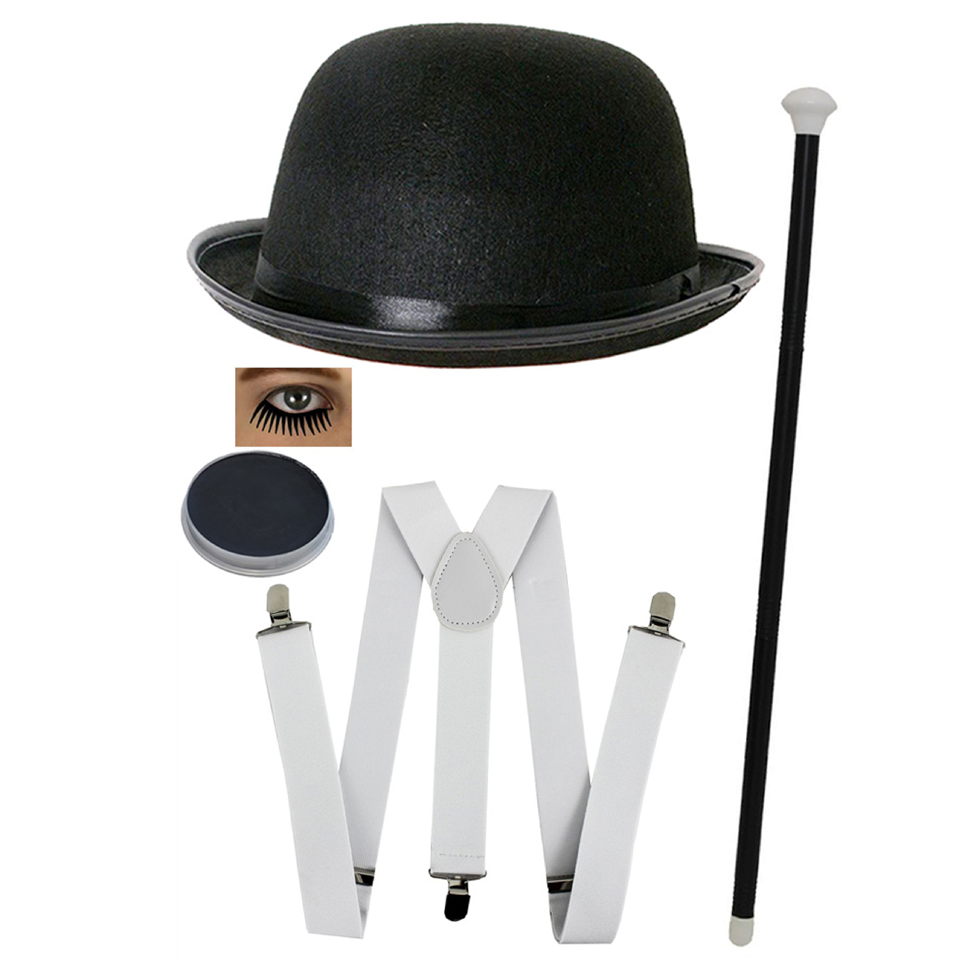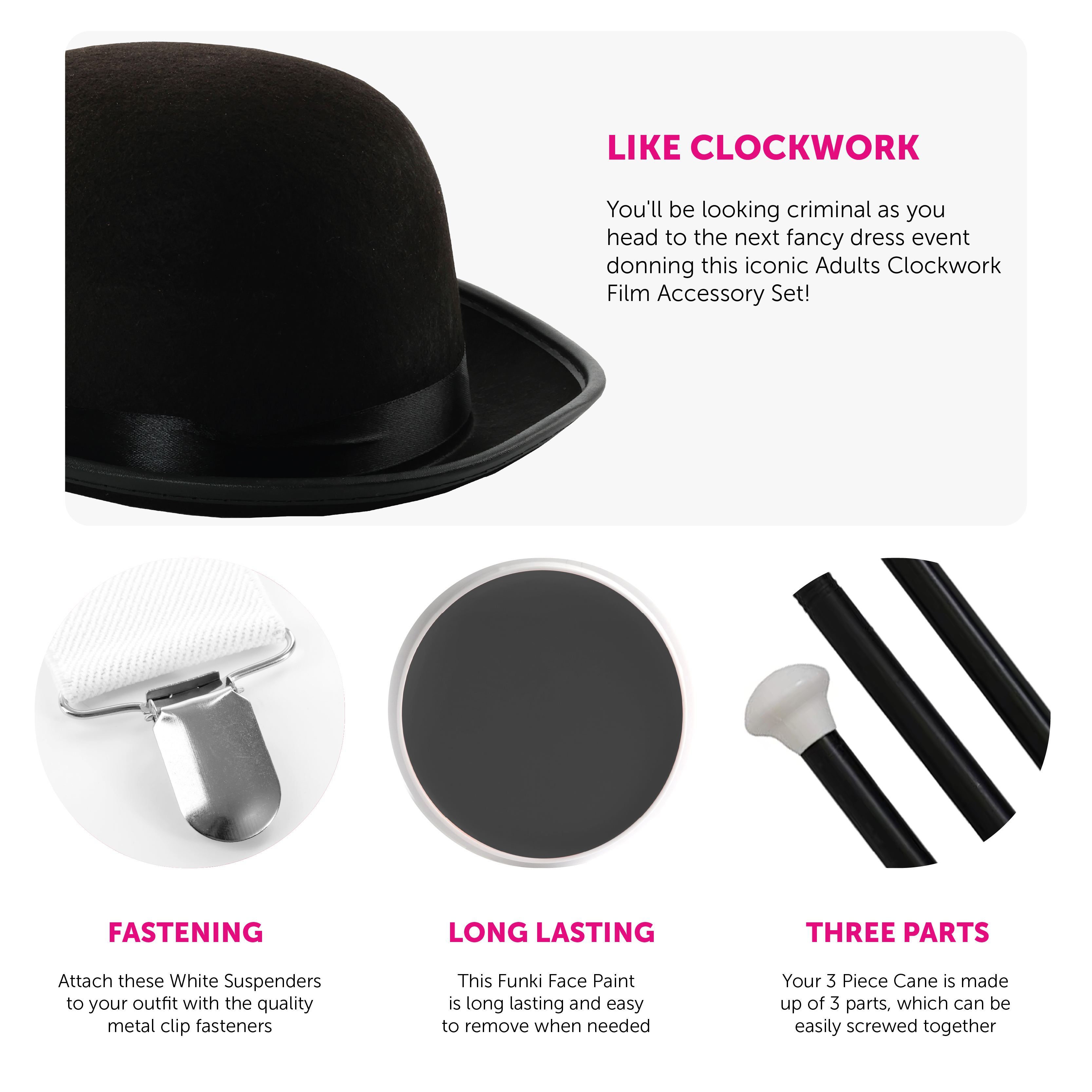 ACCESSORY SET INCLUDES: This Clockwork Film Accessory Set includes a Black Felt Bowler Hat, a Palette of easy to apply and remove Black Funki Face Paint, adjustable White Braces with quality Metal Clasps and a screwable 3 Piece Cane - the perfect accessories for a movie themed event!