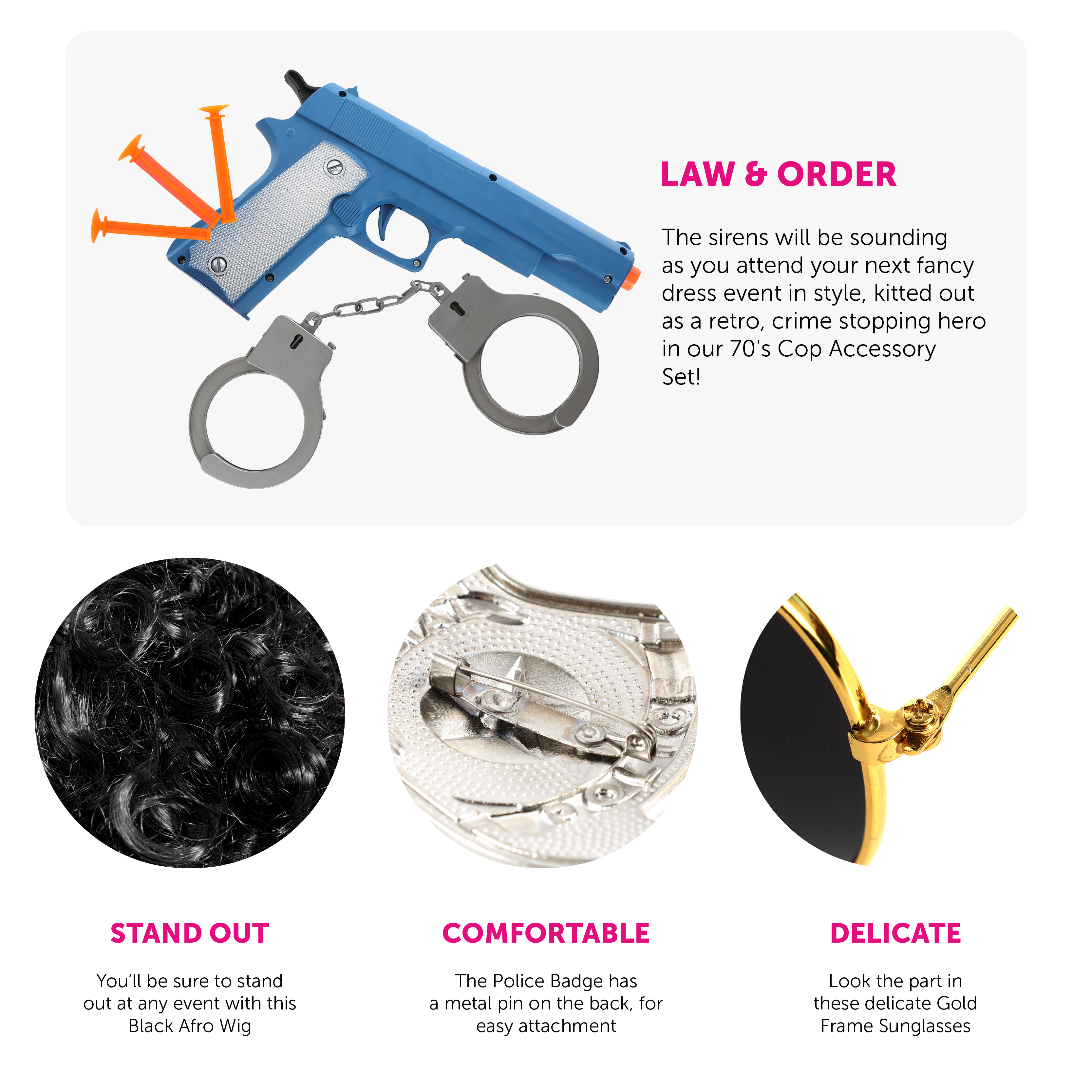 COP SET INCLUDES: Your 70's Cop Accessory Set includes a Black Afro Wig, an Adhesive Black Moustache, Sunglasses, 2x Fake Cigarettes, a Silver Metal Police Badge with a pin for easy attachment, a Blue Plastic Gun, 3x Orange Darts, and Plastic Silver Grey Handcuffs, the perfect accessory set to add to your Fancy Dress Costume!