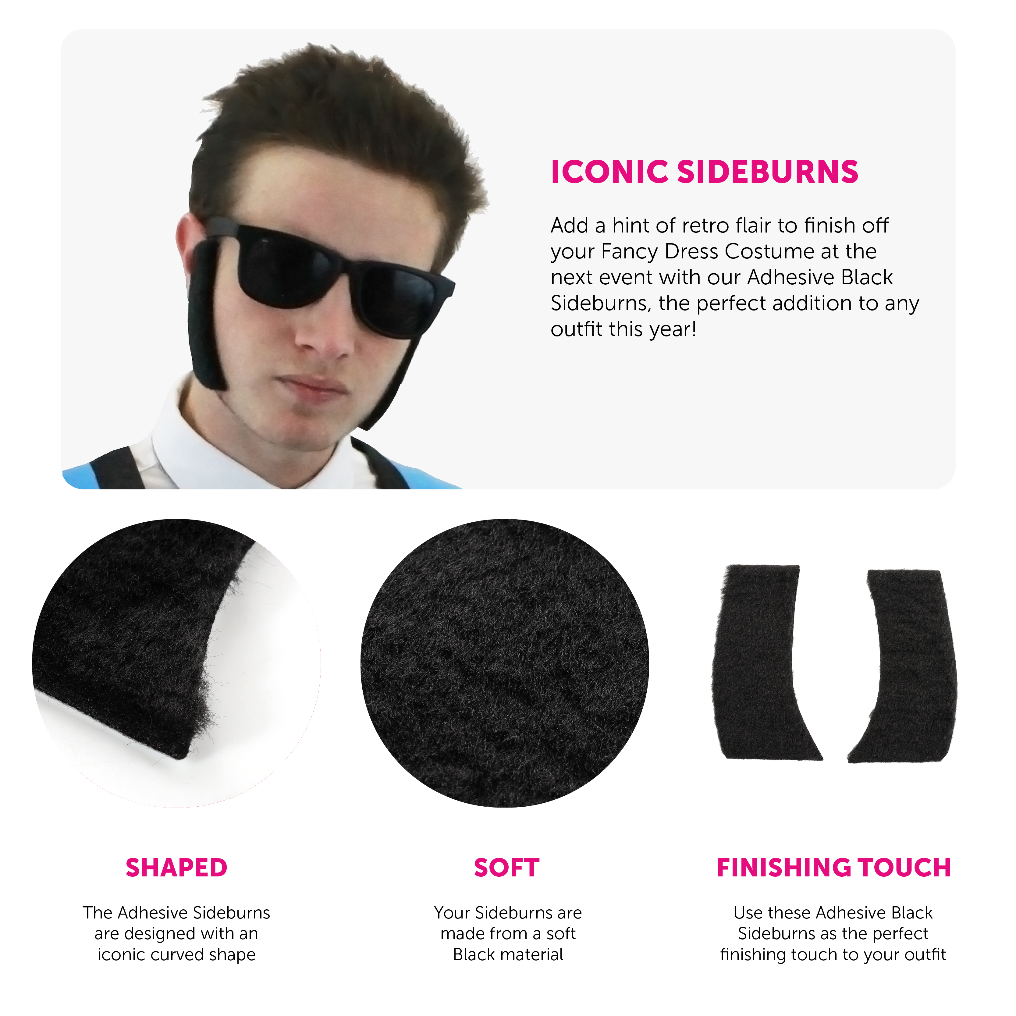 ADHESIVE SIDEBURNS: Add a hint of retro flair to finish off your Fancy Dress Costume at the next event with our Adhesive Black Sideburns, the perfect addition to any outfit this year!