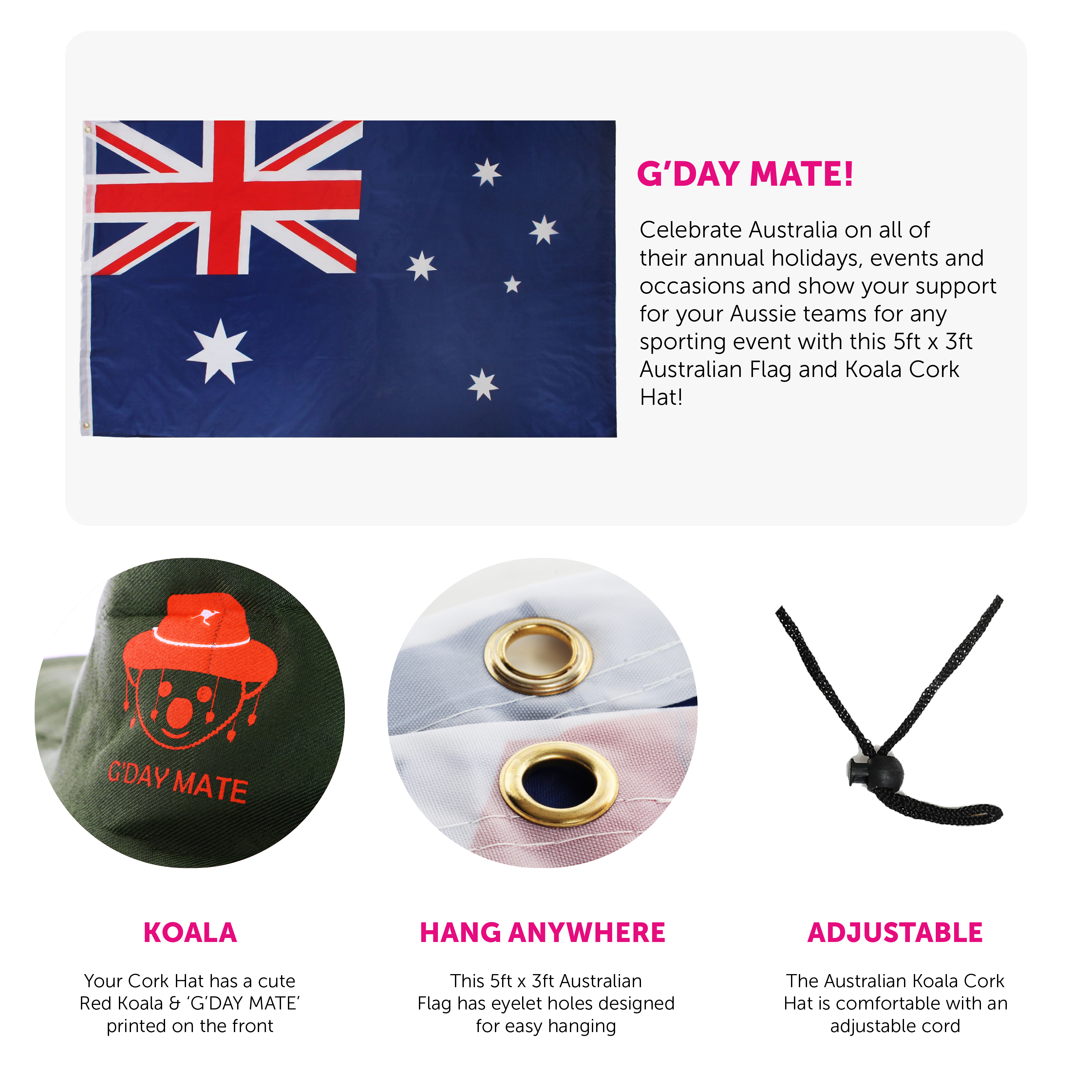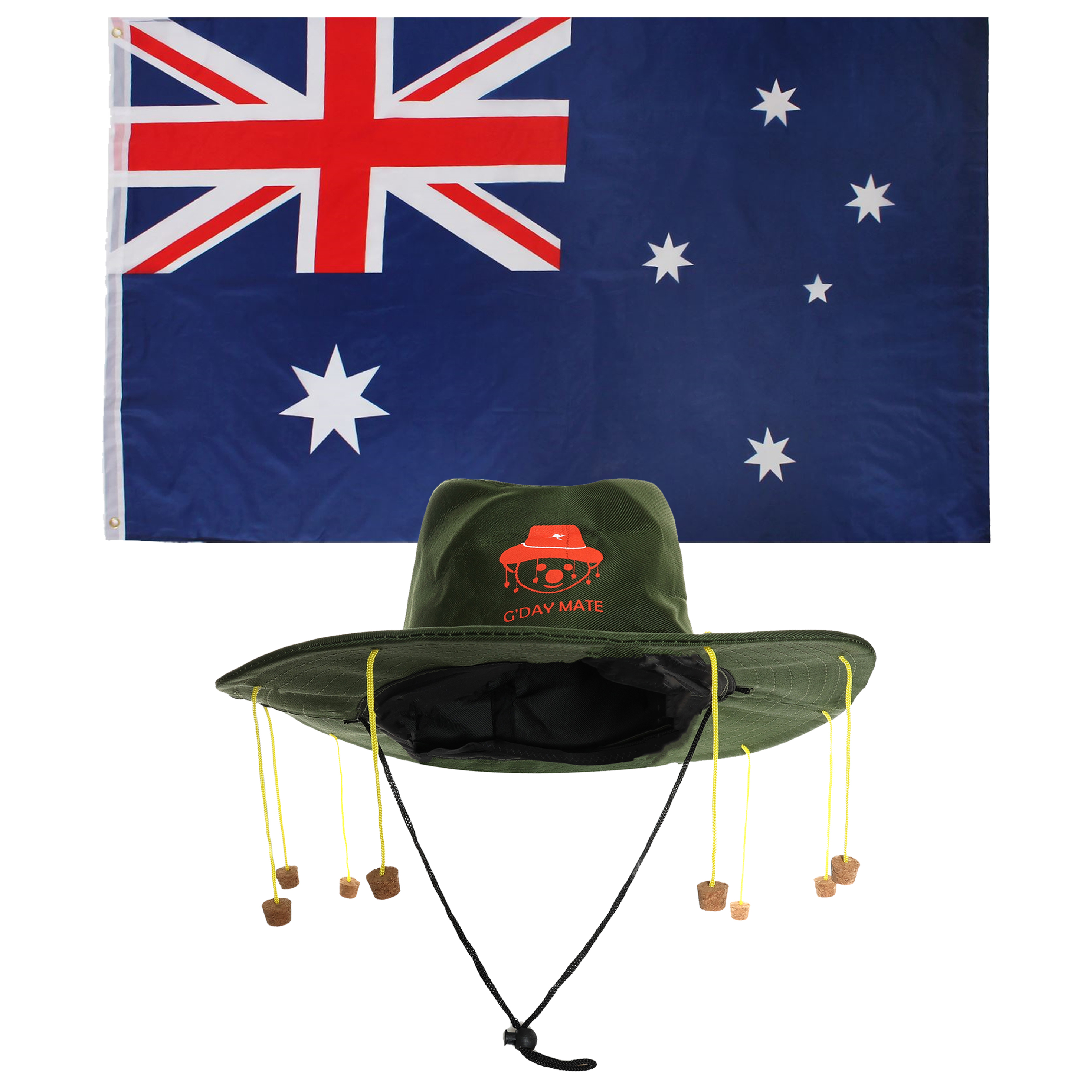 SET INCLUDES: This Australian Set includes a quality Green Hat with a Red Koala Print on the front reading 'G'DAY MATE', and corks hanging by string attached all around the brim, and a 5ft x 3ft (152cm x 91cm) Australian Flag with eyelet holes, perfect for any Australian event!