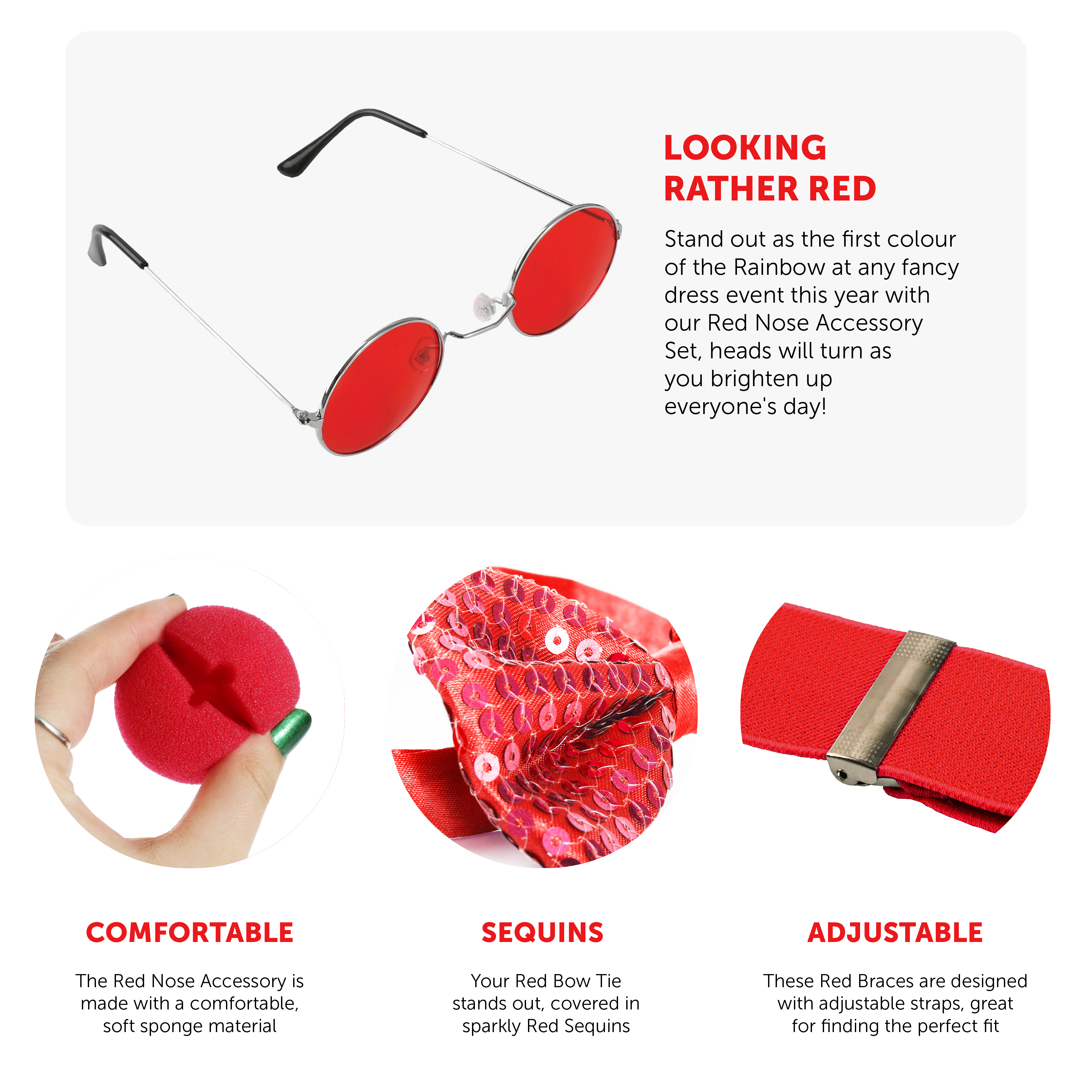 RED NOSE ACCESSORY SET: Stand out as the first colour of the Rainbow at any fancy dress event this year with our Red Nose Accessory Set, heads will turn as you brighten up everyone's day!