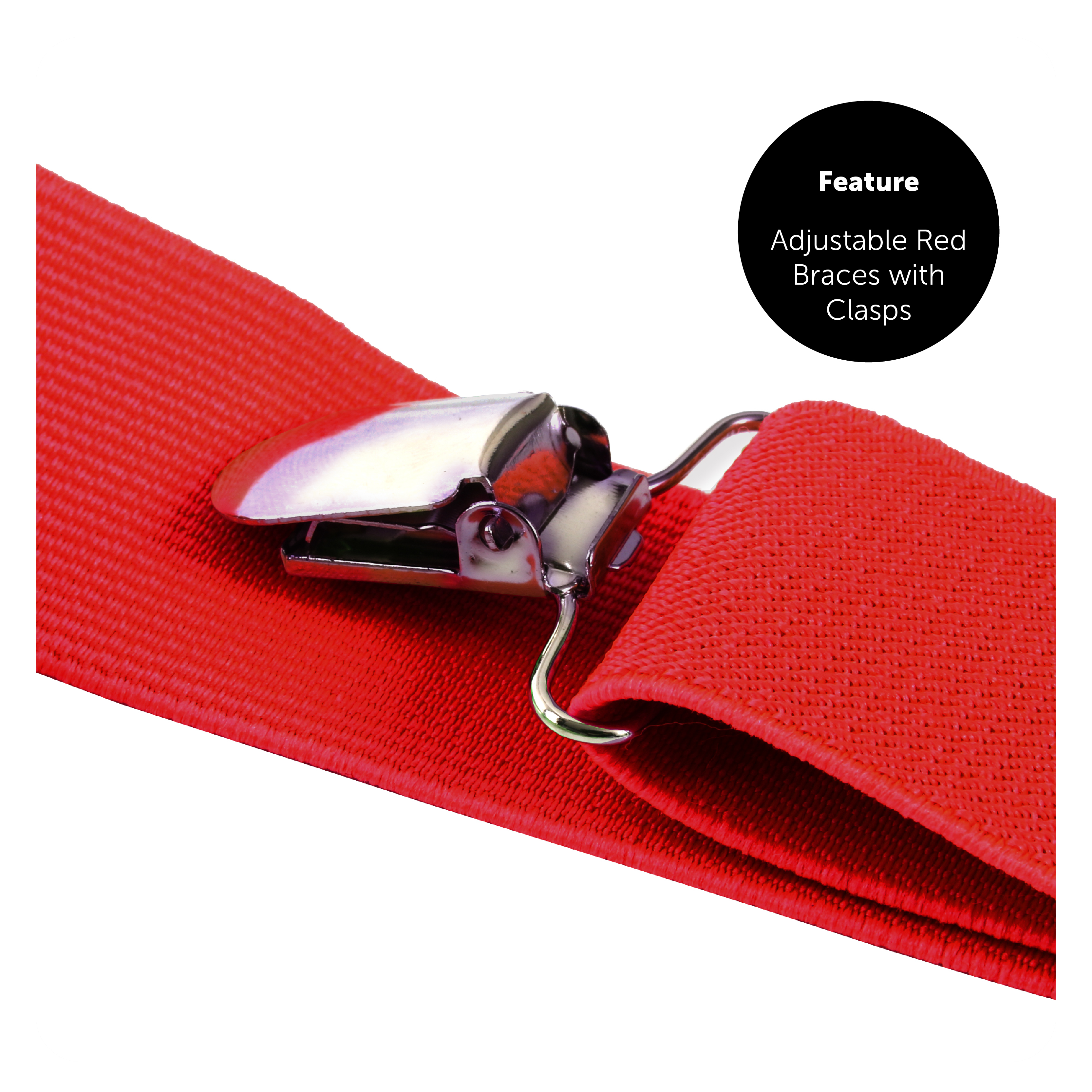 SET INCLUDES: Your Red Nose Accessory Set includes a Red Sponge Nose, a Curly Afro Wig, Round Frame Hippy Glasses with Red Lenses, an adjustable Red Sequin Bow Tie and adjustable Red Braces, to complete your look!