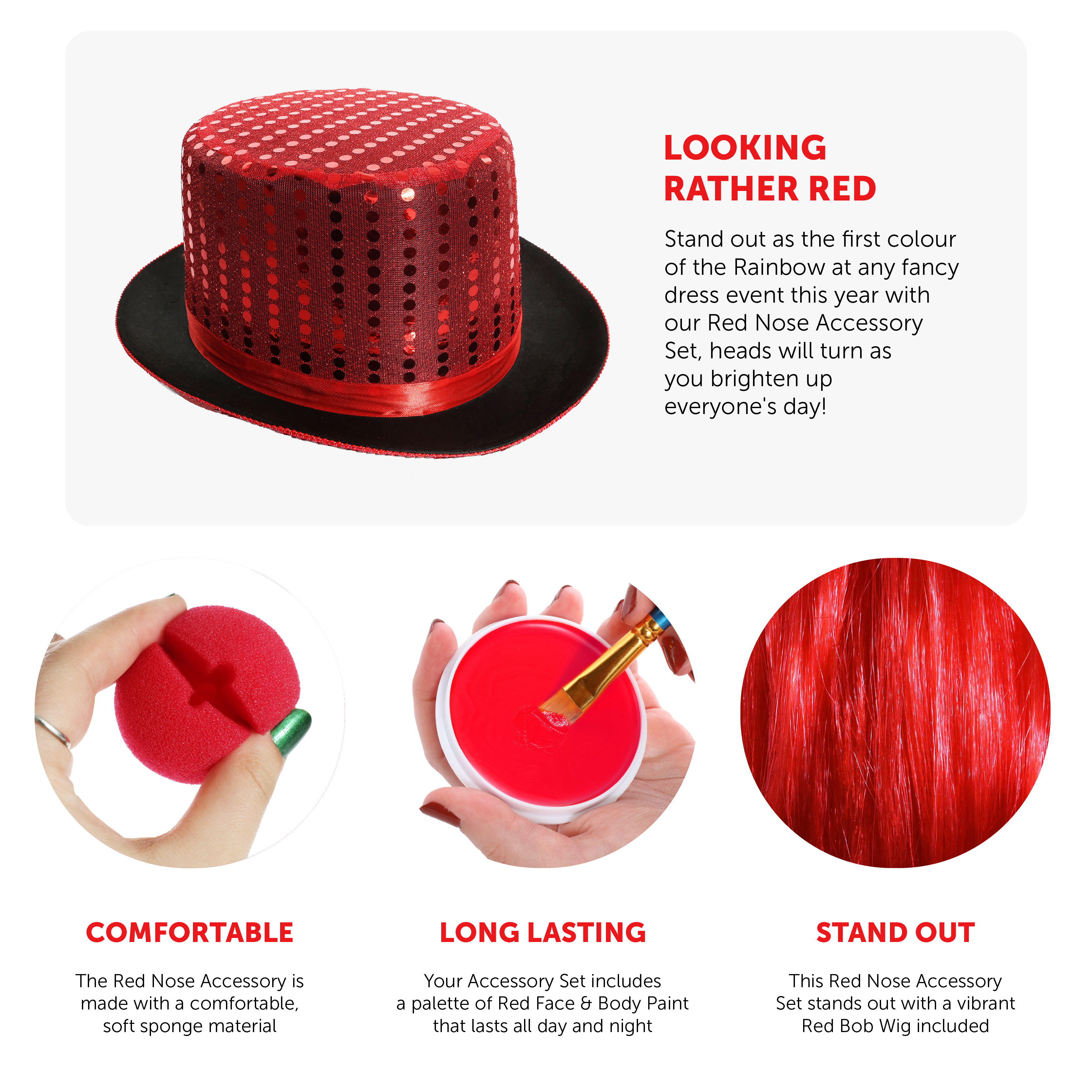 SET INCLUDES: Your Red Nose Accessory Set includes a Red Sponge Nose, a Short Red Bob Wig, a Red Top Hat covered in Sequins, and a Palette of long lasting Red Face and Body Paint, to complete your look!