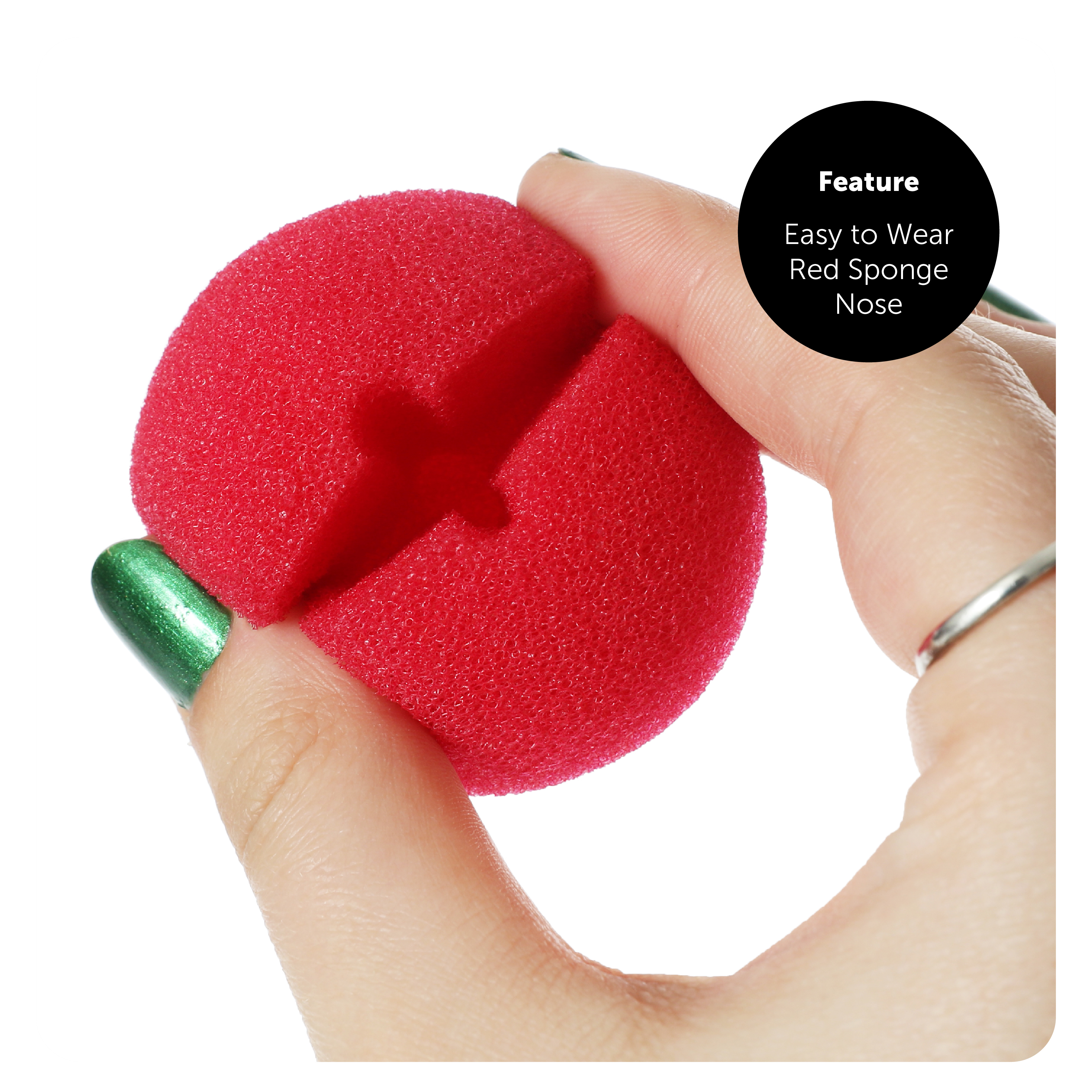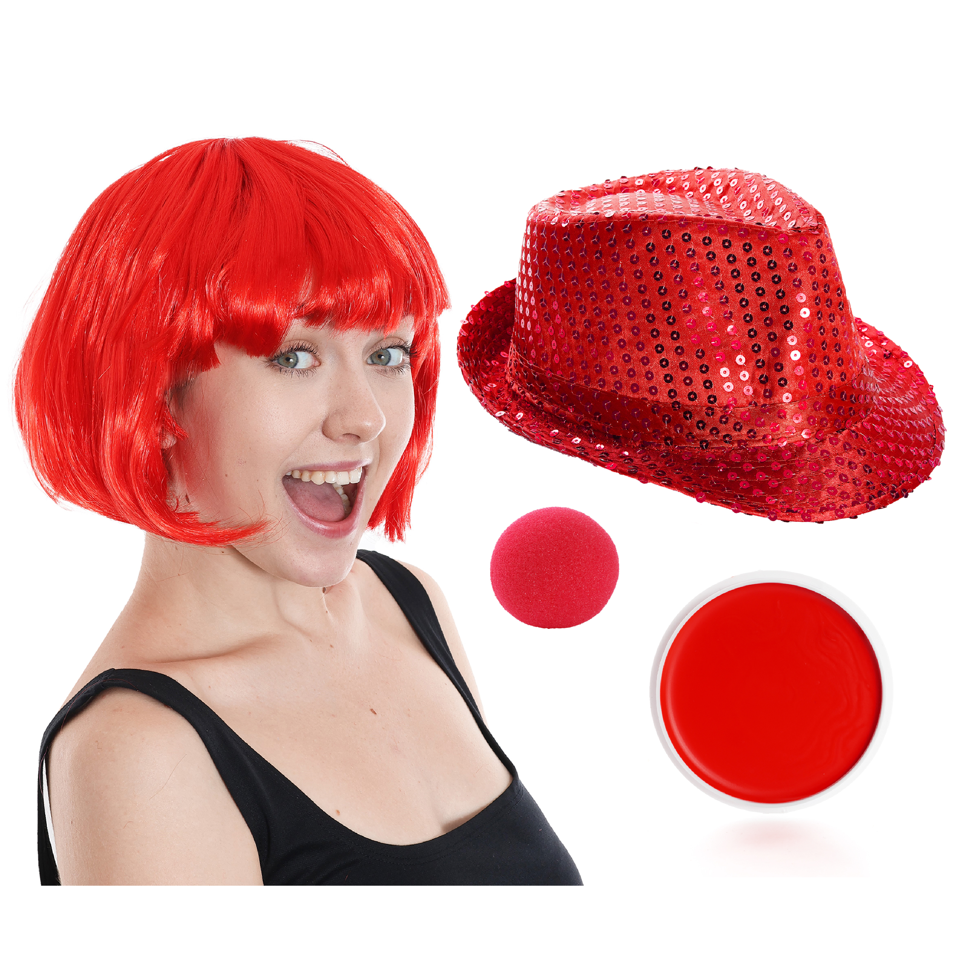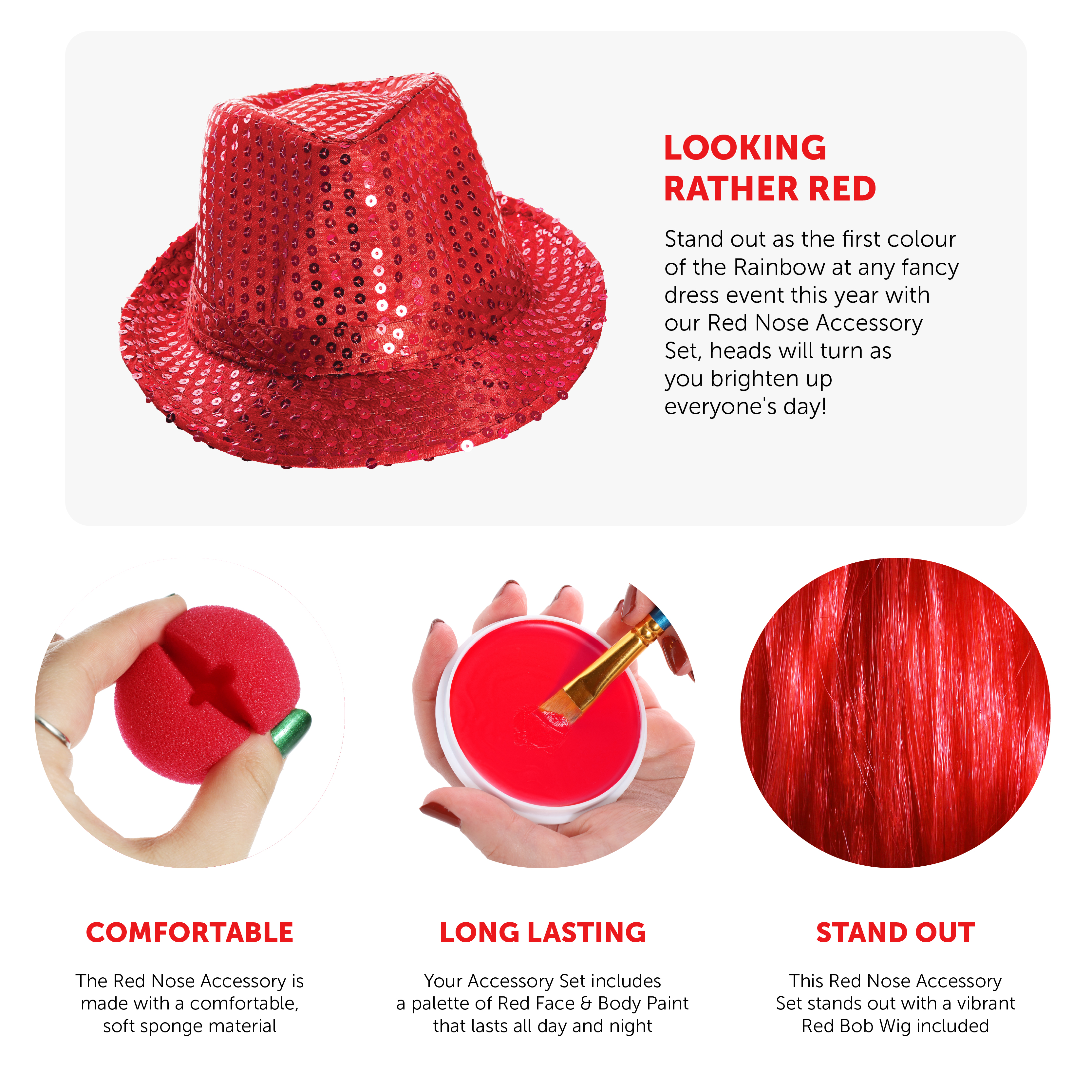 SET INCLUDES: Your Red Nose Accessory Set includes a Red Sponge Nose, a Short Red Bob Wig, a Red Trilby Hat covered in Sequins, and a Palette of long lasting Red Face and Body Paint, to complete your look!