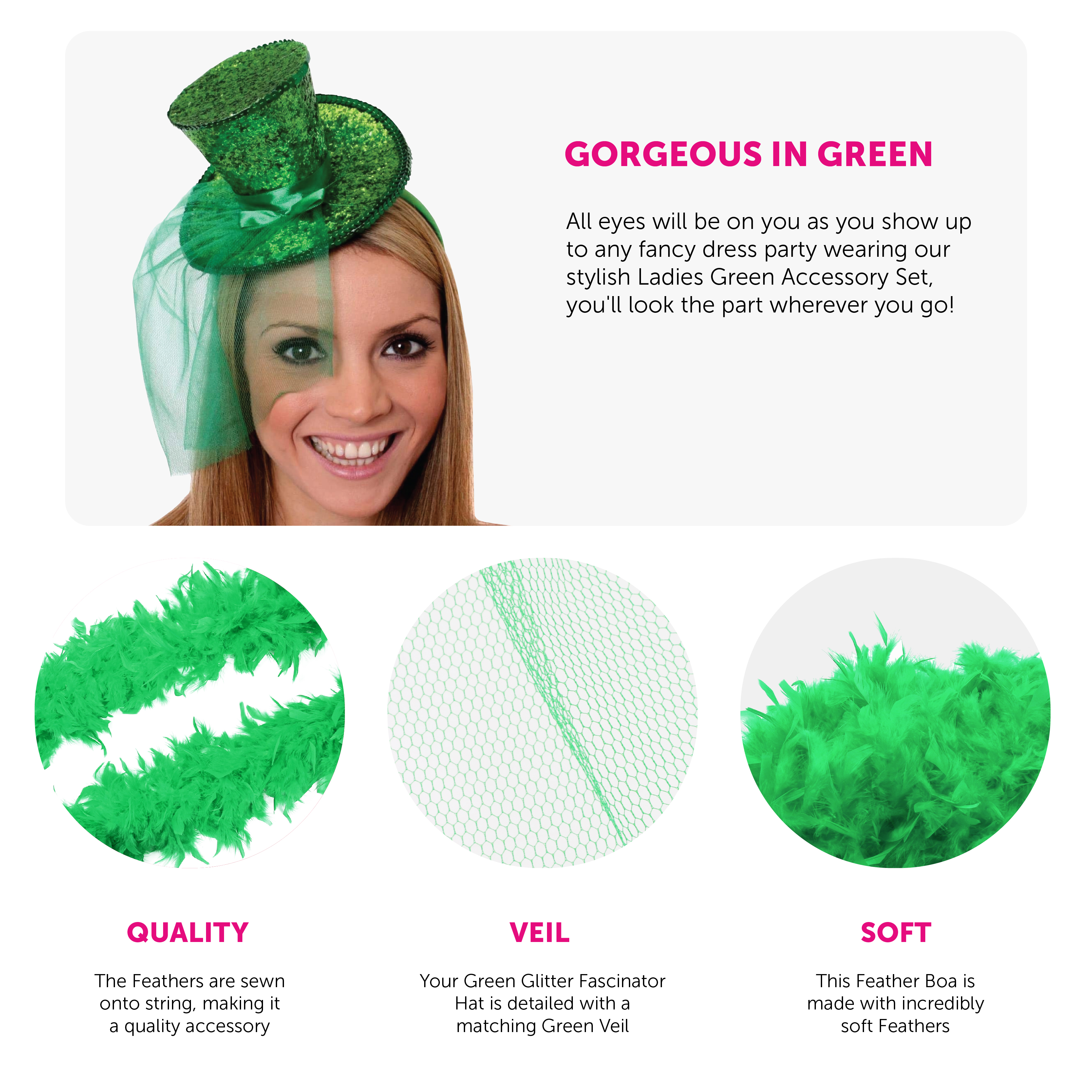 LADIES GREEN ACCESSORY SET: All eyes will be on you as you show up to any fancy dress party wearing our stylish Ladies Green Accessory Set, you'll look the part wherever you go!