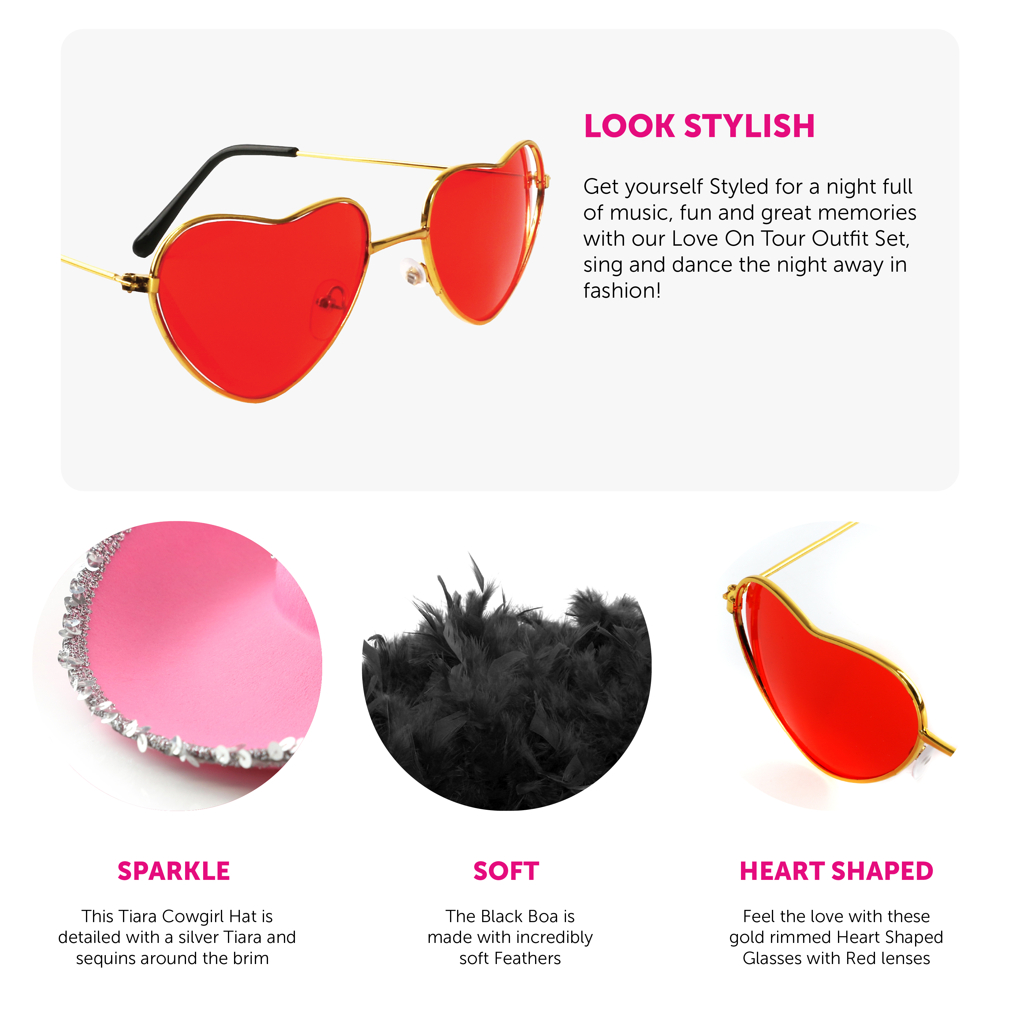 COSTUME SET INCLUDES: This Love On Tour Costume Set includes a Pink Cowboy Hat with a Silver Tiara on the front, sequin edging and an adjustable cord, a soft Black Feather Boa and a pair of Heart Shaped Glasses with Red Lenses!