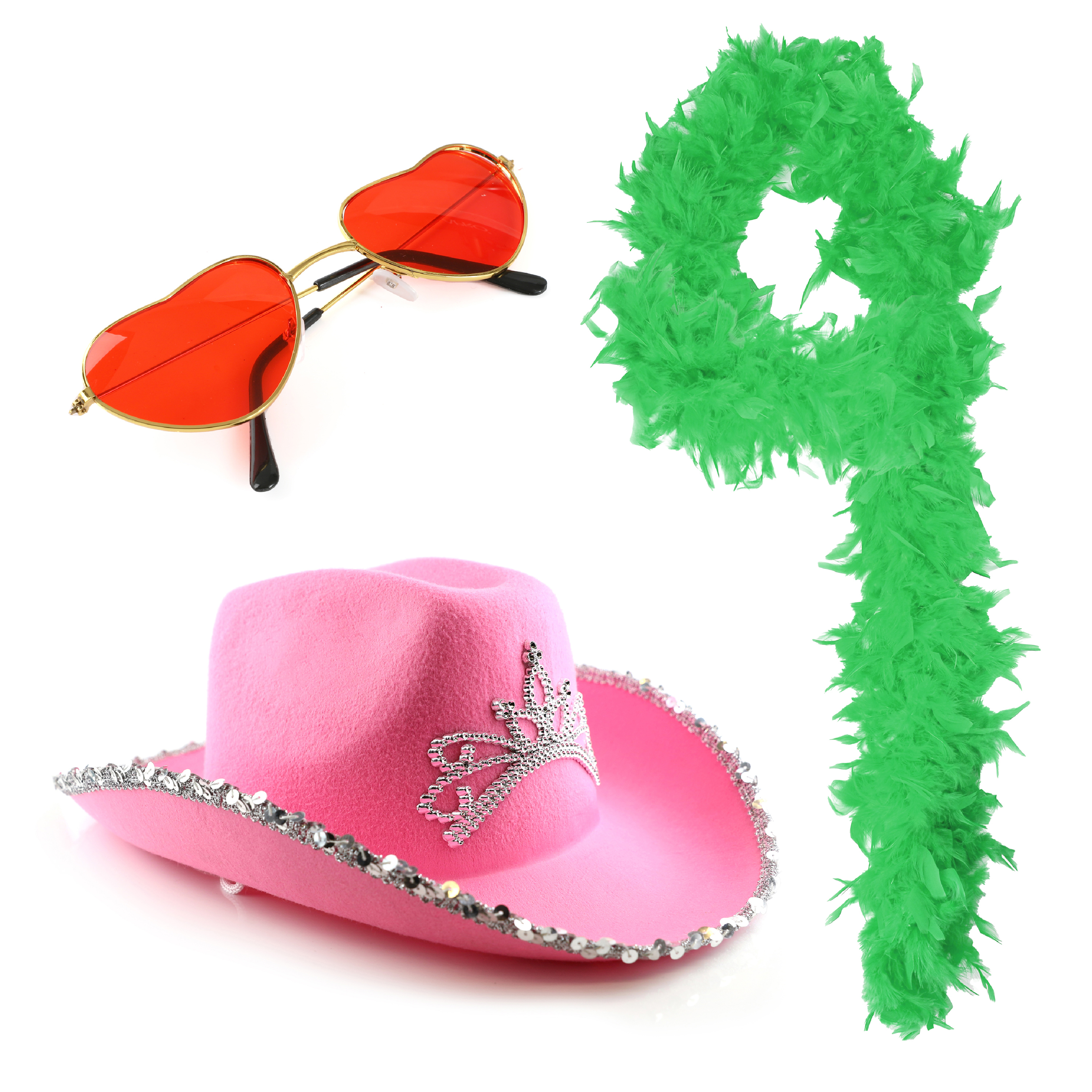 COSTUME SET INCLUDES: This Love On Tour Costume Set includes a Pink Cowboy Hat with a Silver Tiara on the front, sequin edging and an adjustable cord, a soft Green Feather Boa and a pair of Heart Shaped Glasses with Red Lenses!