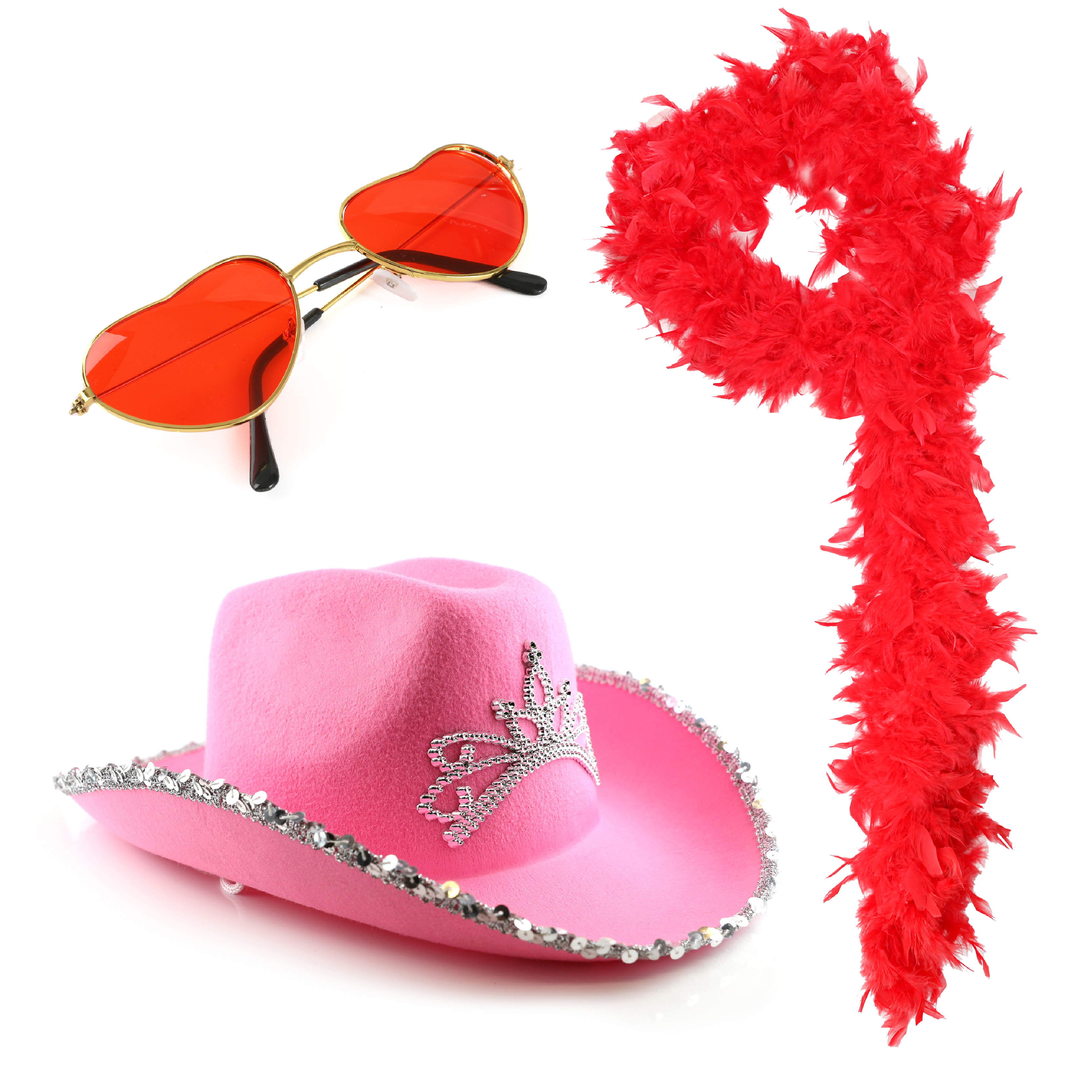 COSTUME SET INCLUDES: This Love On Tour Costume Set includes a Pink Cowboy Hat with a Silver Tiara on the front, sequin edging and an adjustable cord, a soft Red Feather Boa and a pair of Heart Shaped Glasses with Red Lenses!