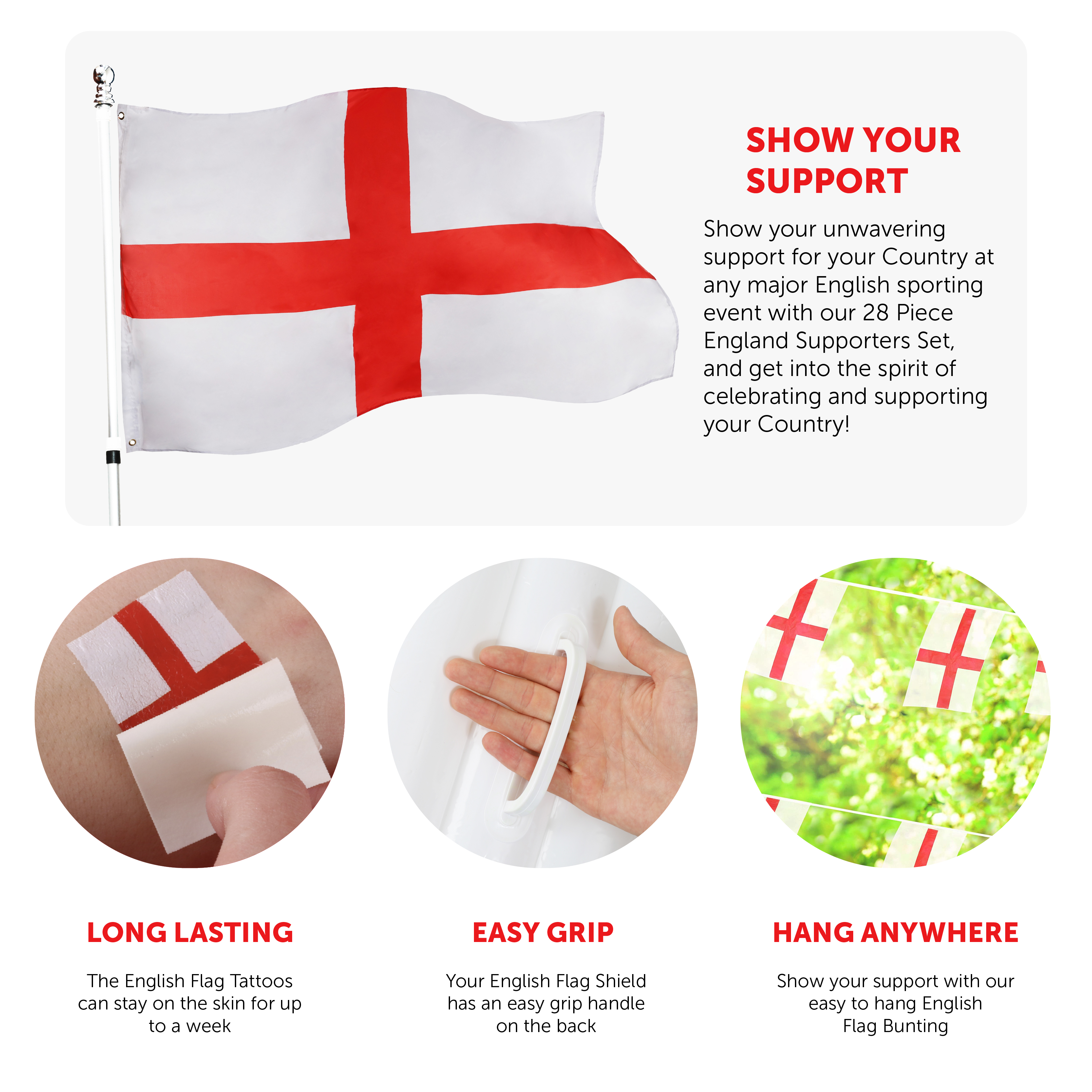 28 PIECE ENGLAND SUPPORTERS SET: Show your unwavering support for your Country at any major English sporting event with our 28 Piece England Supporters Set, and get into the spirit of celebrating and supporting your Country!