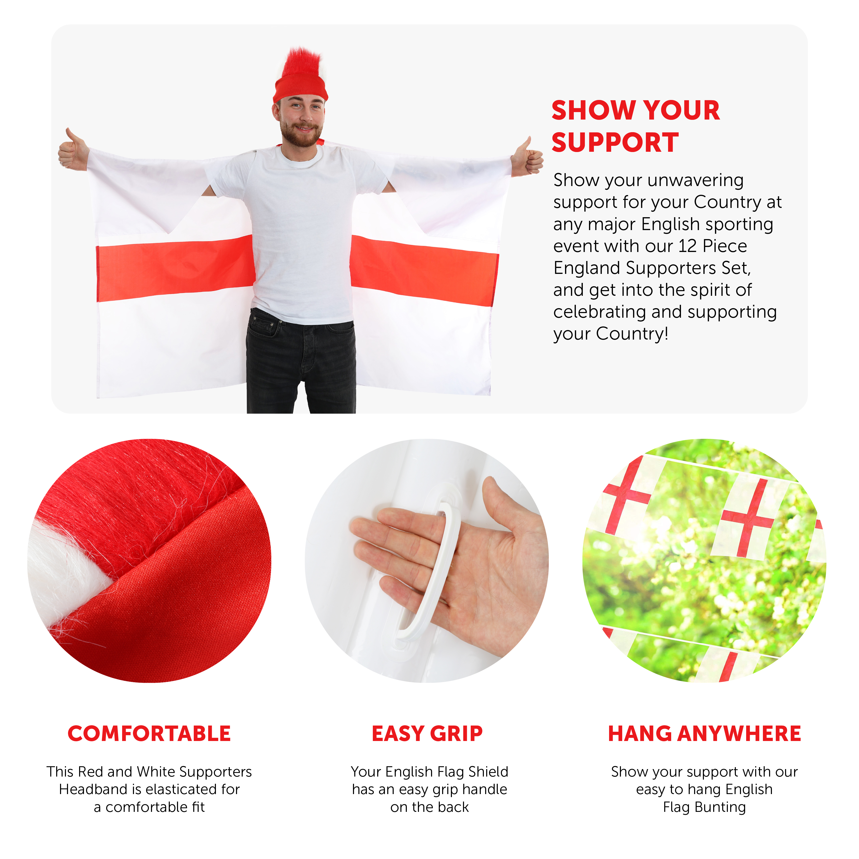 12 PIECE ENGLAND SUPPORTERS SET: Show your unwavering support for your Country at any major English sporting event with our 12 Piece England Supporters Set, and get into the spirit of celebrating and supporting your Country!