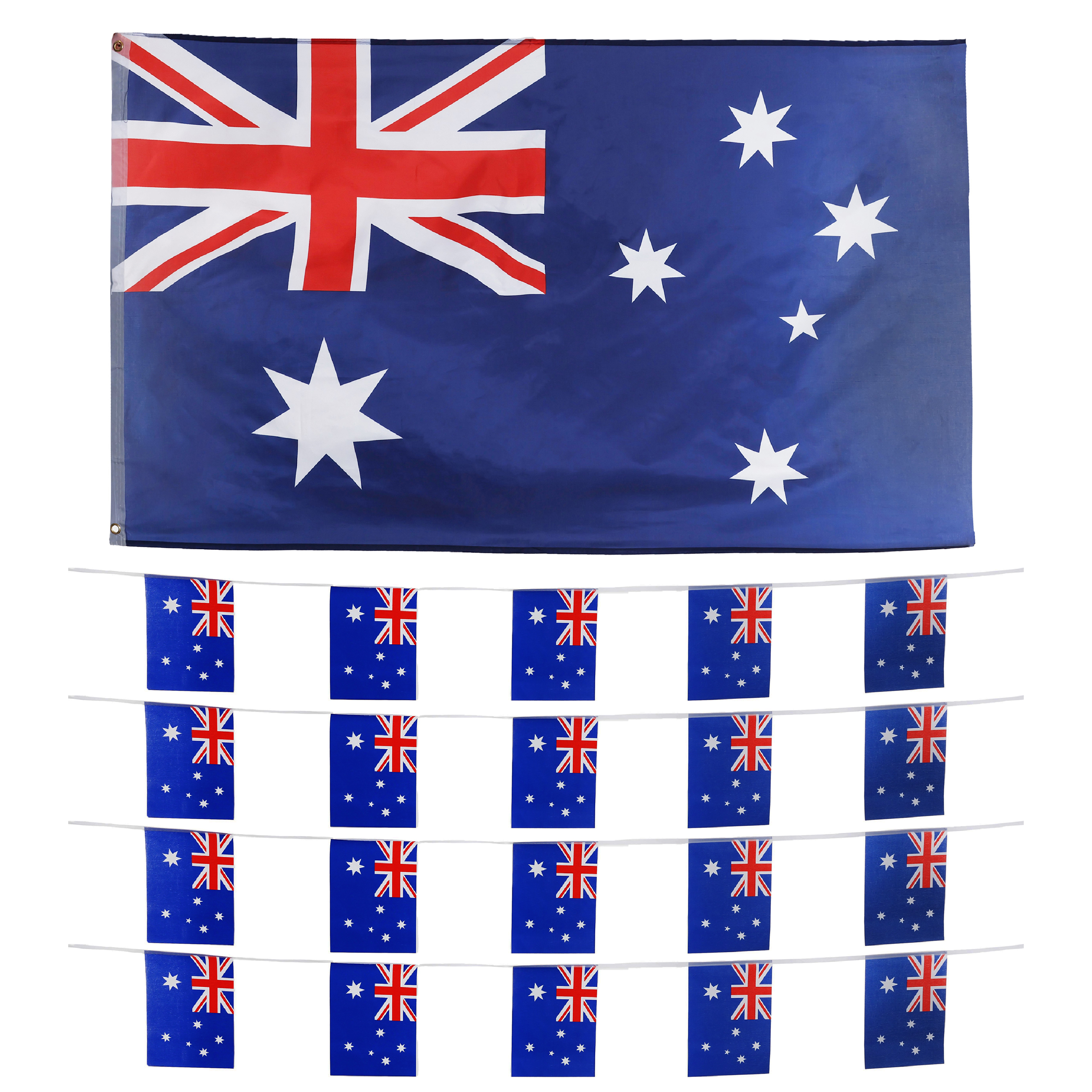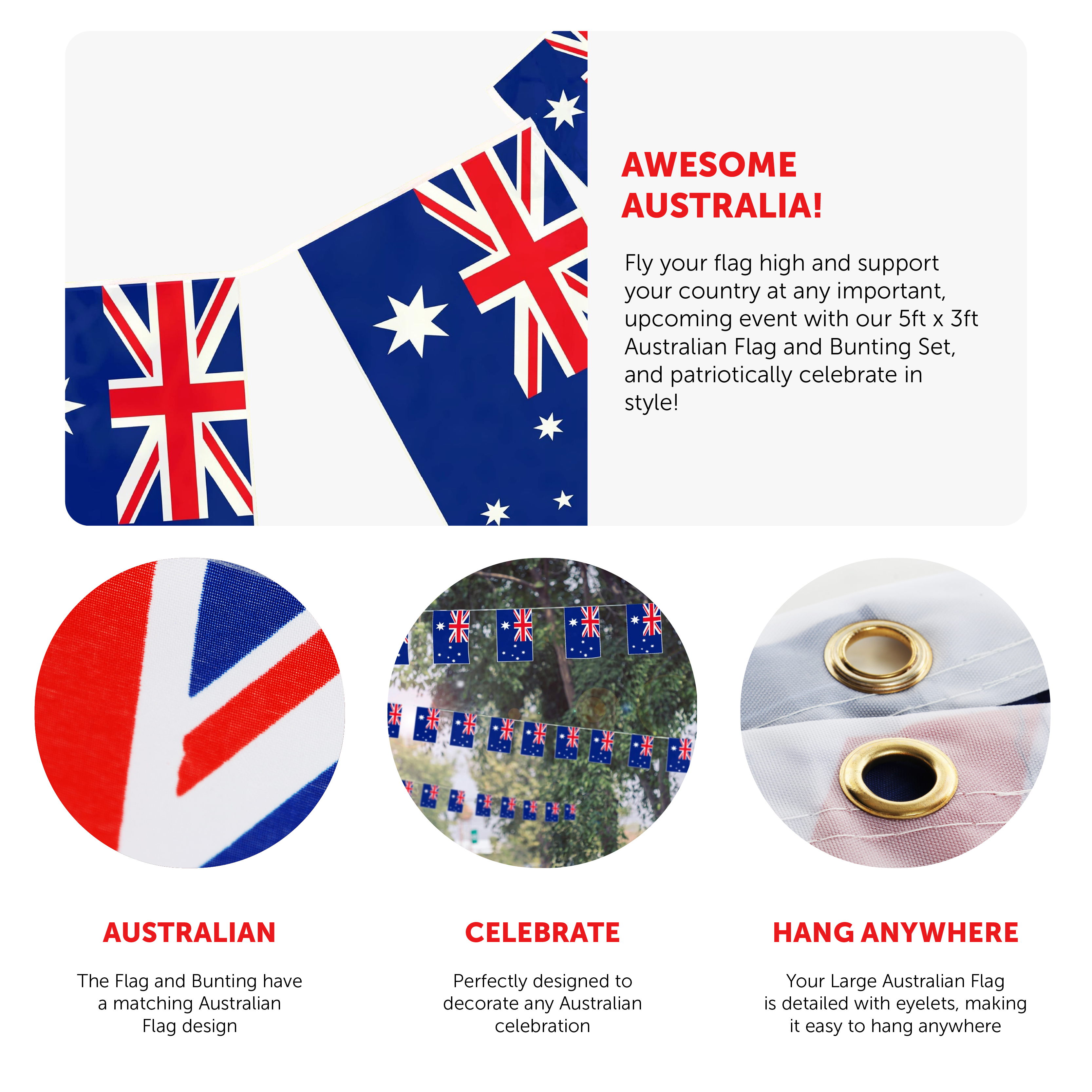 5FT X 3FT AUSTRALIAN FLAG & AUSTRALIAN BUNTING SET: Fly your flag high and support your country at any important, upcoming event with our Australian Flag and Bunting Set, and patriotically celebrate in style!