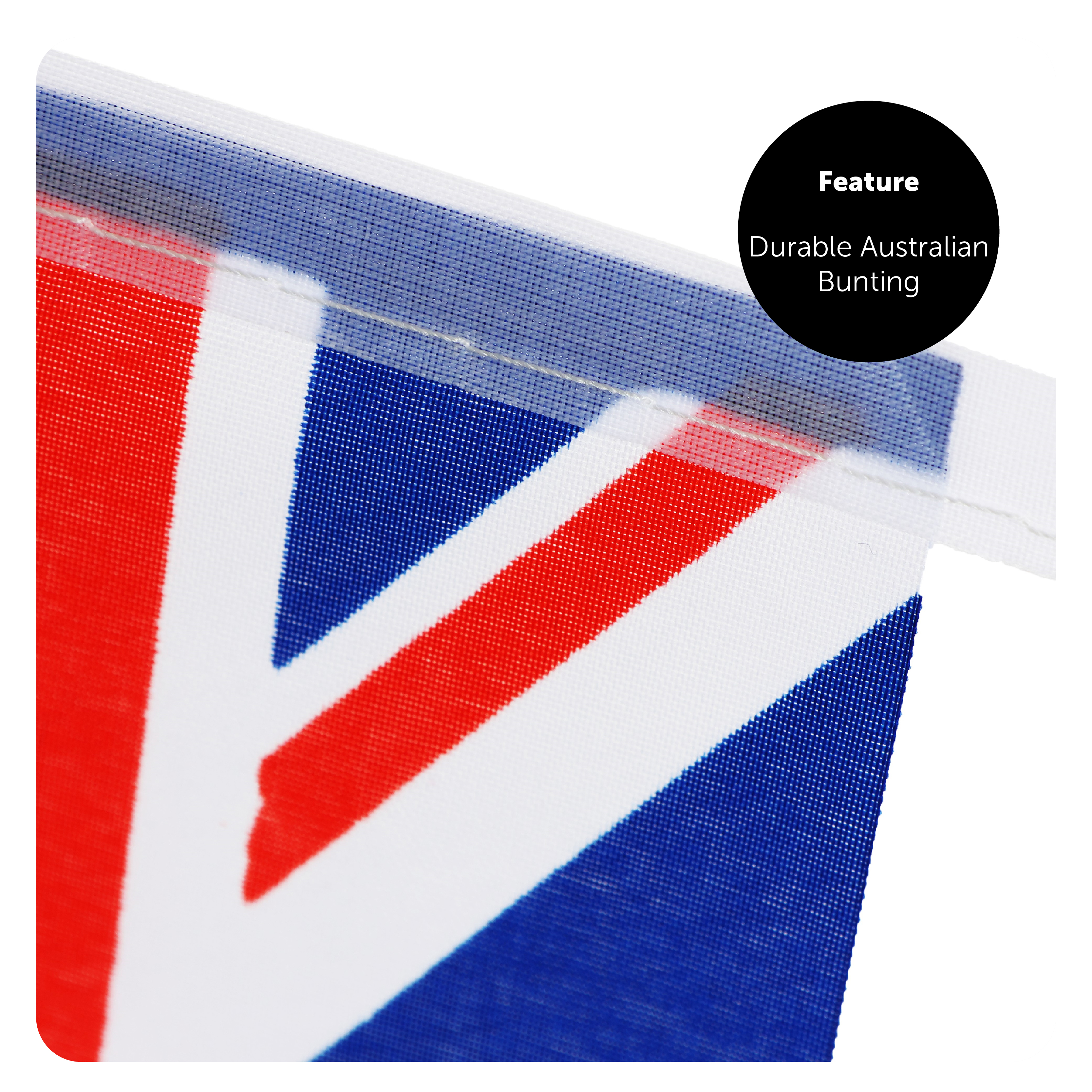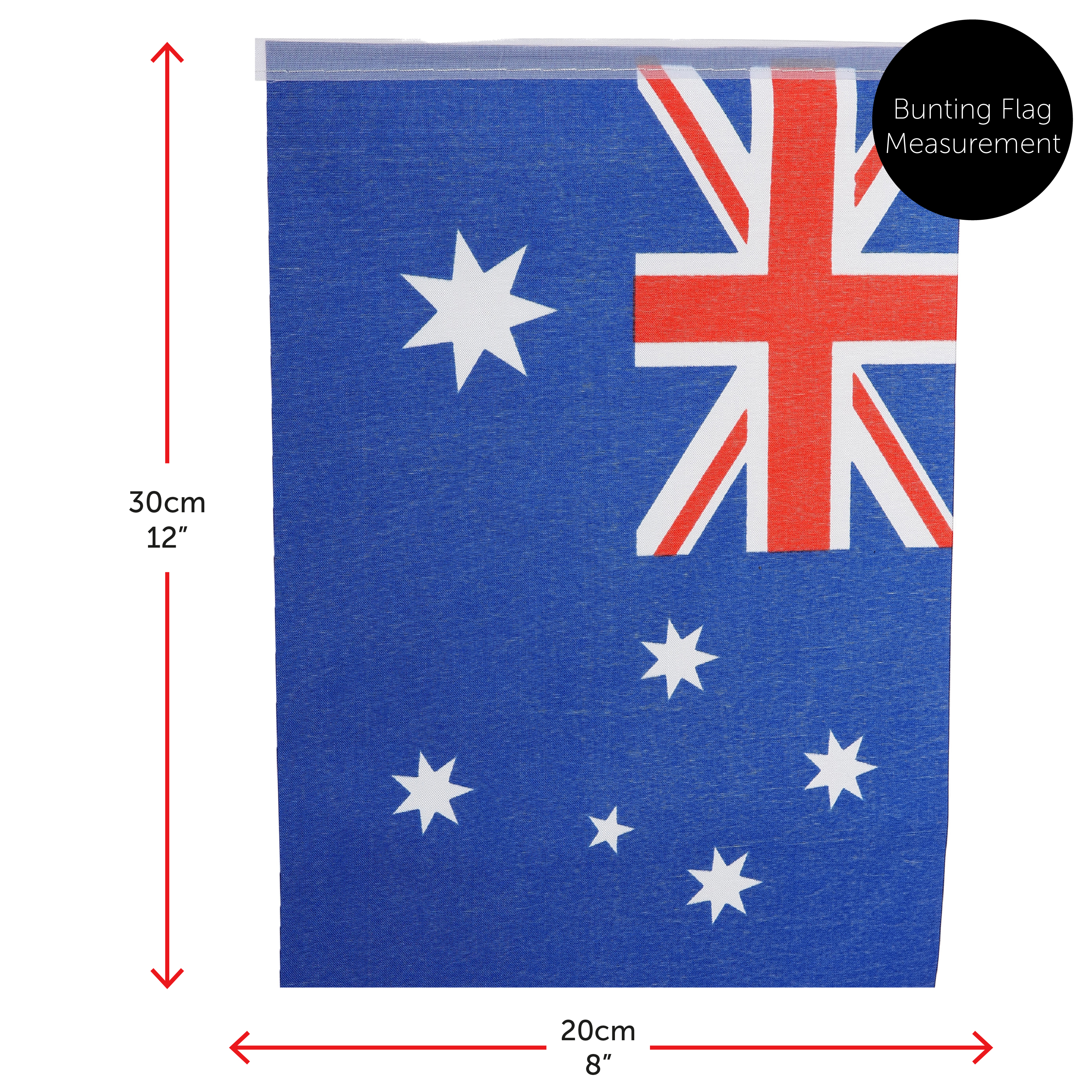 BUNTING MEASUREMENT: Your Australian Flag Bunting measures a full length of 10m/33ft, with individual flags measuring 30cm (12") x 20cm (8") - a great addition to any Australian event!