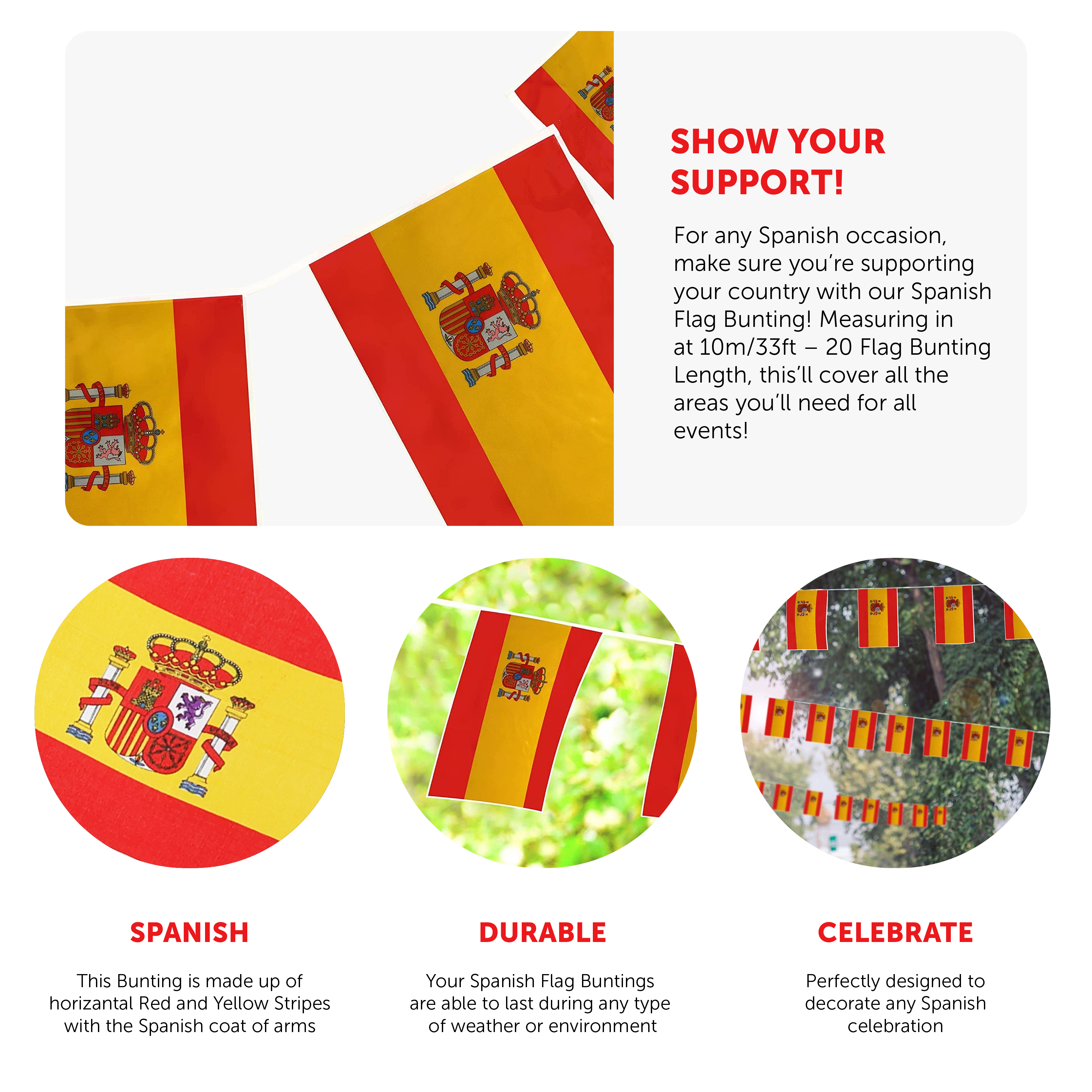 SPANISH FLAG BUNTING: For any Spanish occasion, make sure you’re supporting your country with our Spanish Flag Bunting! Measuring in at 10m/33ft – 20 Flag Bunting Length, this’ll cover all the areas you’ll need for all events!