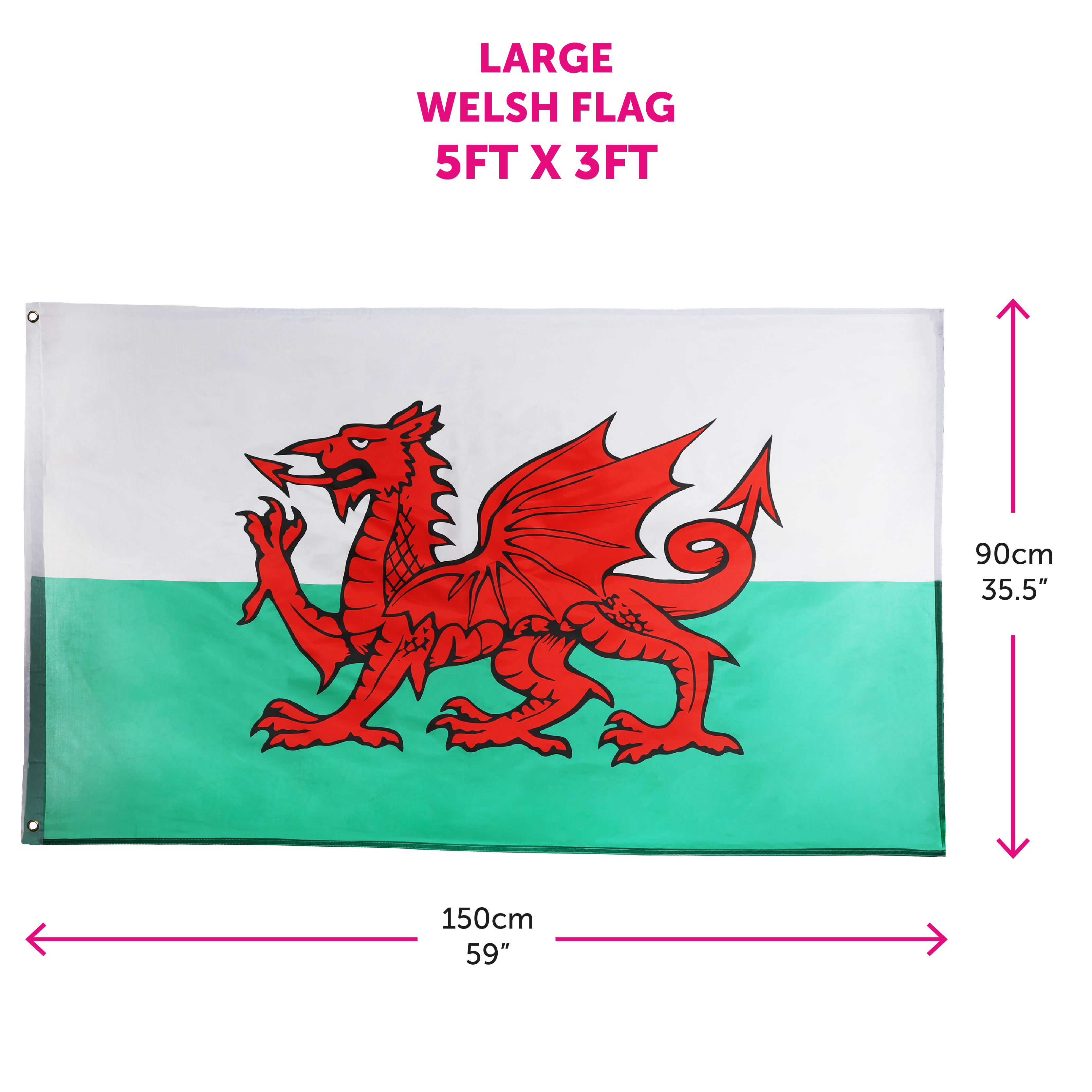 BUNTING & FLAG MEASUREMENTS: The Welsh Flag Bunting measures a full length of 33ft/10m (20 Flags), with each of the Flags measuring 21.5cm x 14cm (8.5" x 5"), and the Large Welsh Flag measures 5ft x 3ft (150cm x 90cm) - the perfect sized Flags to show support for your Country!