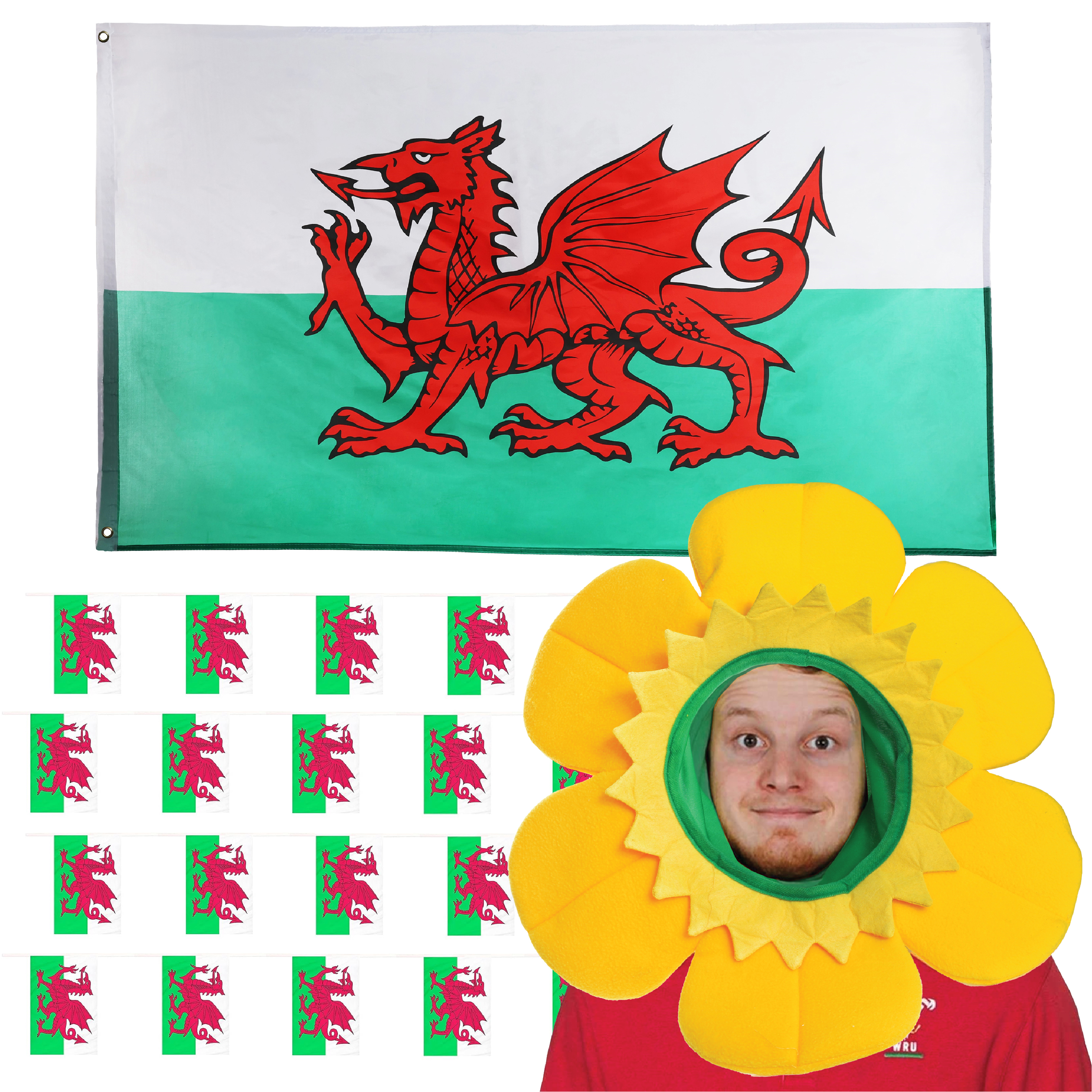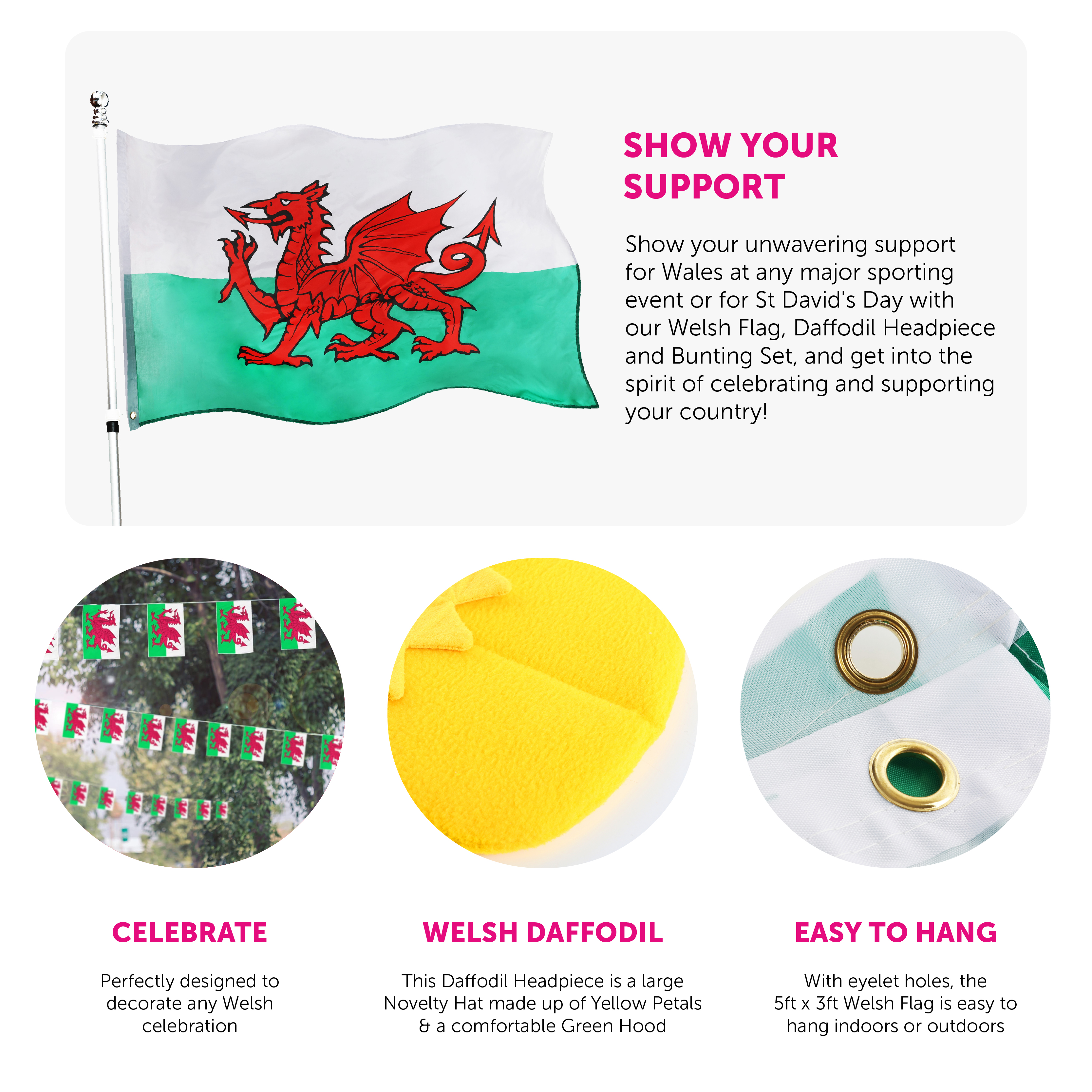 5FT X 3FT WELSH FLAG, DAFFODIL HEADPIECE & BUNTING SET: Show your unwavering support for Wales at any major sporting event or for St David's Day with our Welsh Flag, Daffodil Headpiece and Bunting Set, and get into the spirit of celebrating and supporting your country!