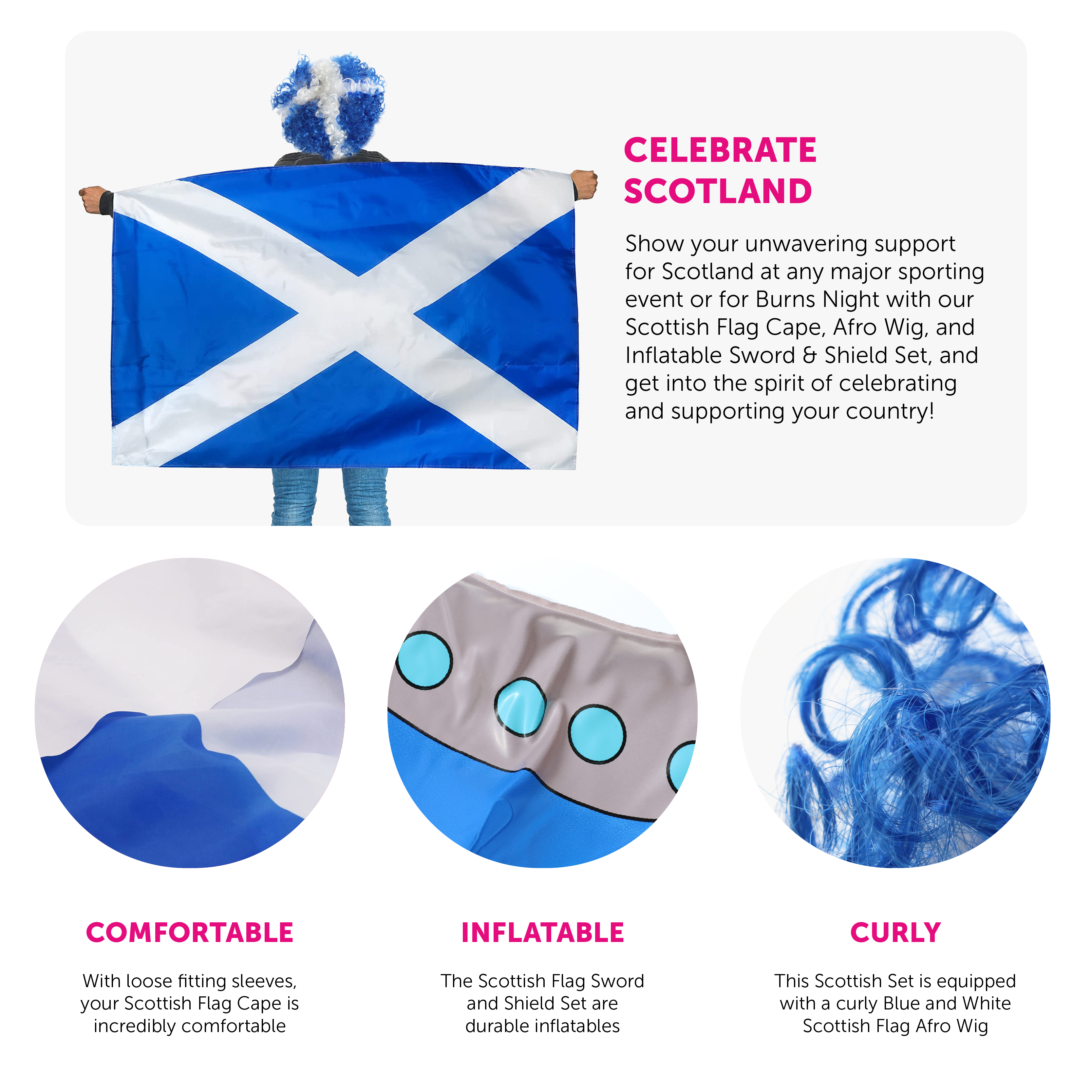 SCOTTISH FLAG CAPE, AFRO WIG & INFLATABLE SWORD AND SHIELD SET: Show your unwavering support for Scotland at any major sporting event or for Burns Night with our Scottish Flag Cape, Afro Wig, and Inflatable Sword & Shield Set, and get into the spirit of celebrating and supporting your country!
