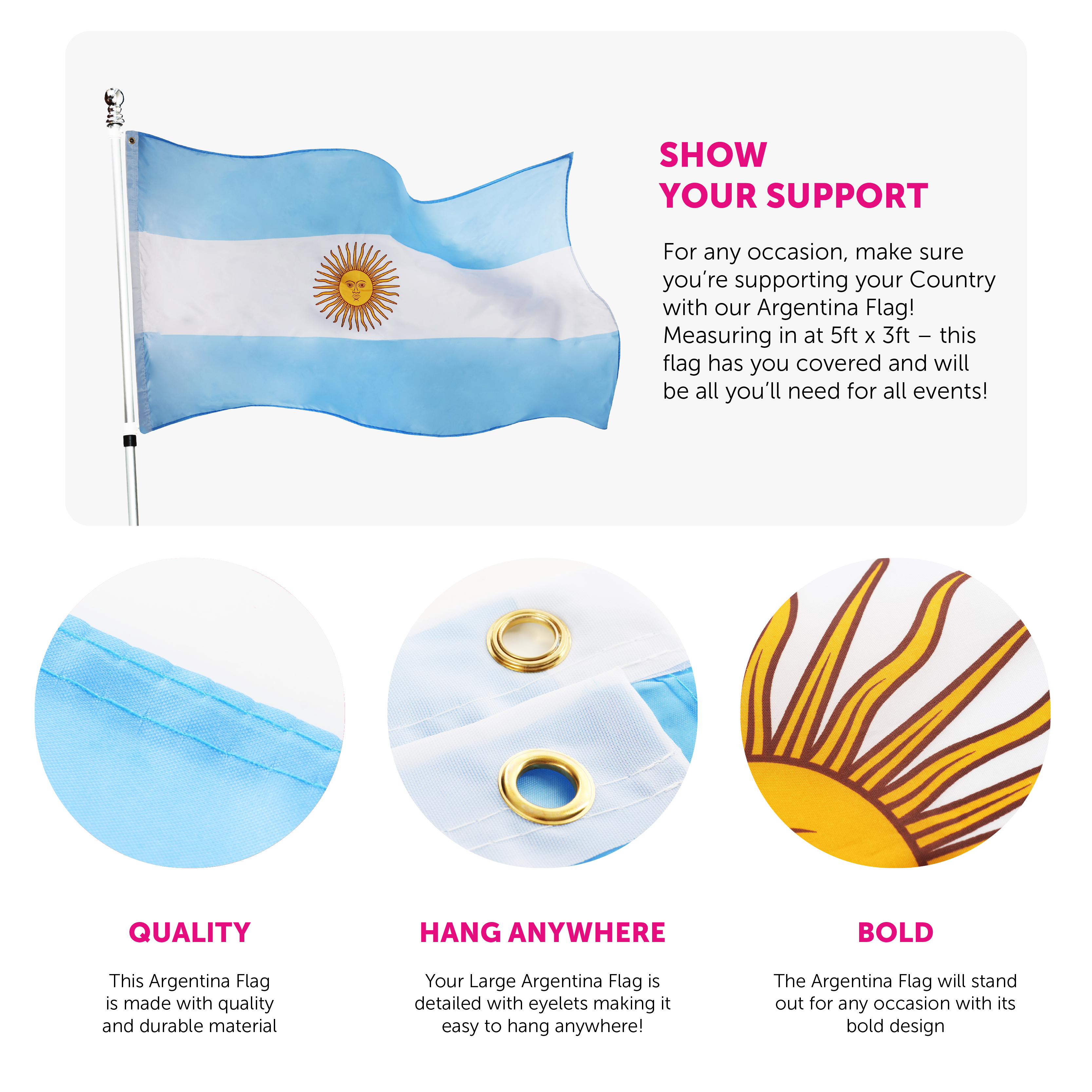 PERFECT FOR ANY ARGENTINE EVENT: For any event or occasion, make sure you're picking up a 5ft x 3ft Argentina Flag for a day of support and celebration alongside family and friends!