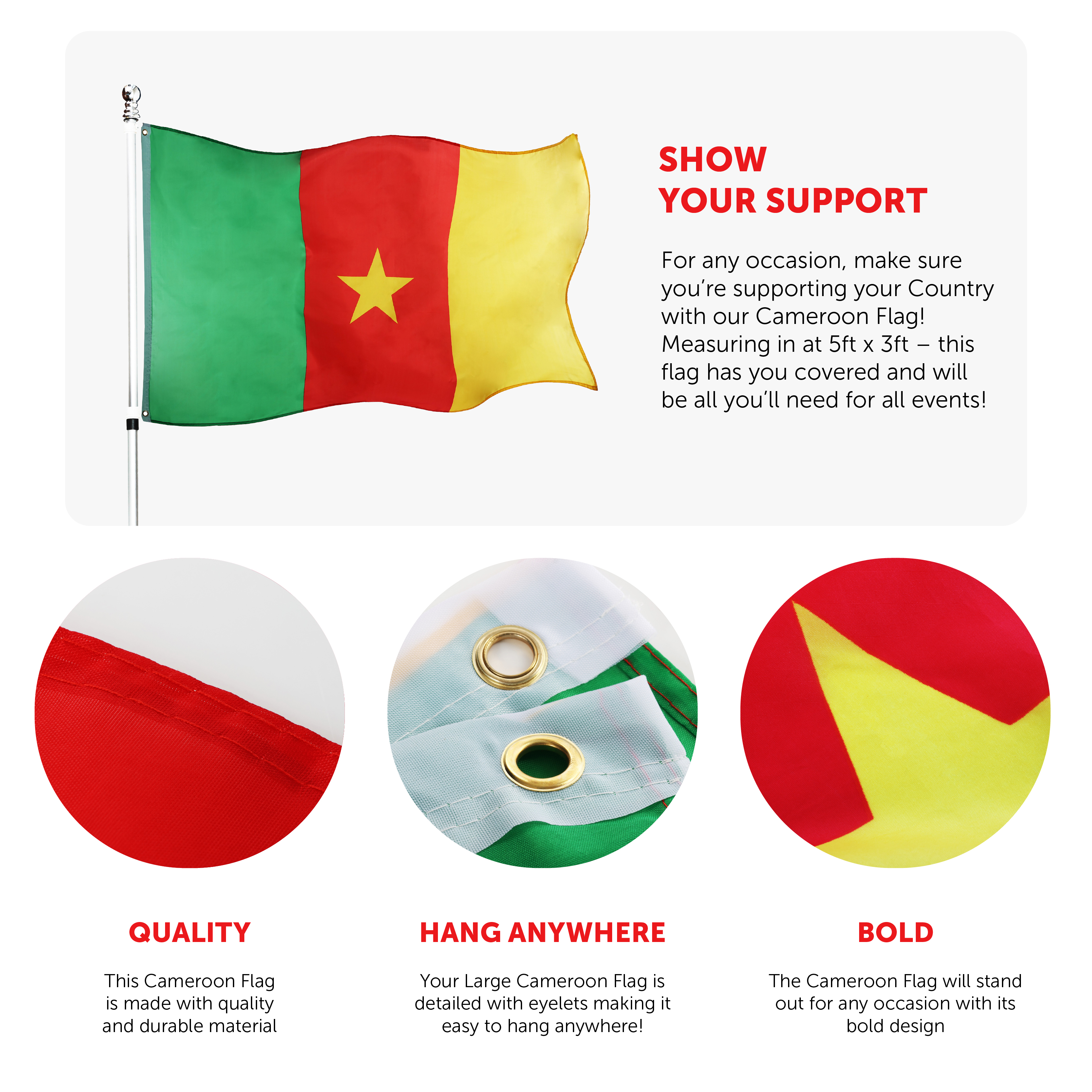 VERSATILE DESIGN: Our reusable and lightweight Cameroon Flags are made from a strong fabric with 2 eyelets that are perfect for hanging from a Flagpole, across windows, and any area!