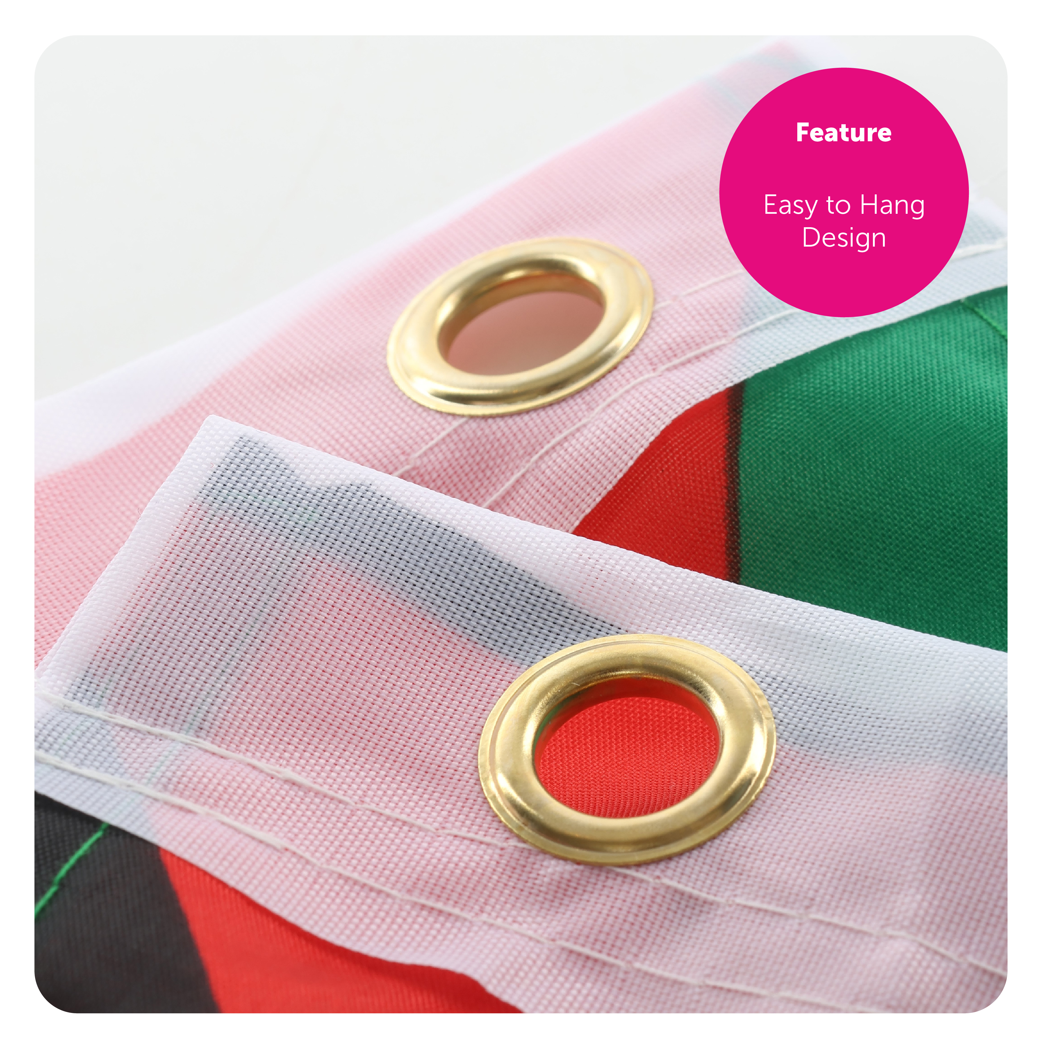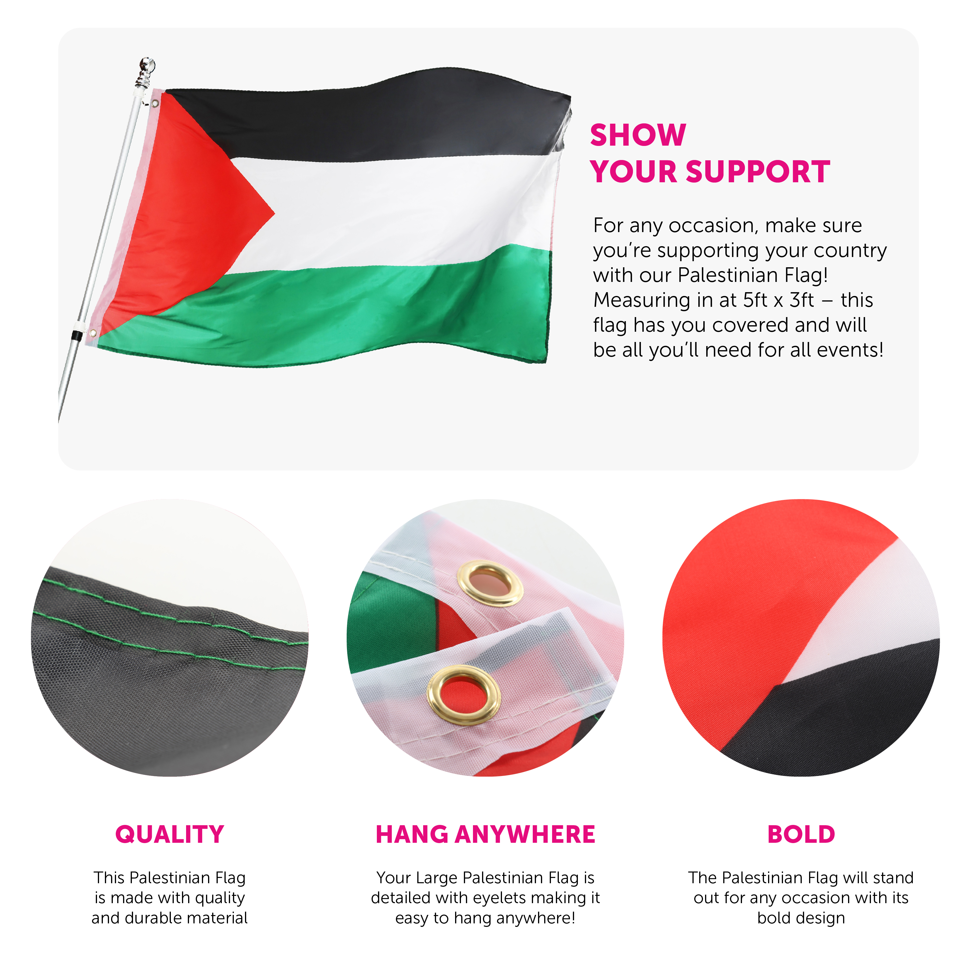 HIGH QUALITY FLAG: This 5ft x 3ft Palestinian Flag is perfect for any events, with its durability being perfect for most Weathers, it is extremely easy to dry clean, this Palestine Flag is perfect for indoor and outdoor celebrations!