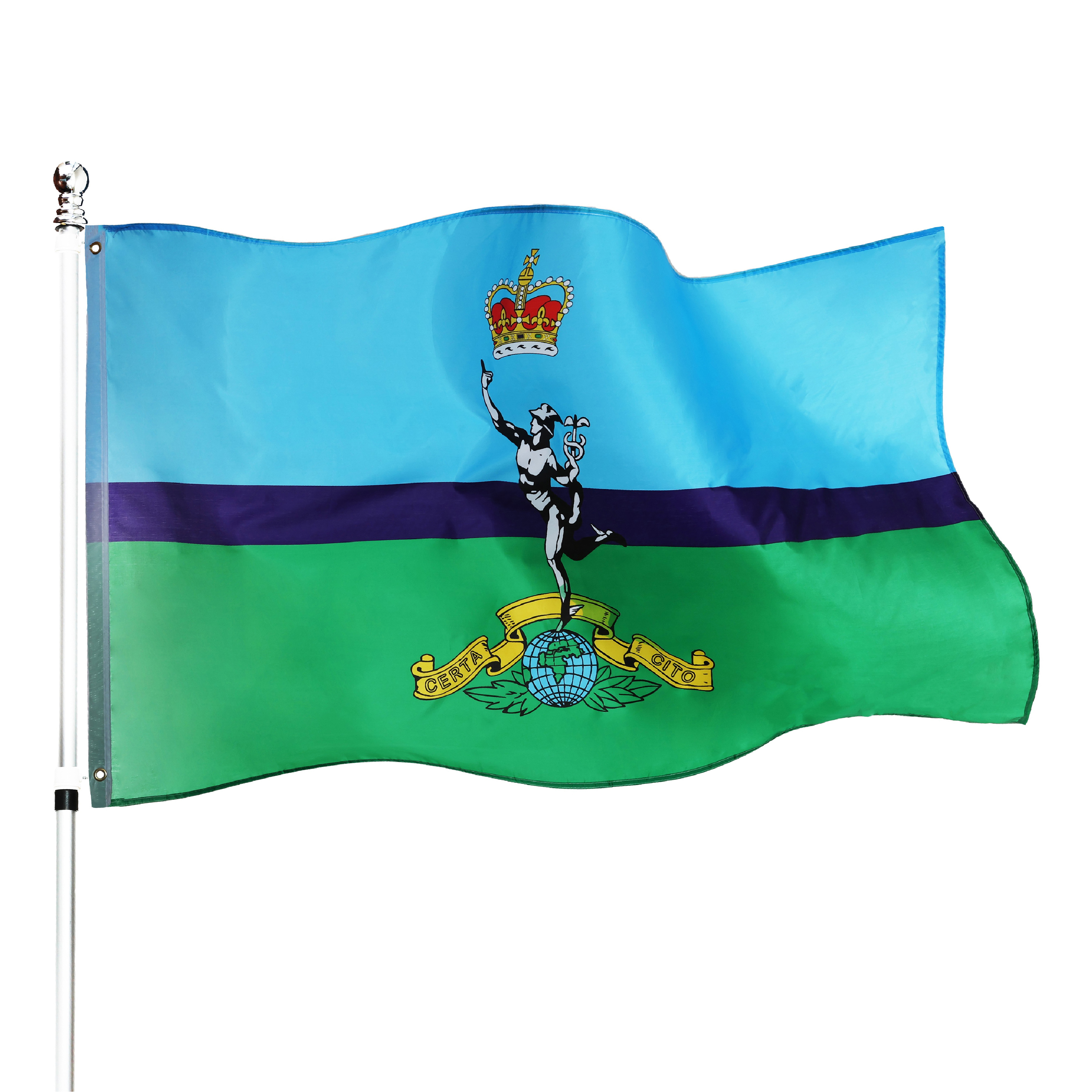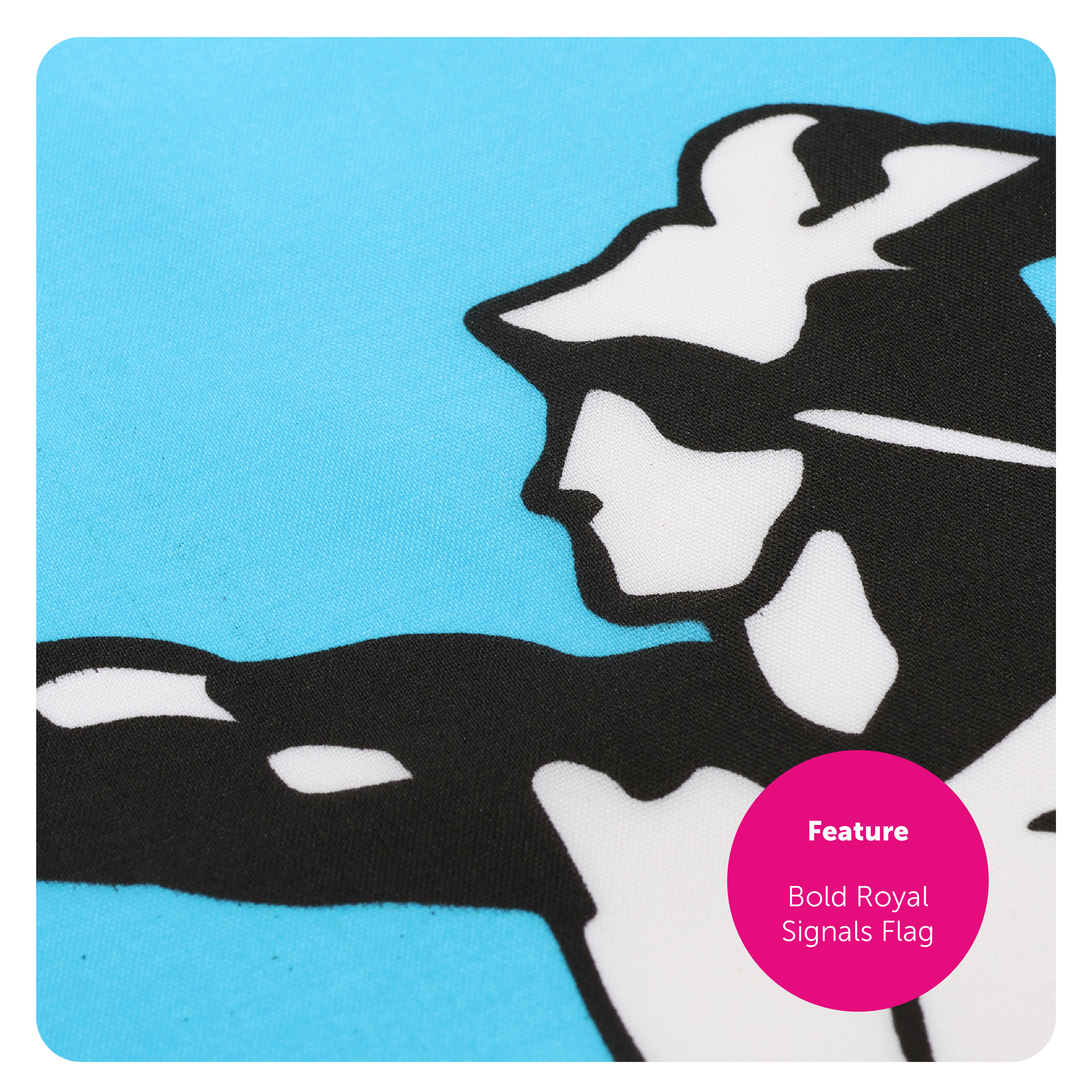 FLAG DETAILS: This Royal Signals Flag has a vibrant design with a Green and Blue background colour with a Dark Blue horizontal stripe through the middle, and detailed with the Royal Signals Emblem in the centre, the Flag measures 5ft (152cm/60") in Width and 3ft (91cm/36") in Height, you'll have the perfect flag accessory to fly high for any event!