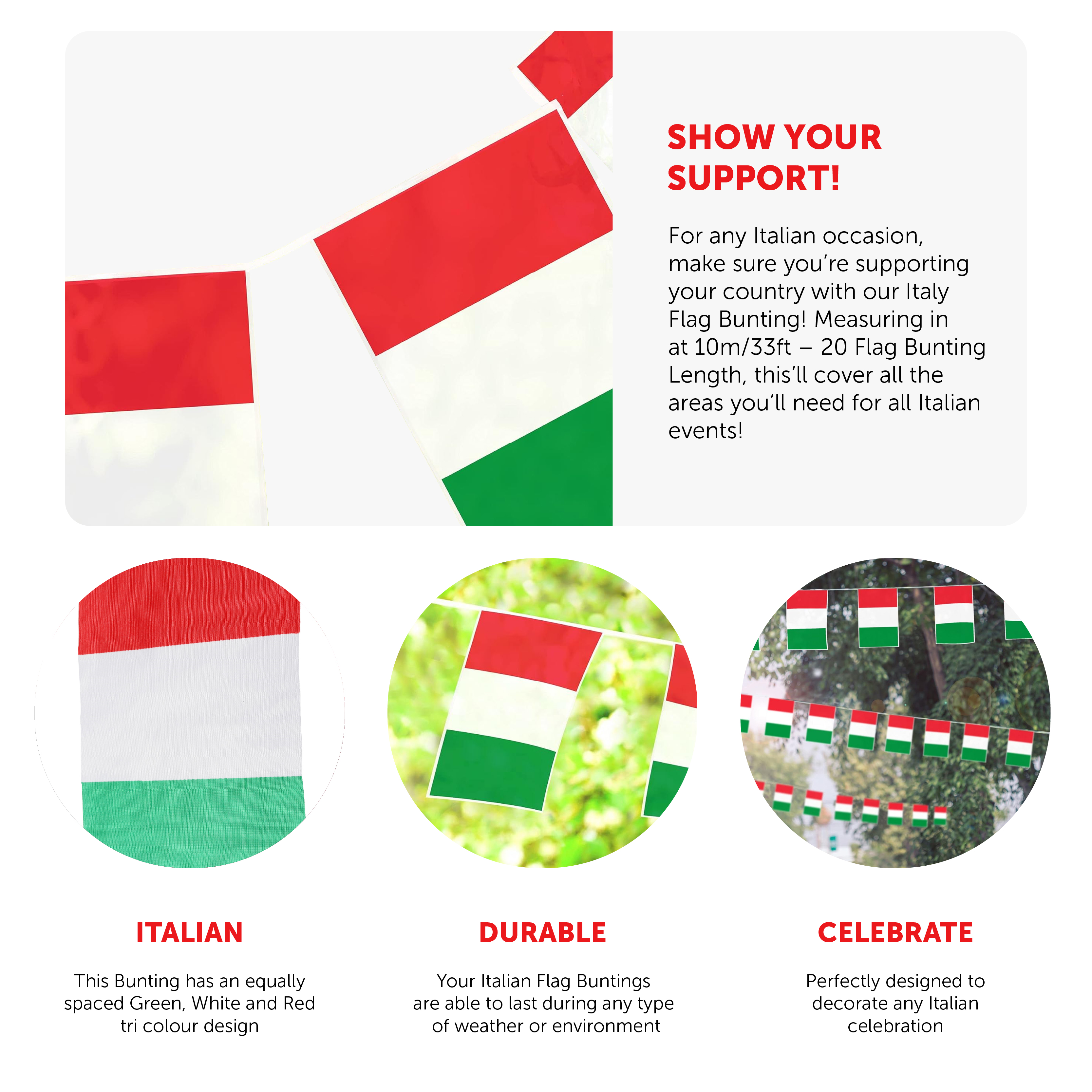 ITALIAN FLAG BUNTING: For any Italian occasion, make sure you’re supporting your country with our Italy Flag Bunting! Measuring in at 10m/33ft – 20 Flag Bunting Length, this’ll cover all the areas you’ll need for all Italian events!
