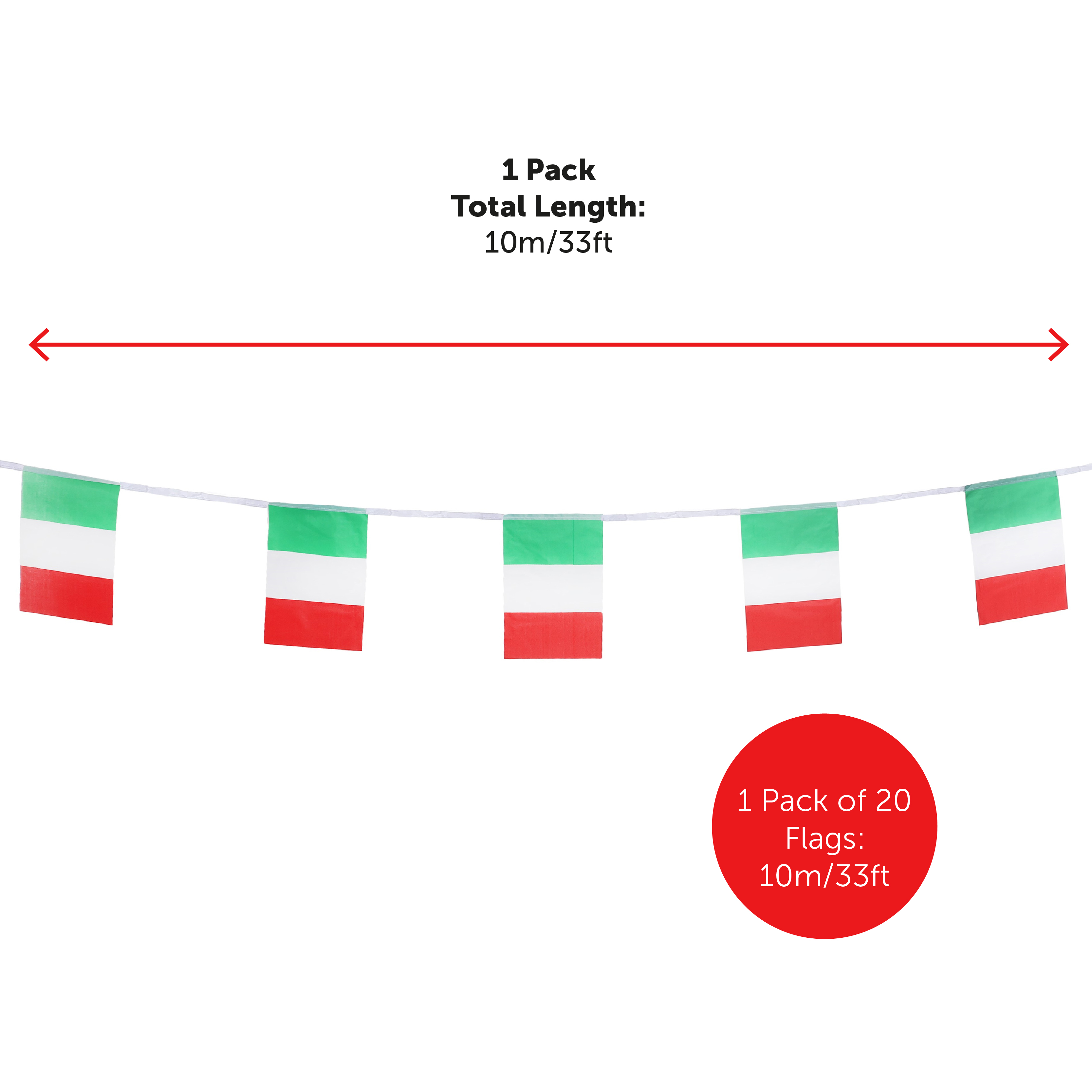 AVAILABLE IN MULTIPLE PACKS: If one isn’t enough for your Italian event, then look no further than our Packs of 20 Flags (33ft/10m), Packs of 60 Flags (99ft/30m), Packs of 120 Flags (198ft/60m) and Packs of 240 Flags (396ft/120m)!