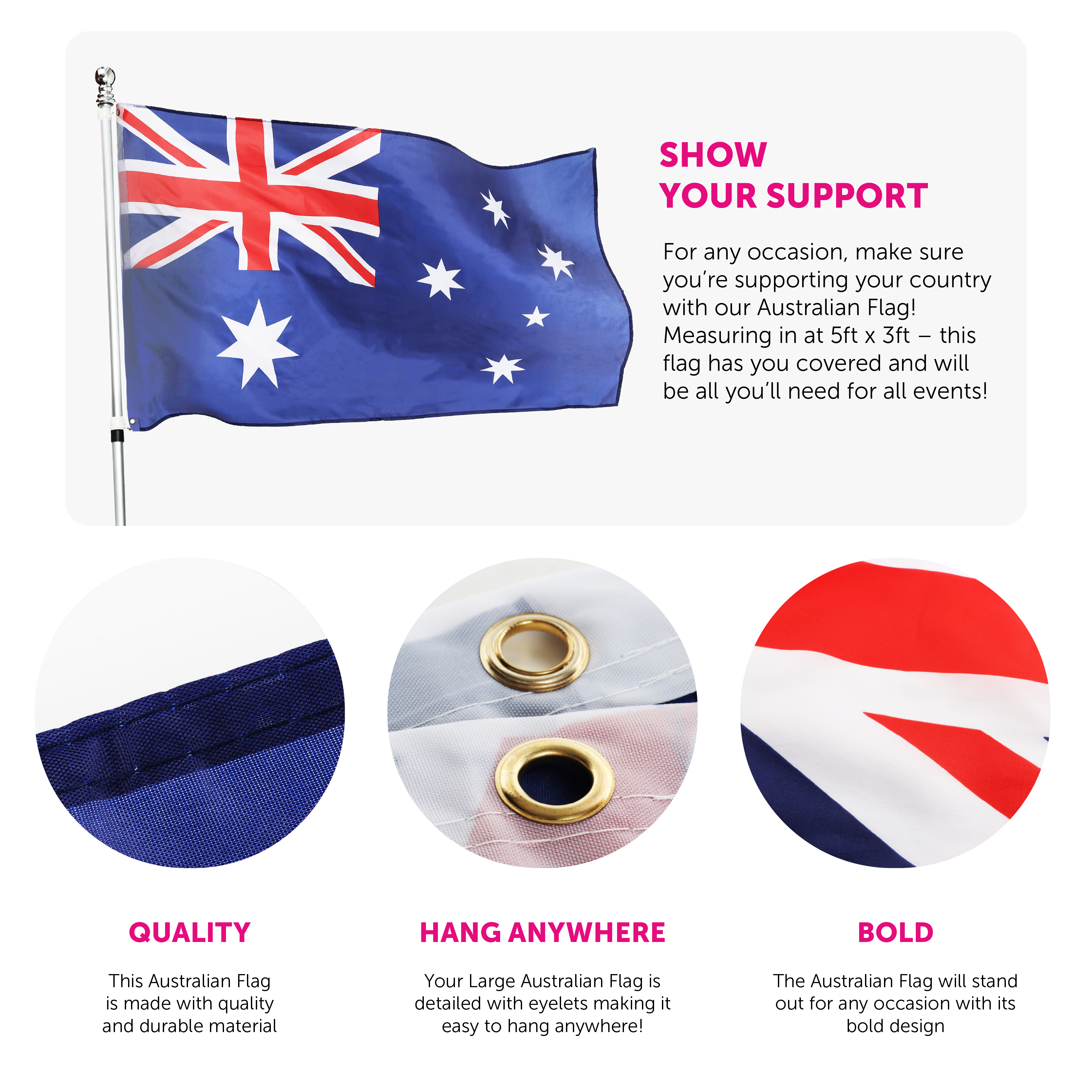 PERFECT FOR ANY AUSTRALIAN EVENT: For any Australian event or occasion, make sure you're picking up a 5ft x 3ft Australian Flag for a day of support and celebration alongside family and friends!