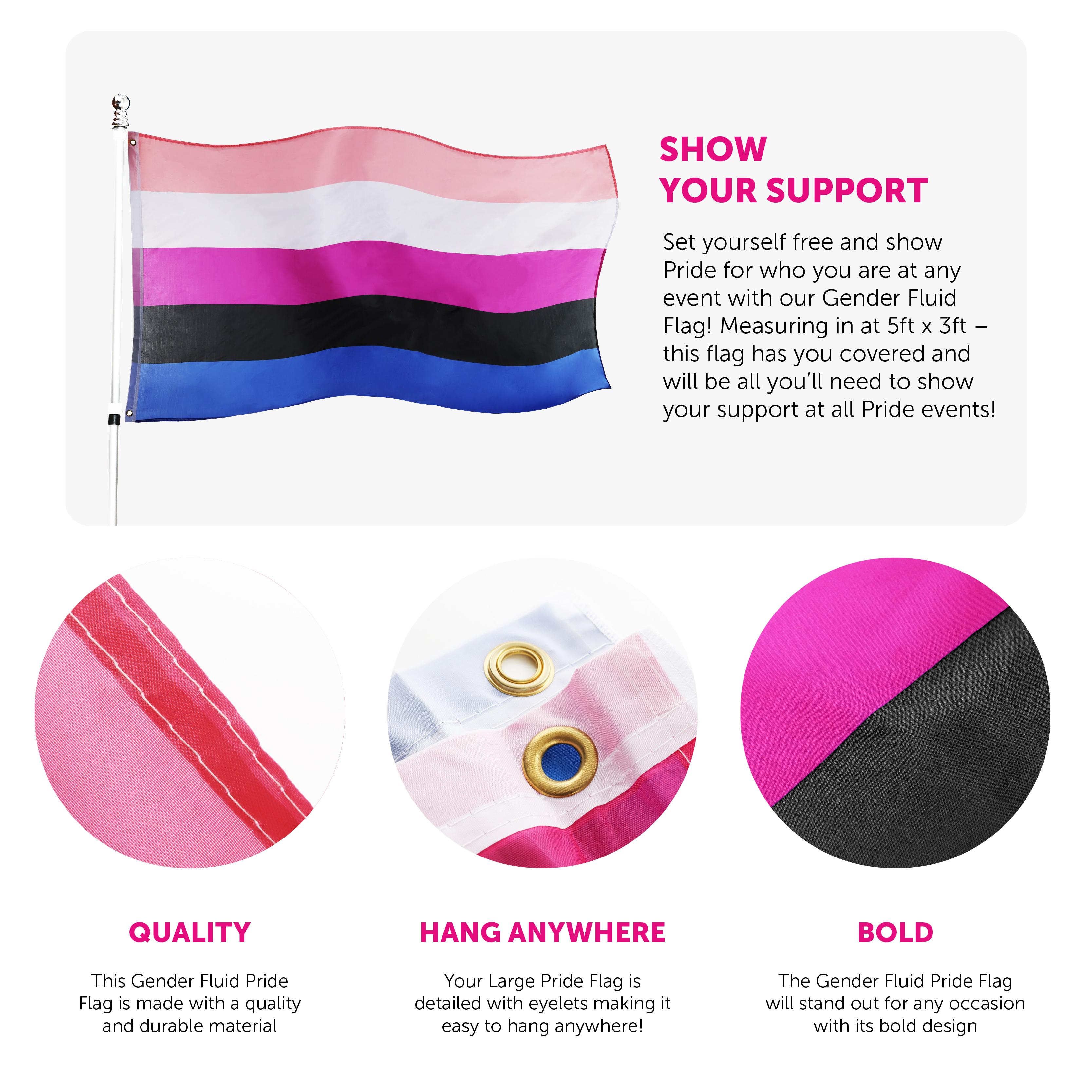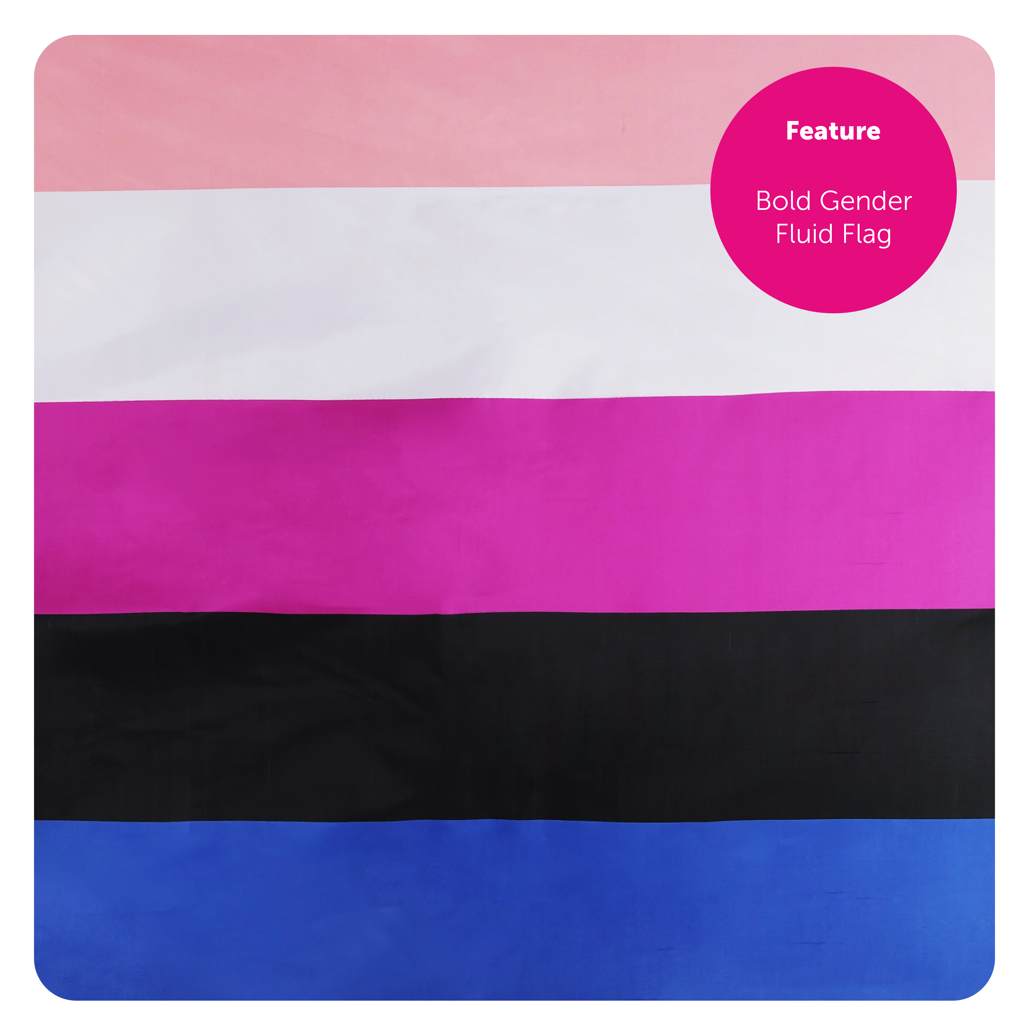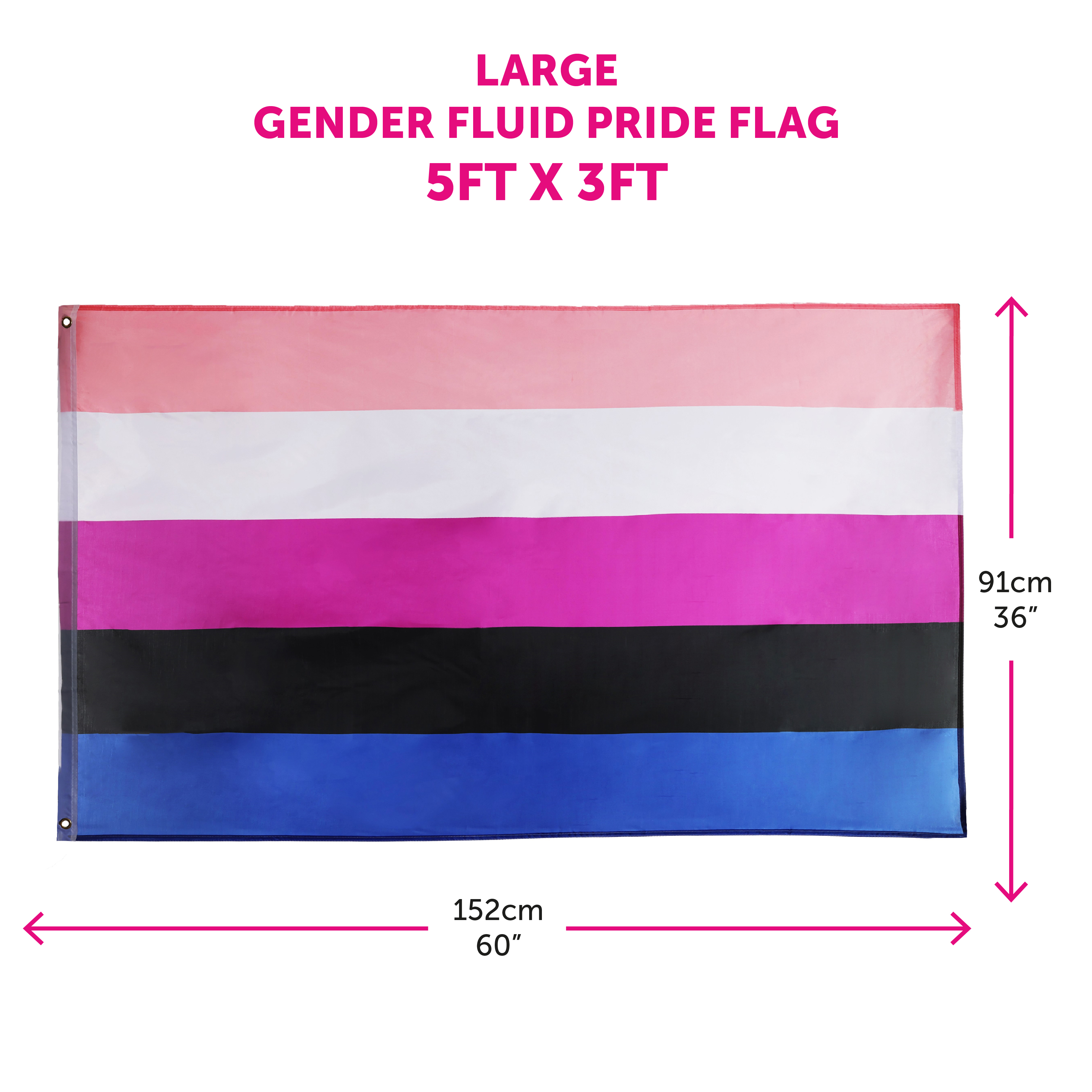 FLAG DETAILS: This Gender Fluid Flag has horizontal stripes of Baby Pink, White, Hot Pink, Black and Blue, the Flag measures 5ft (152cm/60") in Width and 3ft (91cm/36") in Height, you'll have the perfect flag accessory to fly high for any Pride event!